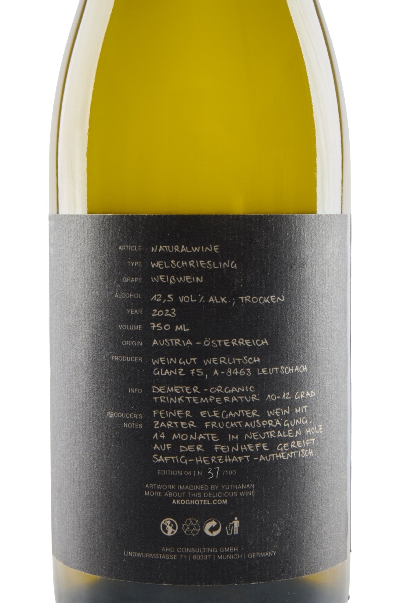 Werlitsch Welschriesling 2023 is a natural white wine with a juicy, hearty, and authentic profile. It underwent wild fermentation, full malolactic conversion, and was aged for 14 months on fine lees in neutral wooden barrels — unfiltered and untouched. Expect lively acidity, subtle citrus and herb notes, and a tactile minerality that captures the soul of Southern Styria.