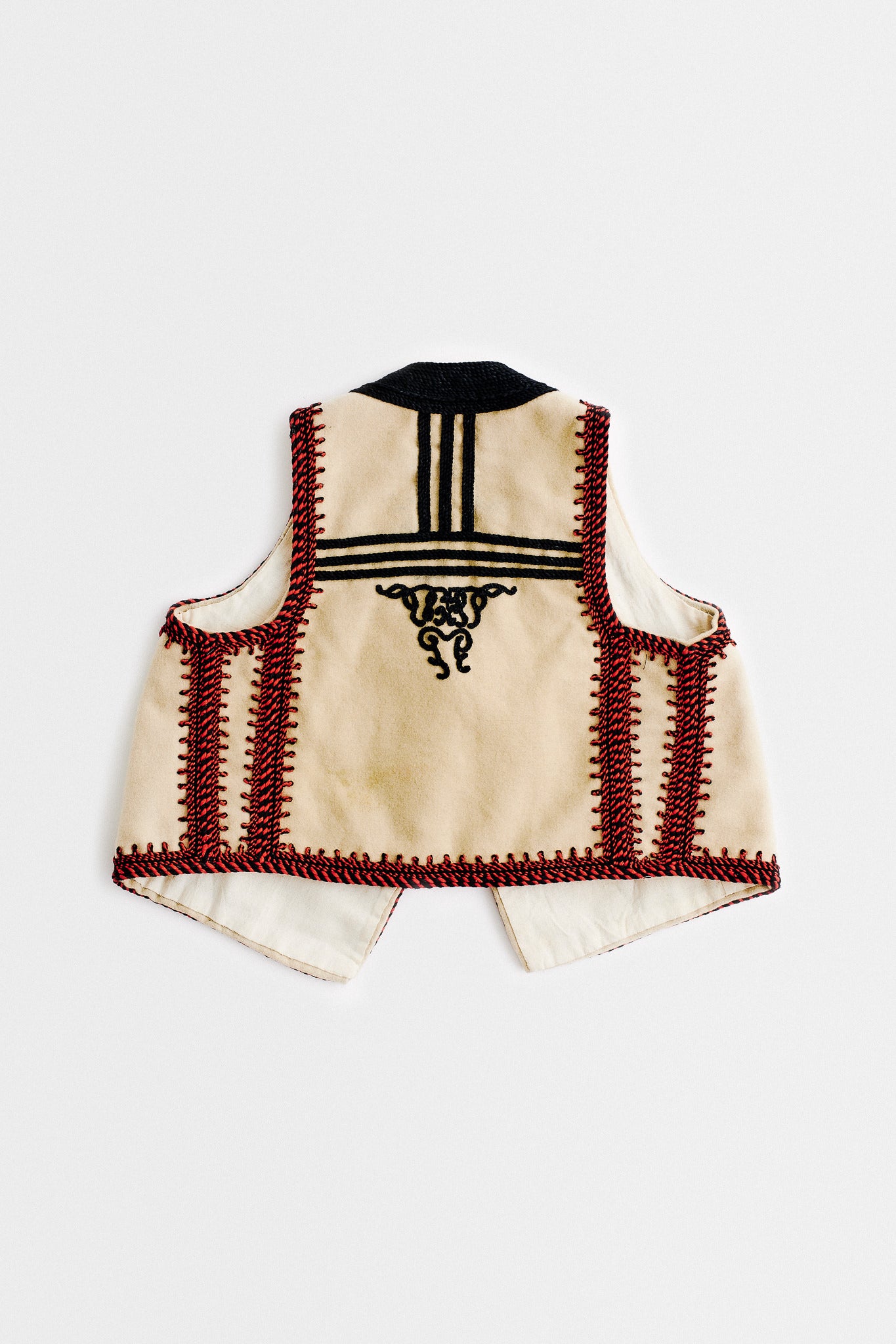 The embroidered vintage vest, a unique piece that encapsulates the rich cultural heritage of Albania and older than 70 years old. Crafted with meticulous attention to detail, with intricate embroidered patterns that are steeped in tradition and symbolism. Each stitch tells a story, reflecting the vibrant history and unique identity of the Albanian people and their traditional apparel.