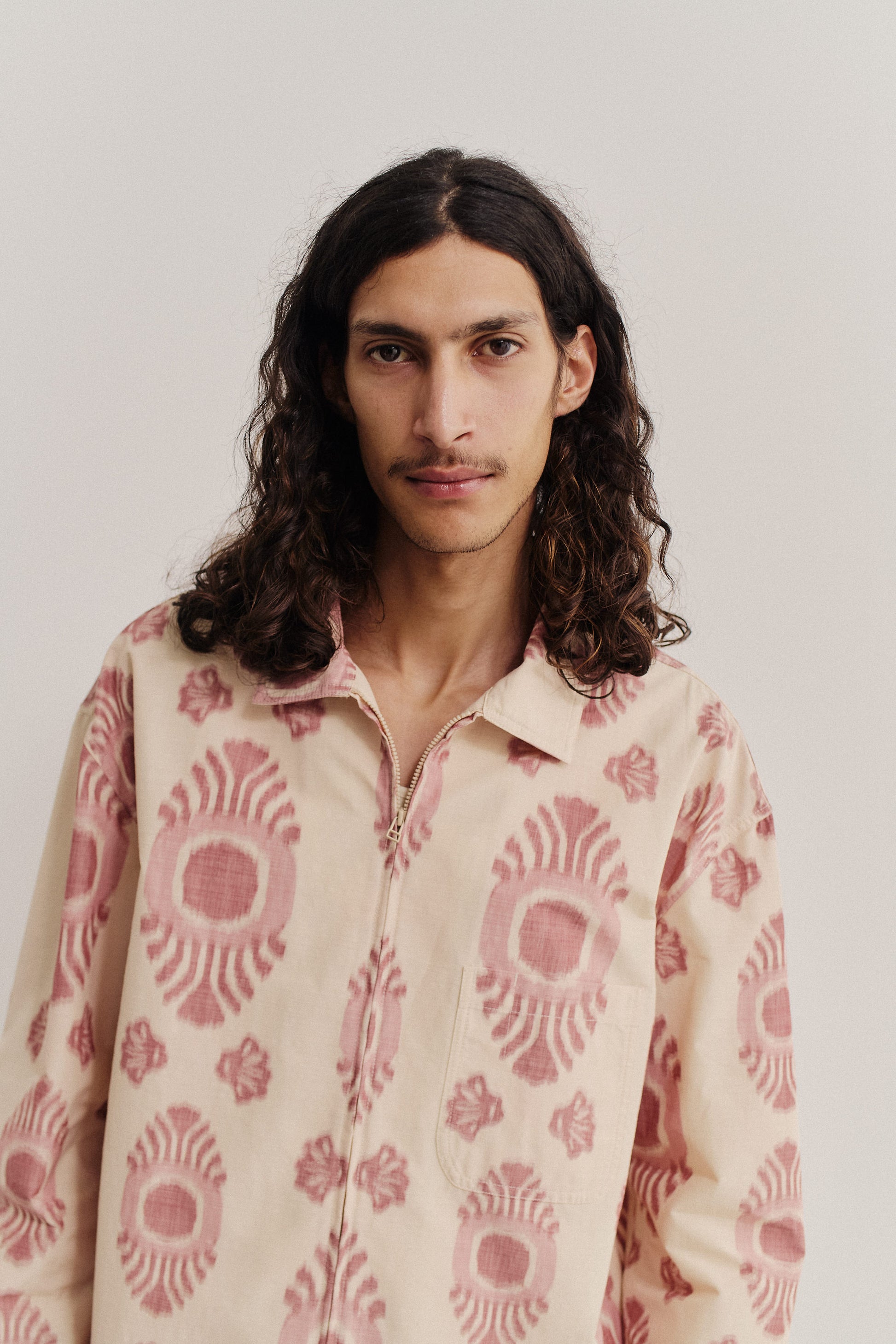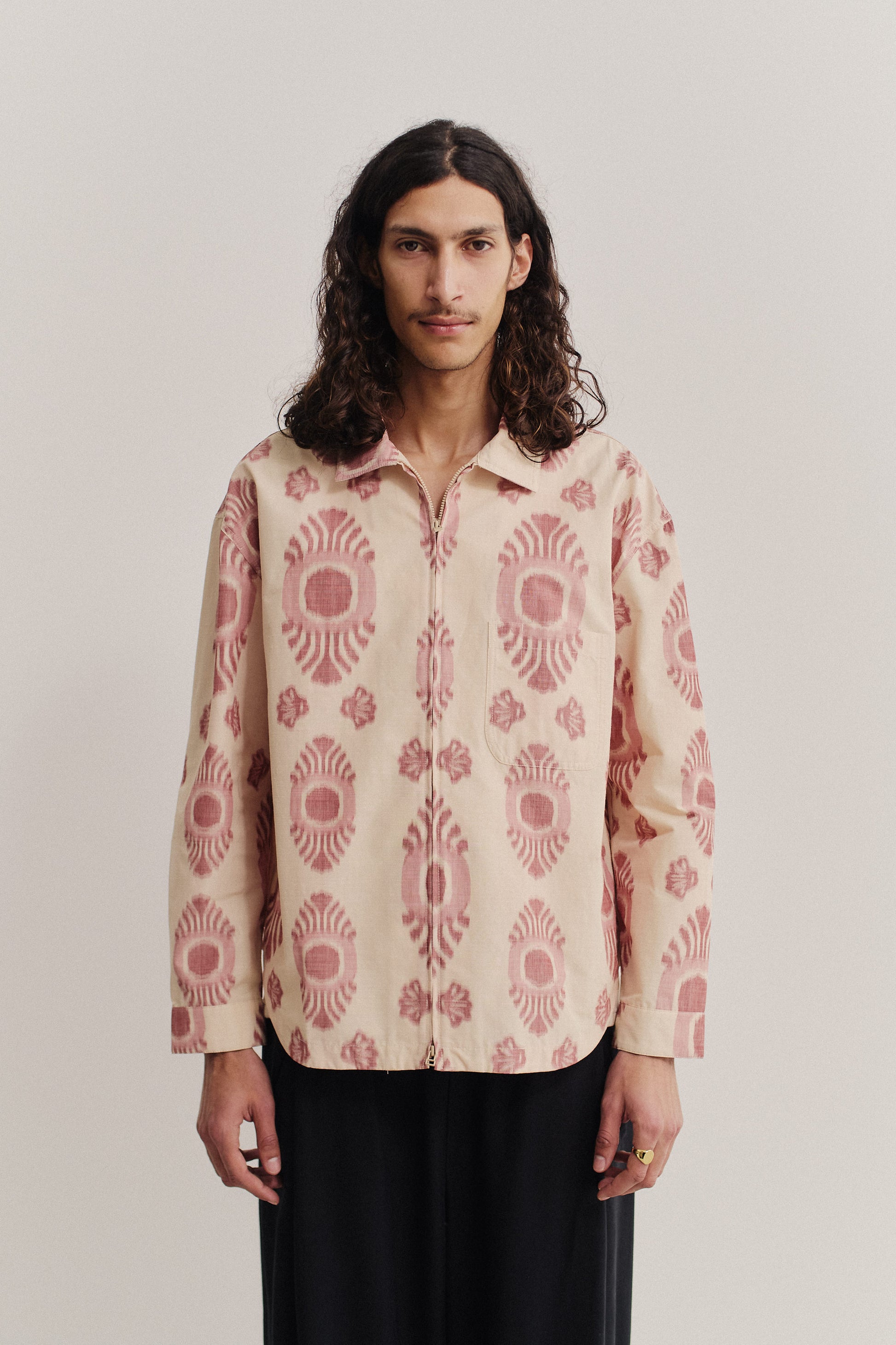 PRODUCT: The Alvaro Atelier Shirt is a loosely fitted overshirt, ideal for layering. It features an overcut shoulder, spread collar, two-way zipper, rounded hem, front patch pocket, and press-buttons at the adjustable cuffs.