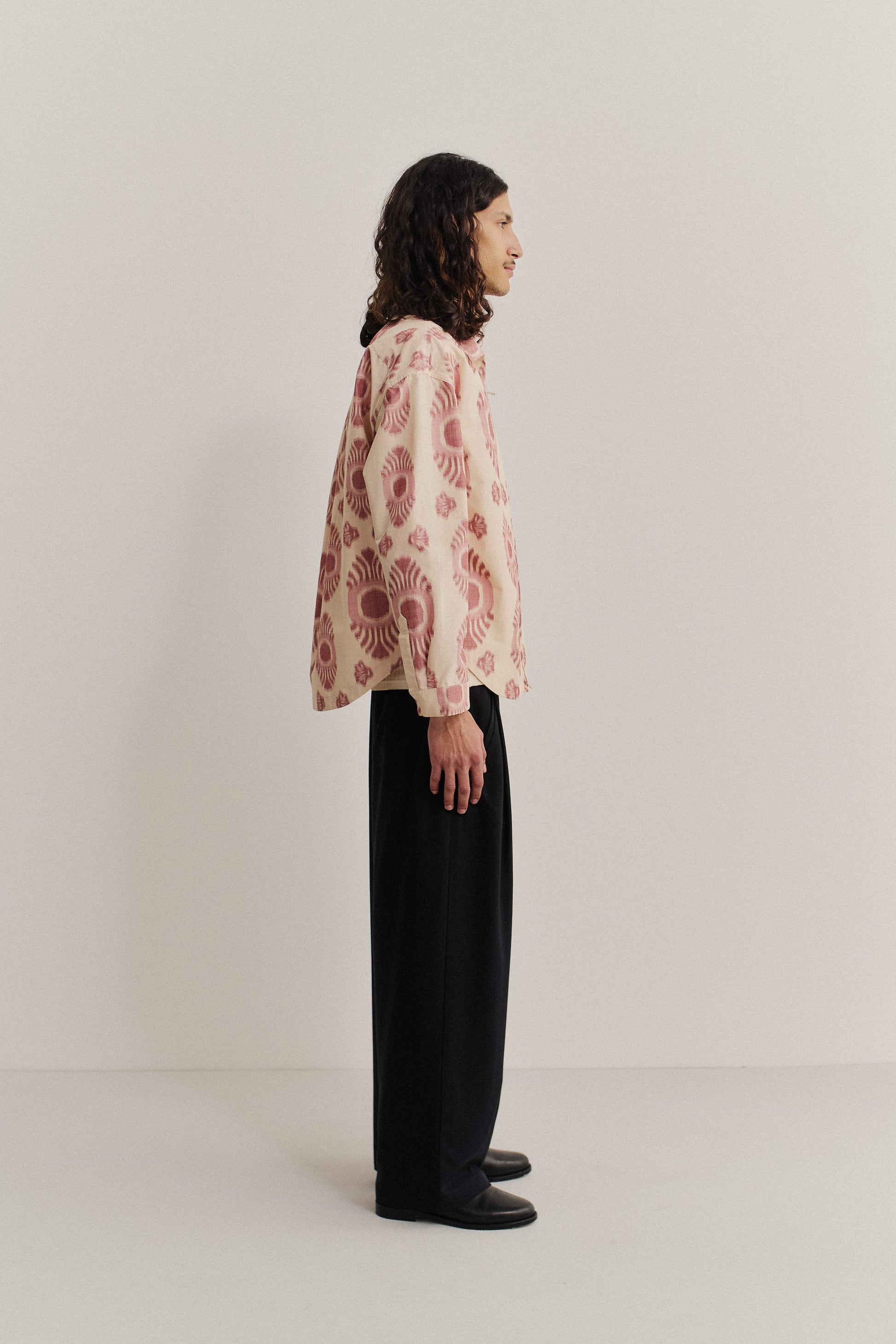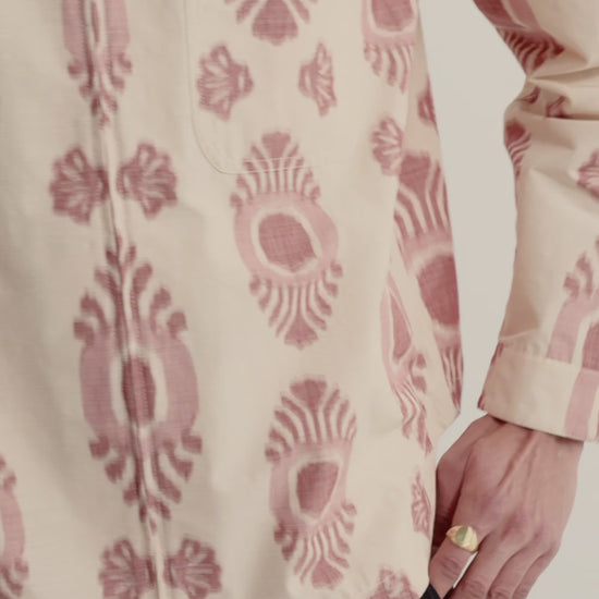 FABRIC: Lightweight woven fabric made from a cotton and recycled polyester blend, featuring a slightly sheer plain weave with an airy texture created by the printed warp yarns. Only the warp is printed, enhancing the lightness and depth of the material. The bold ikat-inspired motif in dusty rose tones on a soft ivory base has a feathered, hand-dyed look, giving it an artisanal feel. Designed in-house and made in Italy.