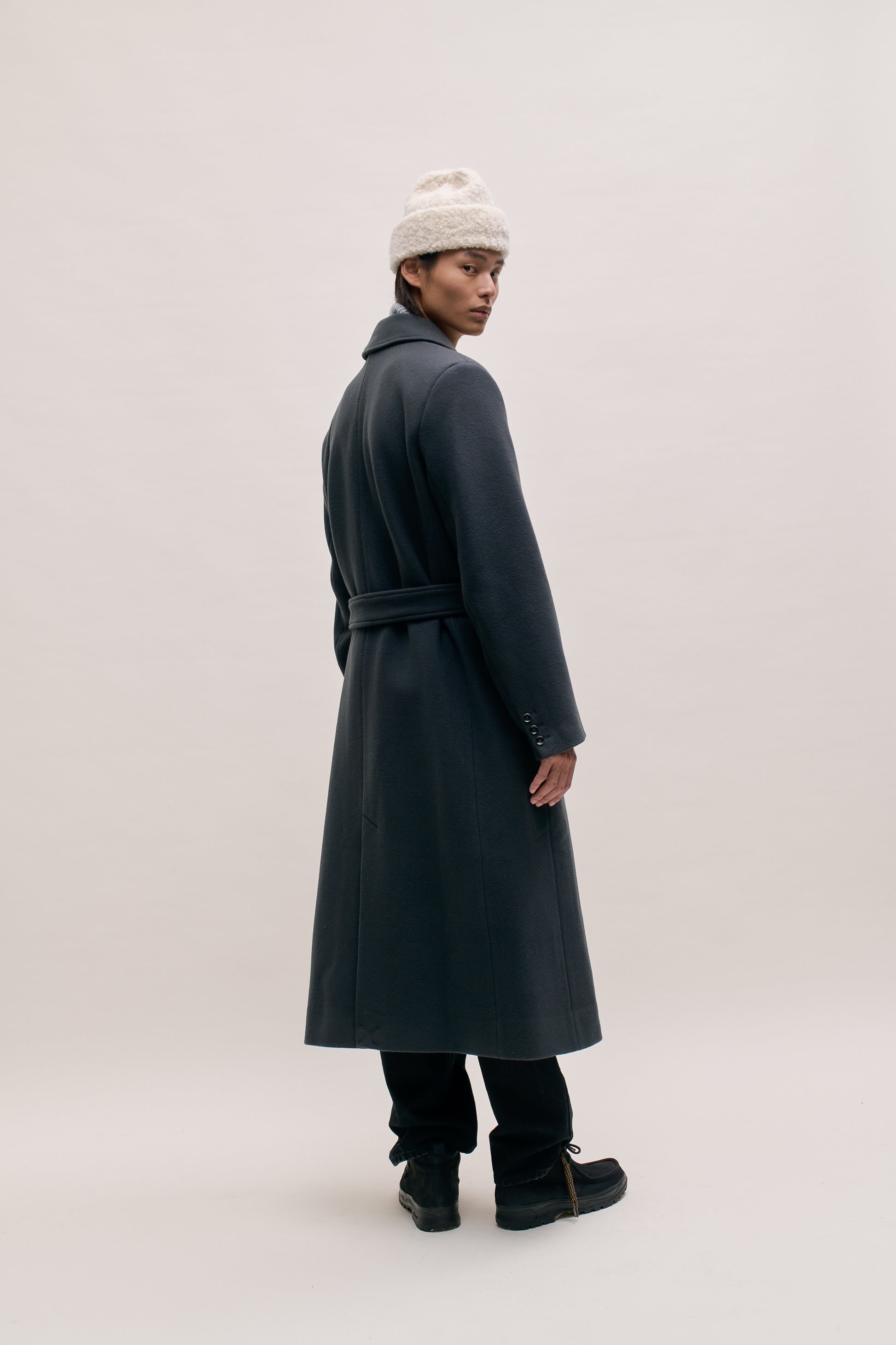 PRODUCT: This long, slightly a-lined, belted coat features broad shoulders, a bold, wide lapel and a slit at the back. Featuring two slanted welt pockets with flaps and an additional inner welt pocket.