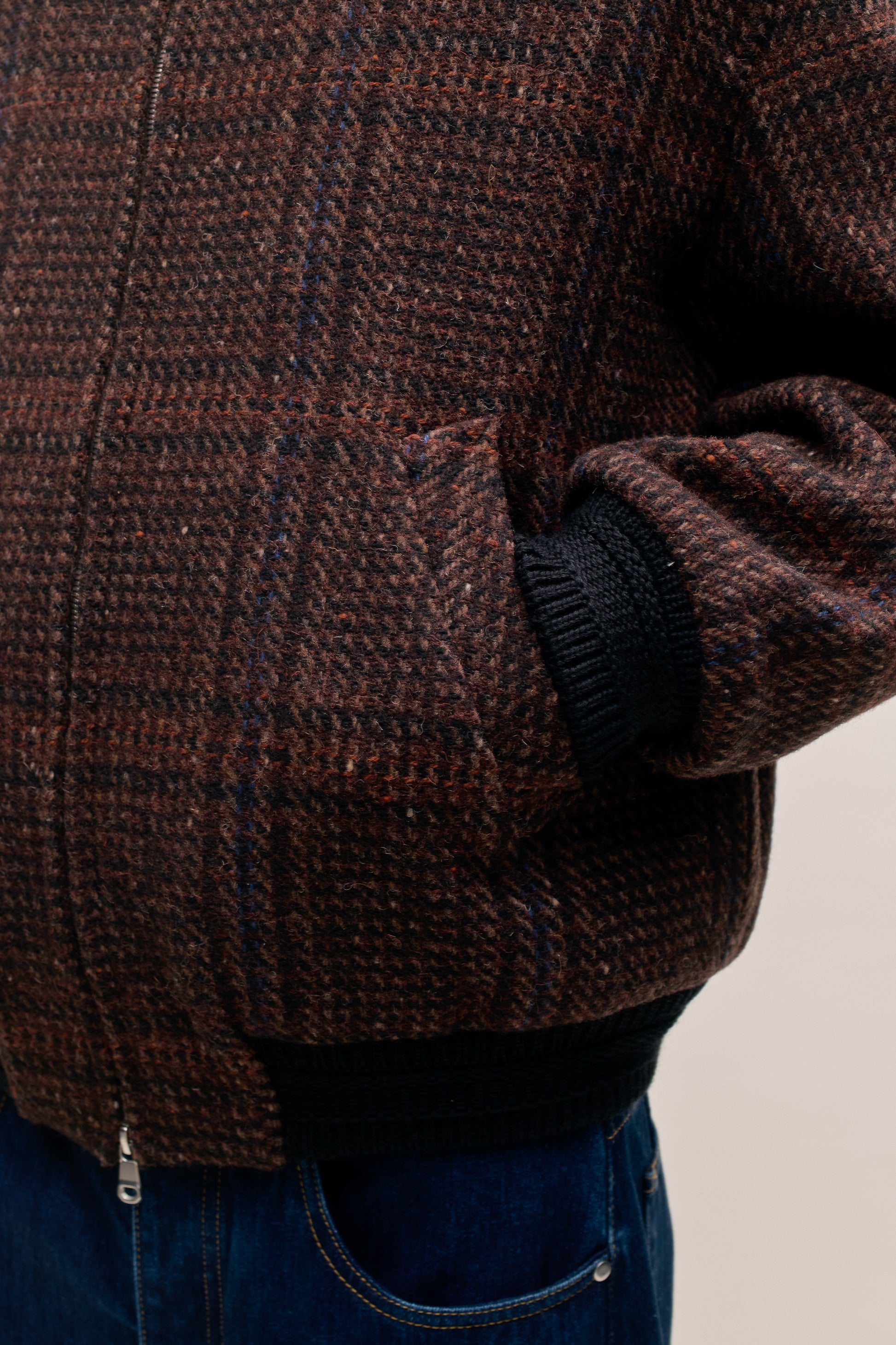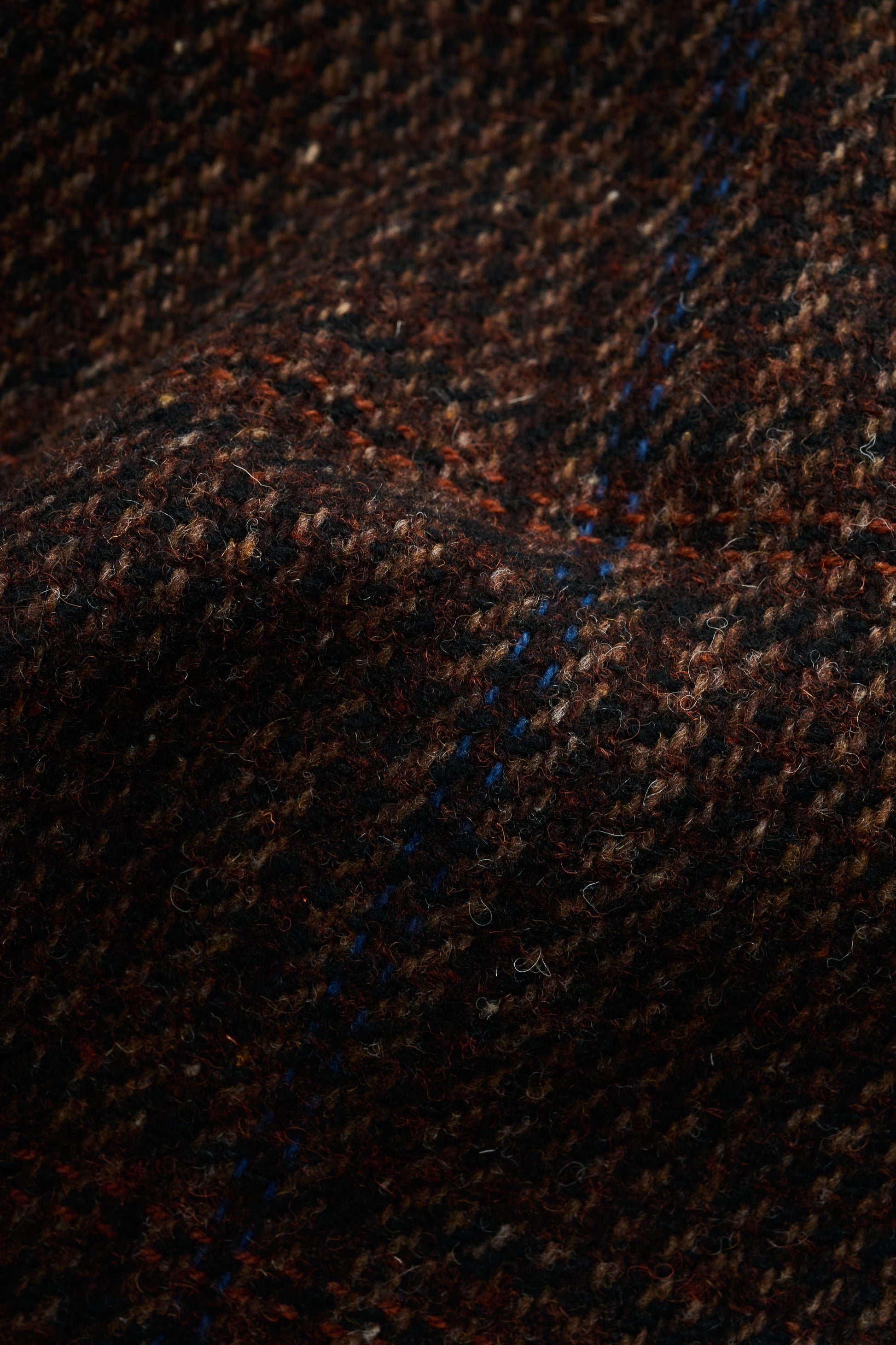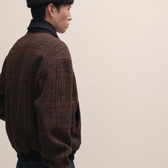 FABRIC: Loosely woven virgin wool tweed with a subtle check pattern in rich autumn hues, combining a soft hand feel with natural warmth and timeless seasonal appeal.