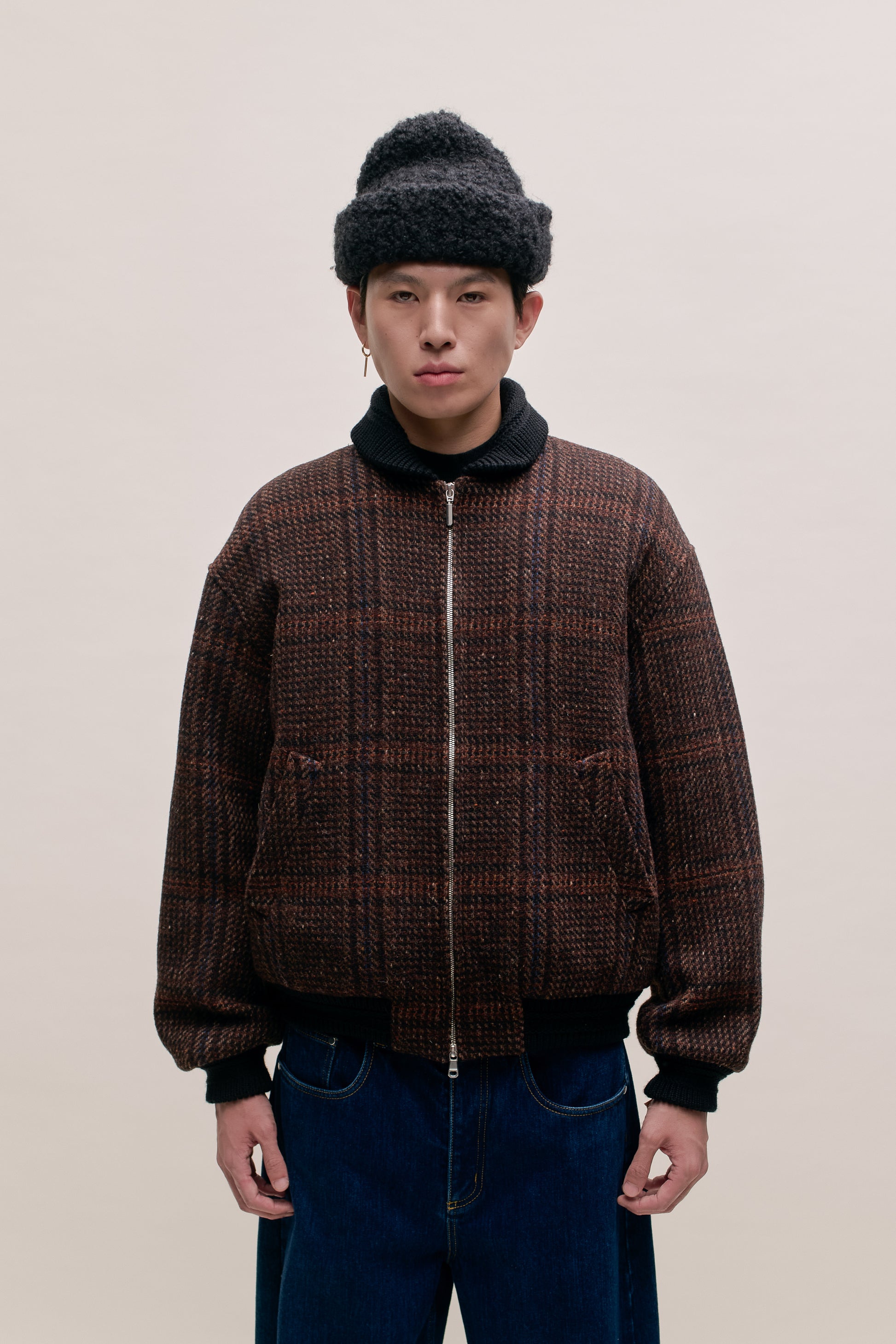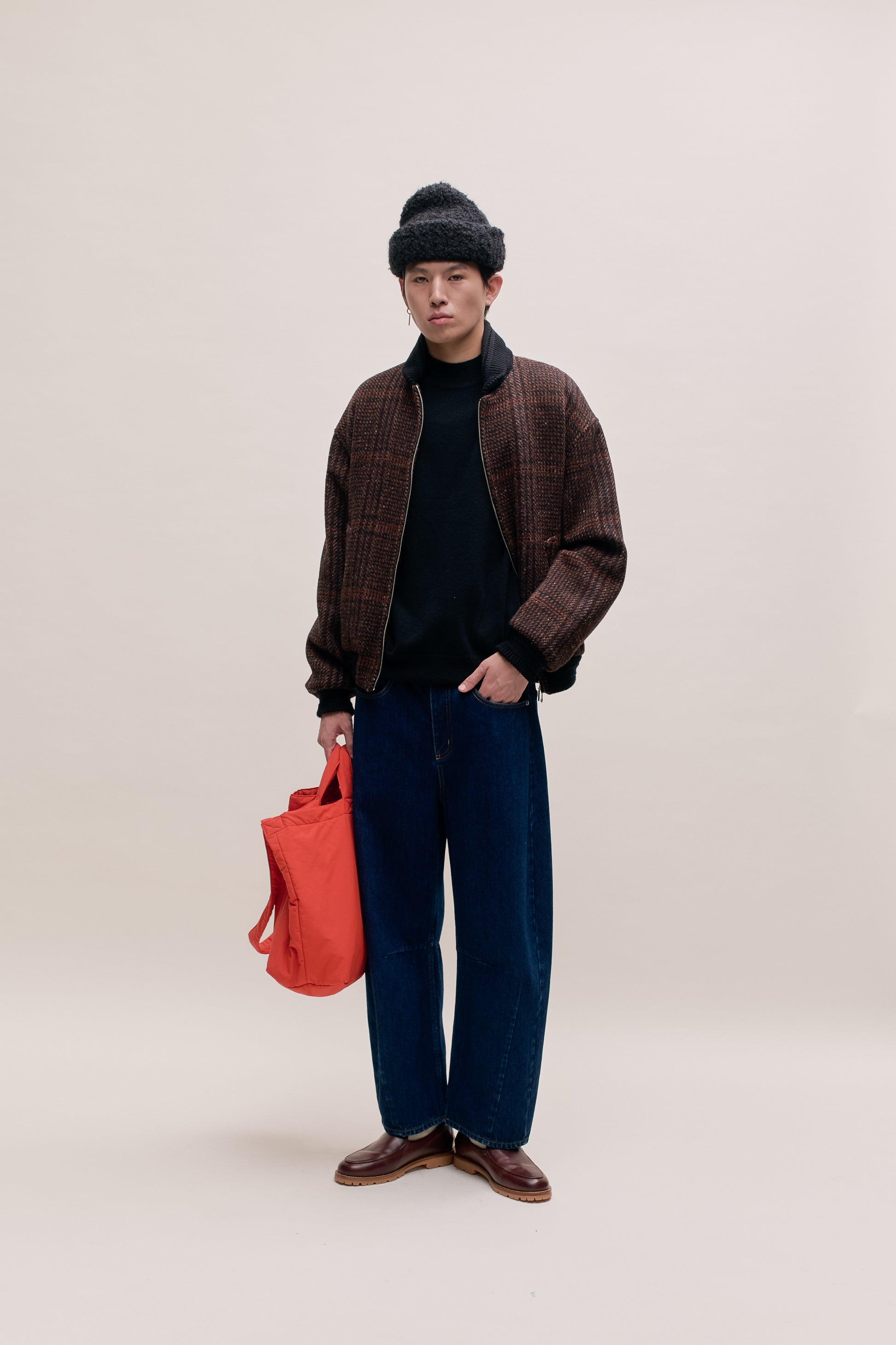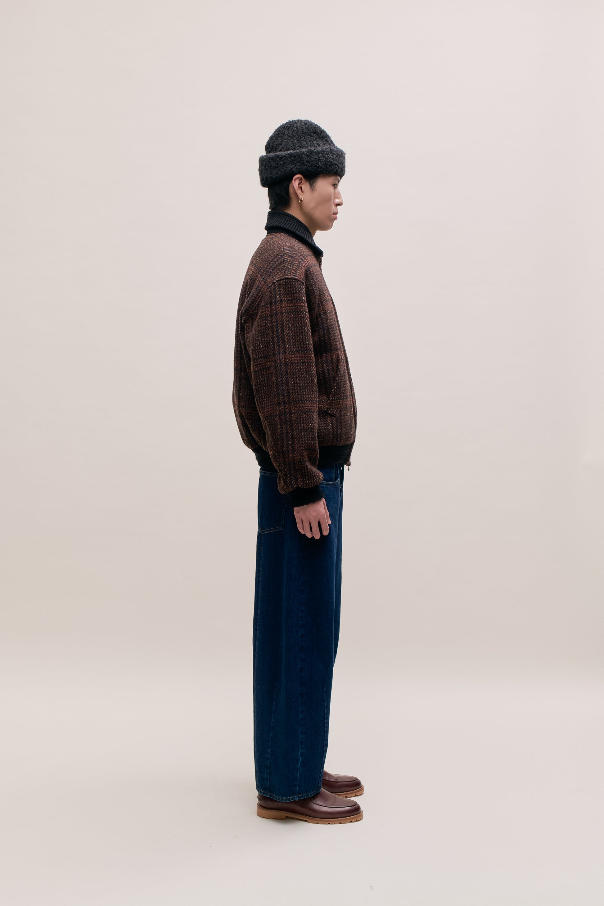 FABRIC: Loosely woven virgin wool tweed with a subtle check pattern in rich autumn hues, combining a soft hand feel with natural warmth and timeless seasonal appeal.