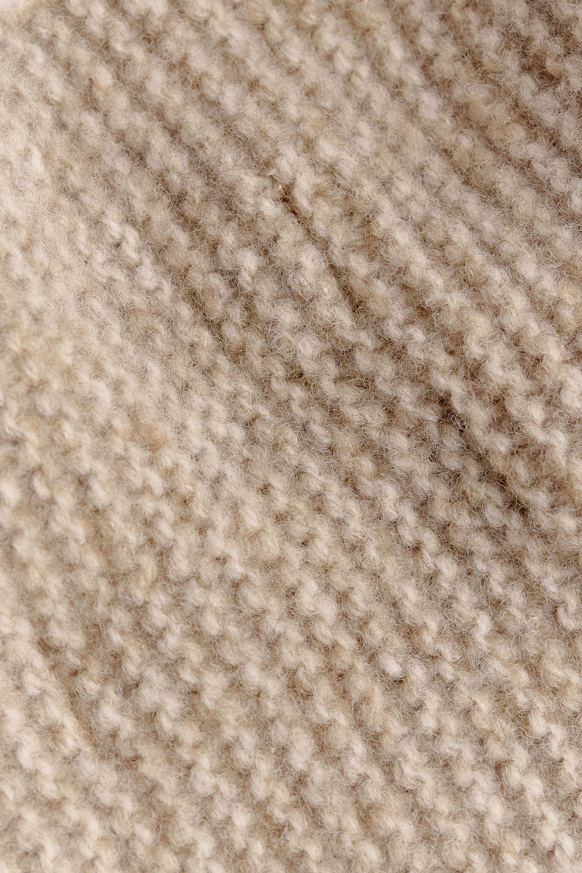 PRODUCT: Purl-stitch knitted balaclava hood, providing full coverage and a ribbed collar for a snug fit.