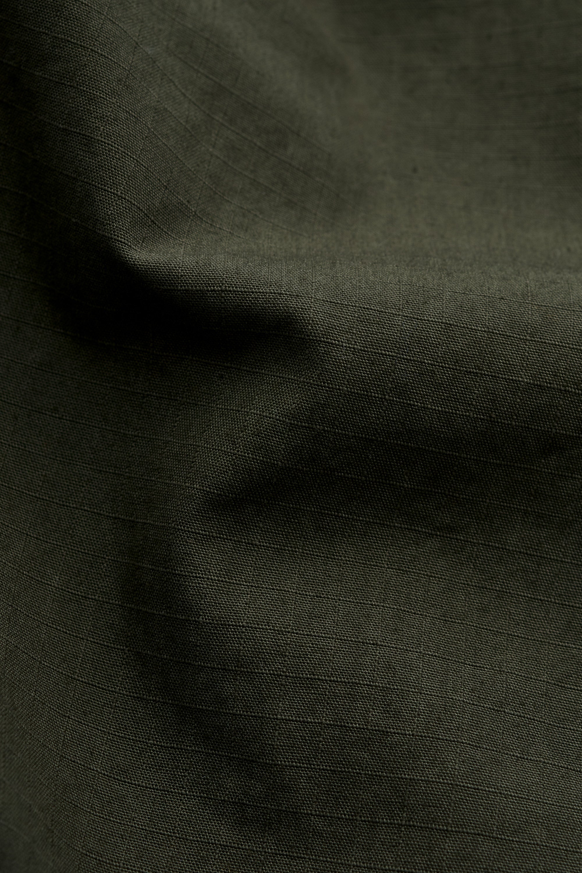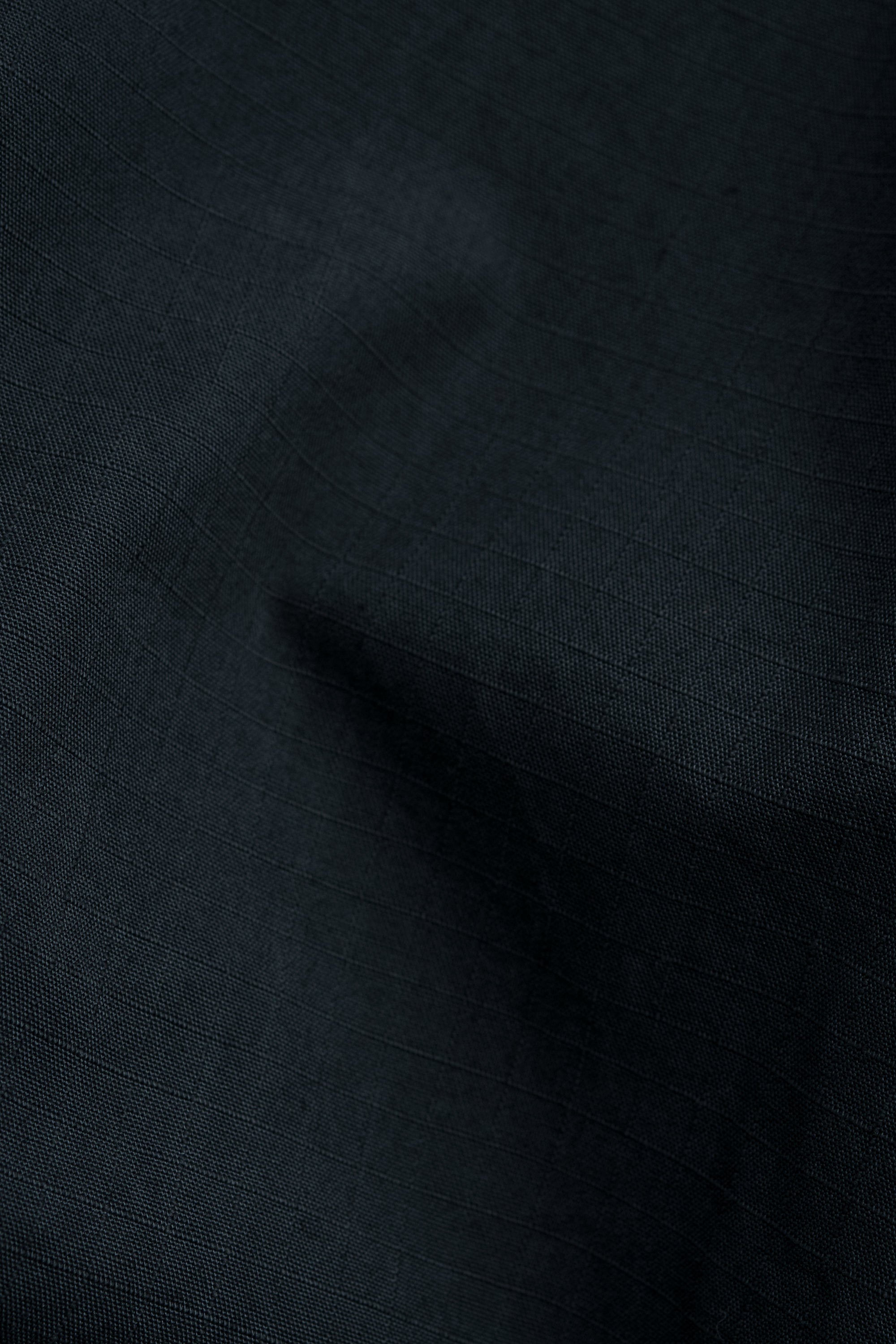 FABRIC: Cotton ripstop fabric with a visible grid structure and a garment-dyed deep tone. The fabric has a firm, rigid hand and a durable feel.