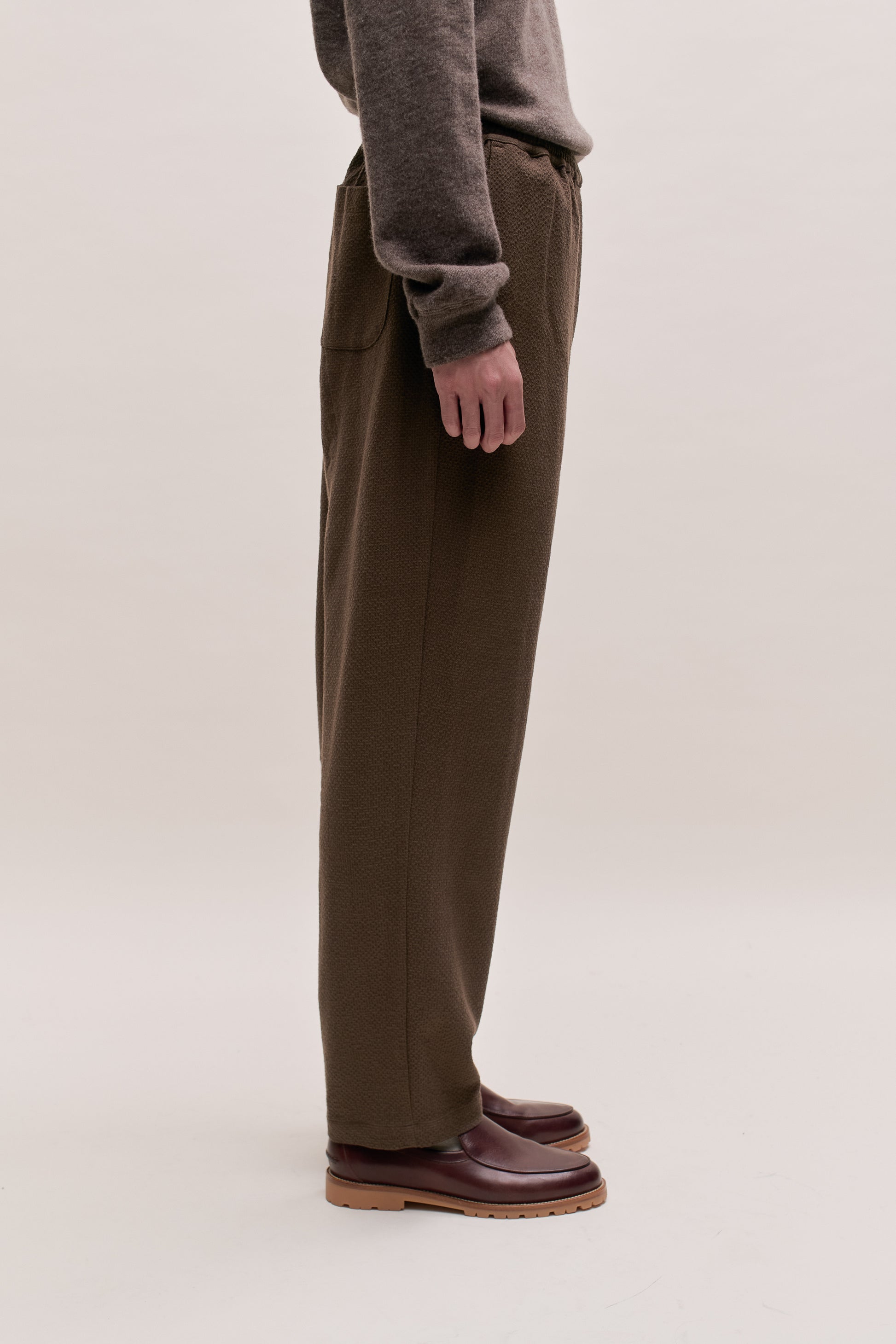 FABRIC: A structured seersucker fabric made from a wool–cotton blend, featuring a subtle puckered texture. Slightly stretchy with a soft, warm handfeel for added comfort.