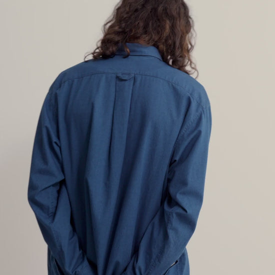 PRODUCT: The Banita Button Down Shirt is an oversized, vintage-inspired button-down featuring a curved hemline, patch pocket, and adjustable cuffs.