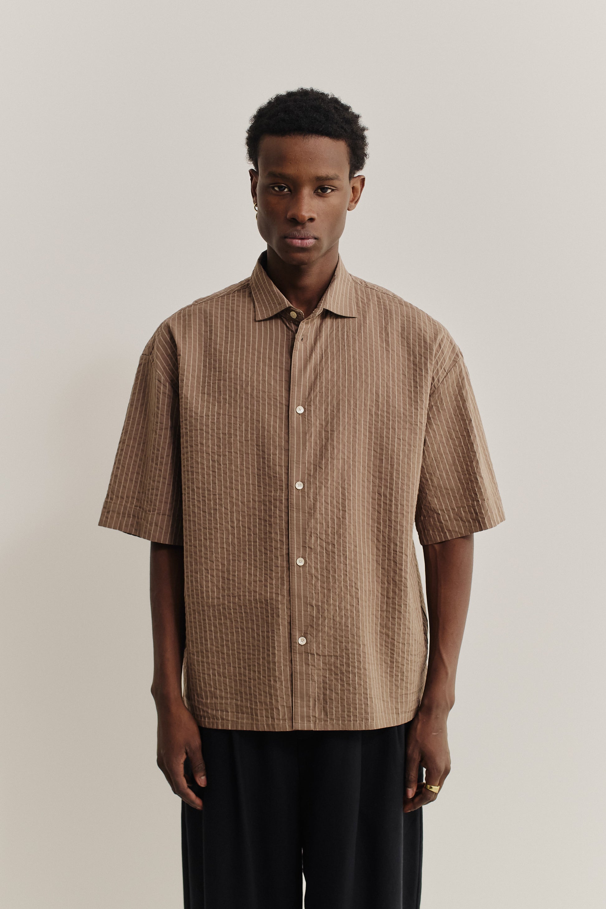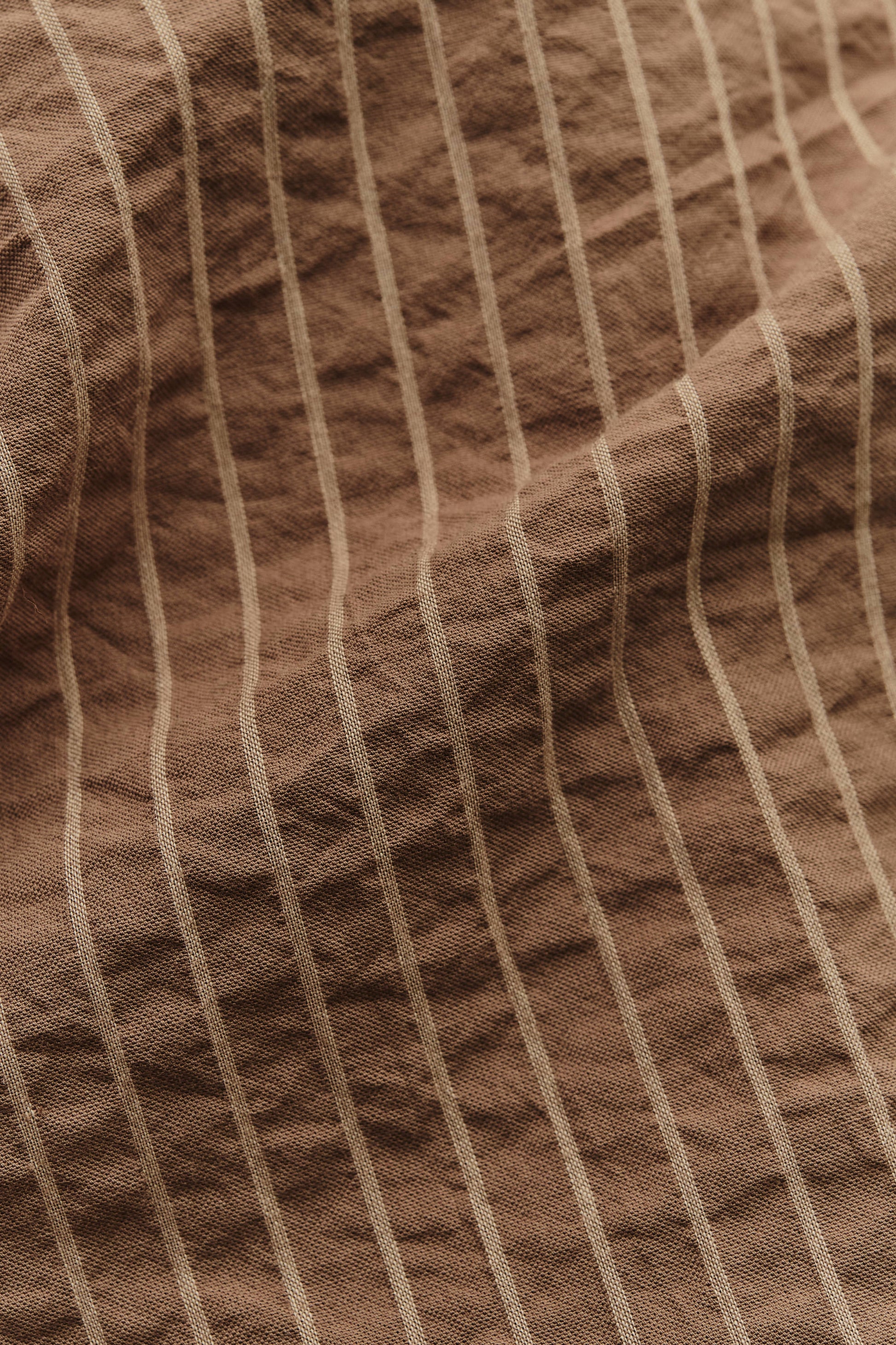FABRIC: Woven in Spain, this lightweight organic cotton seersucker features cocoa brown stripes. Its textured weave enhances breathability and lends a naturally relaxed, airy feel.