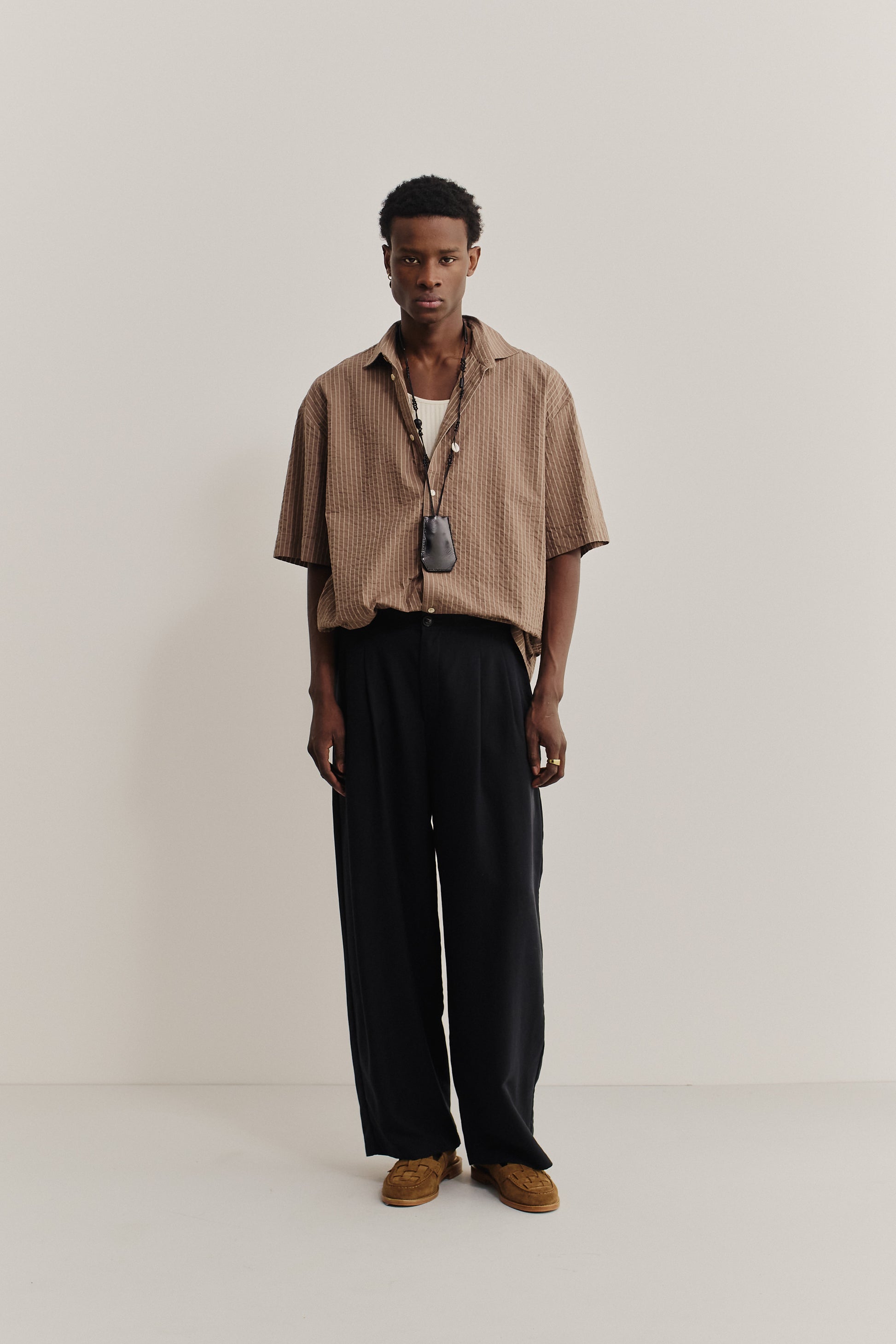PRODUCT: The Bantu Shirt features a wide boxy fit with short, wide sleeves, a dropped shoulder, and a straight hem.