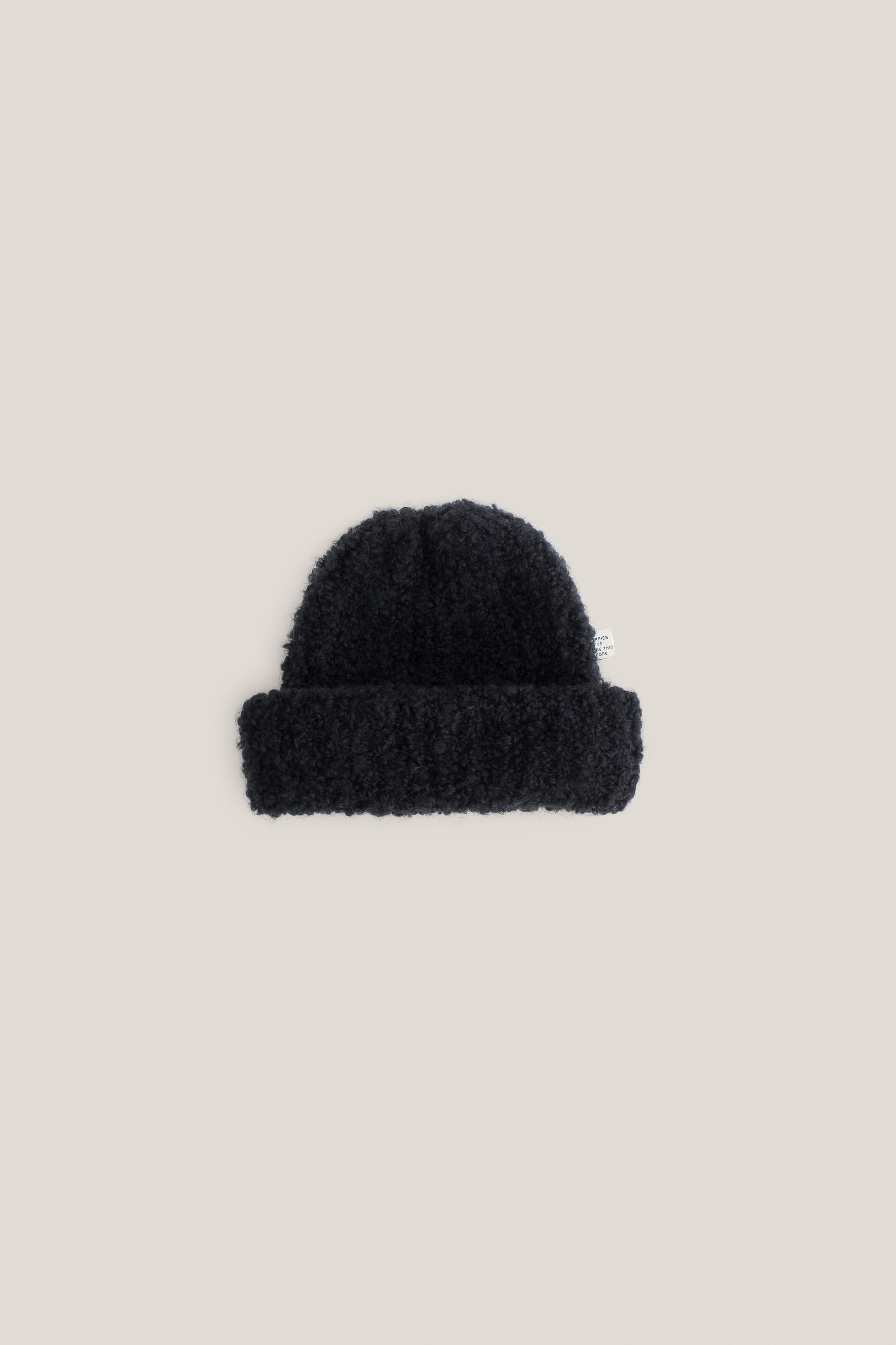 PRODUCT: This thick yet soft and mellow knit beanie is crafted from a fine italian yarn blend made from virgin and alpaca wool. The plush boucle yarn provides warmth and comfort, making it a perfect accessory for colder weather with a stylish, relaxed look.