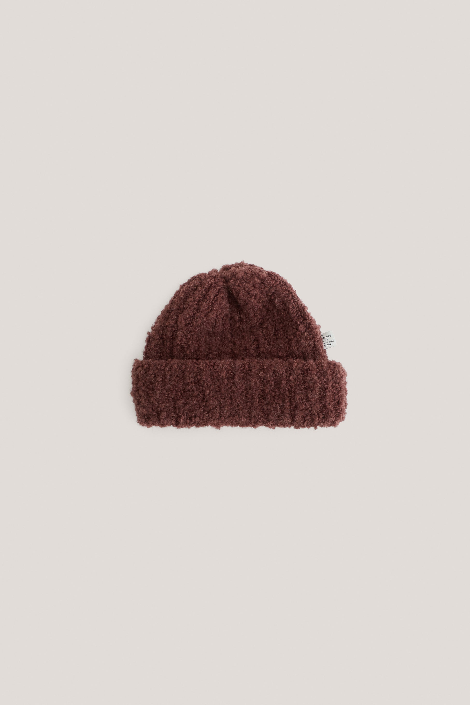 PRODUCT: This thick yet soft and mellow knit beanie is crafted from a fine italian yarn blend made from virgin and alpaca wool. The plush boucle yarn provides warmth and comfort, making it a perfect accessory for colder weather with a stylish, relaxed look.