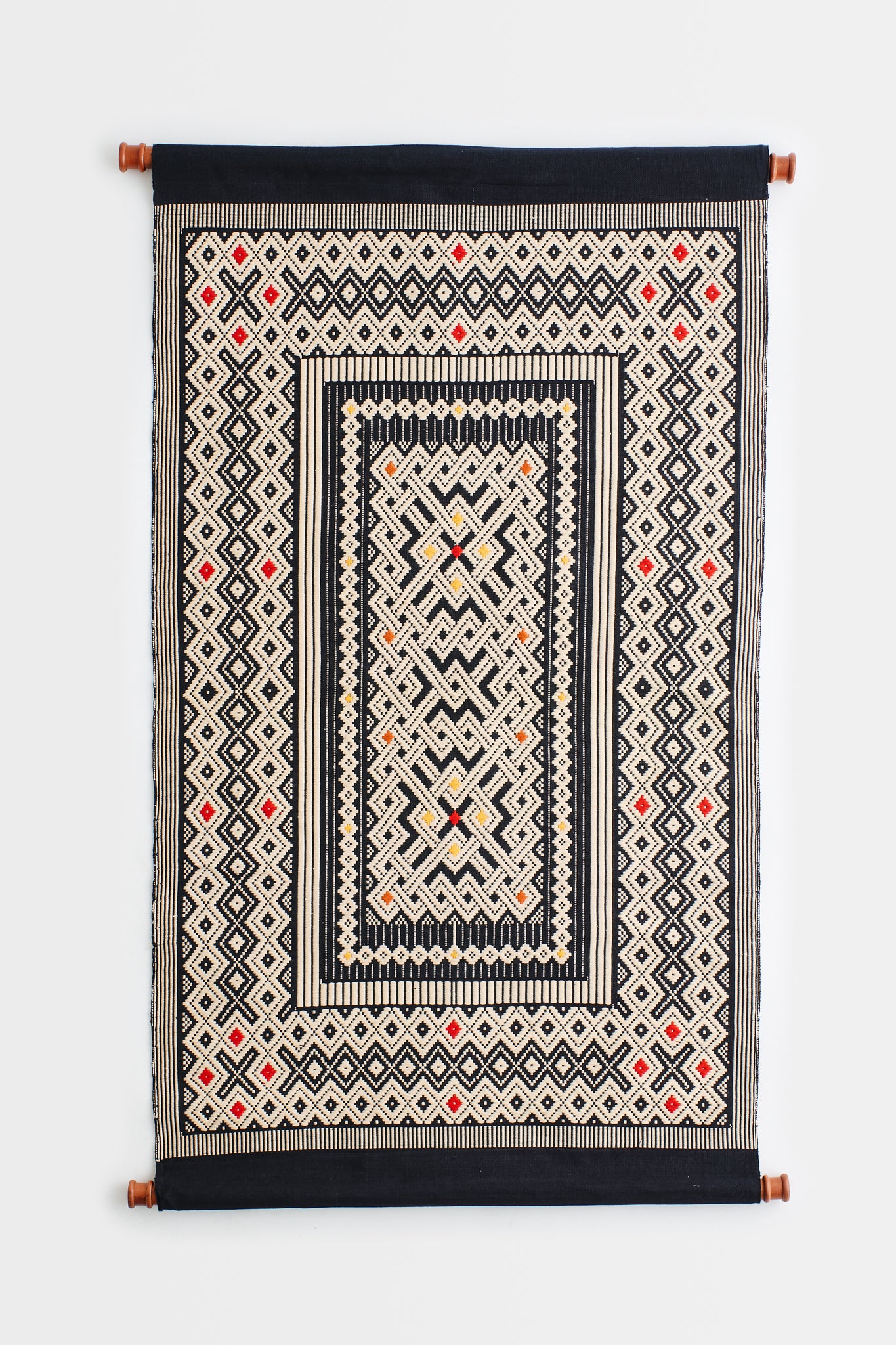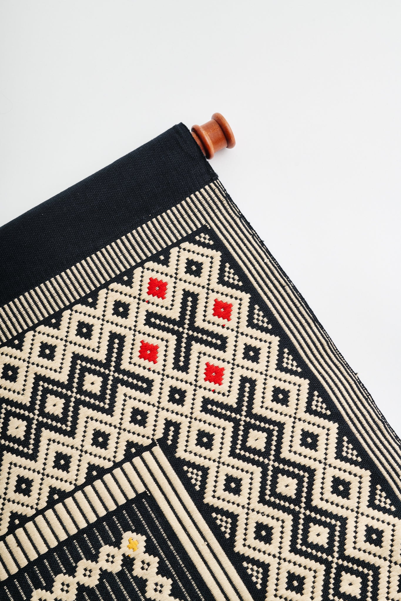 A touch of Sri Lankan artistry with this intricate wall tapestry. This textile piece features geometric patterns inspired by traditional weaving motifs and cultural symbolism. Crafted with great care and attention to detail, each stitch reflects the artisan’s dedication to preserving local craft.