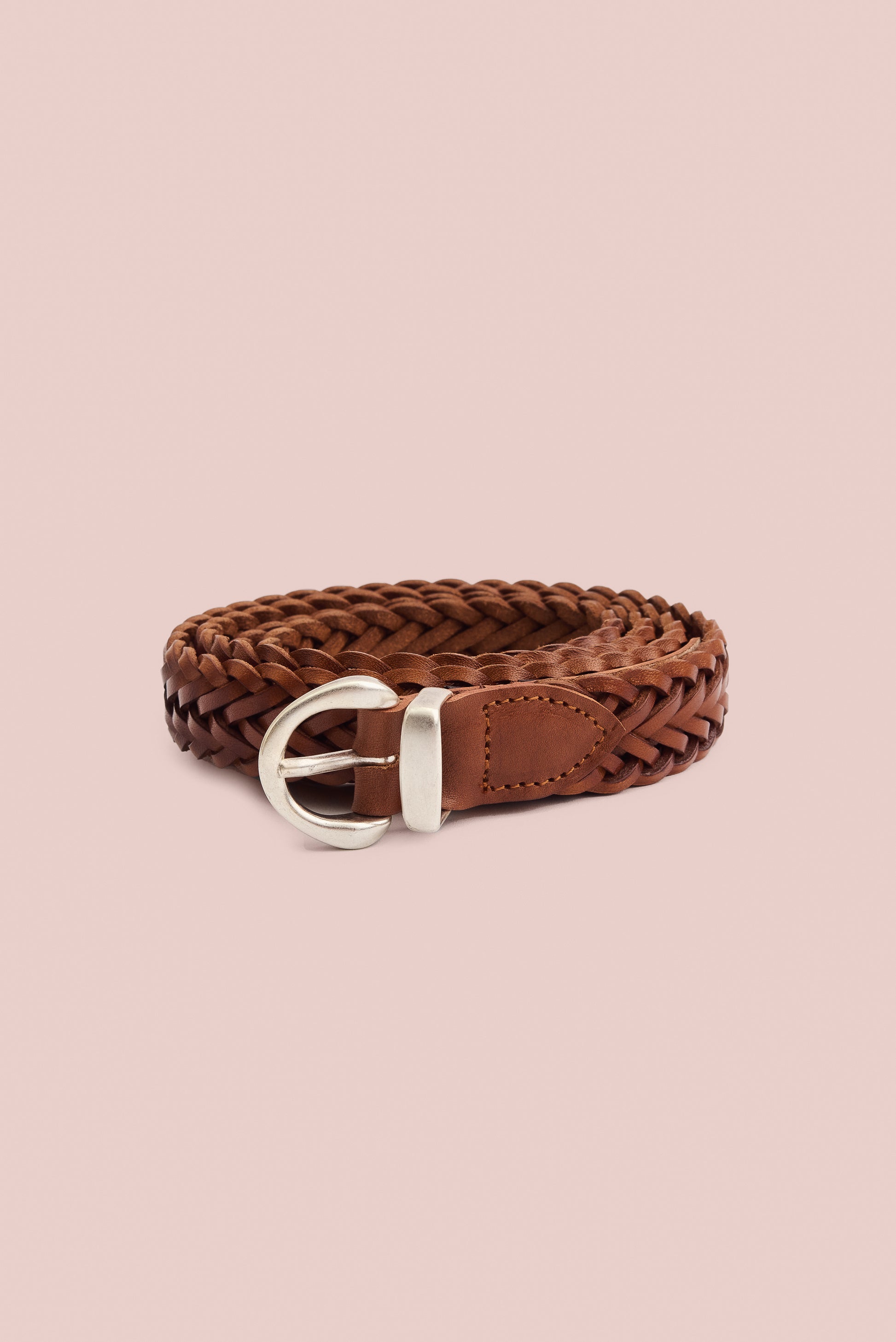 MATERIAL: This belt is made from 100% calf leather, sourced from Italy. The surface is smooth with a matte finish and is dyed in a warm cognac tone. The material has a firm but flexible feel and will develop a natural patina over time.