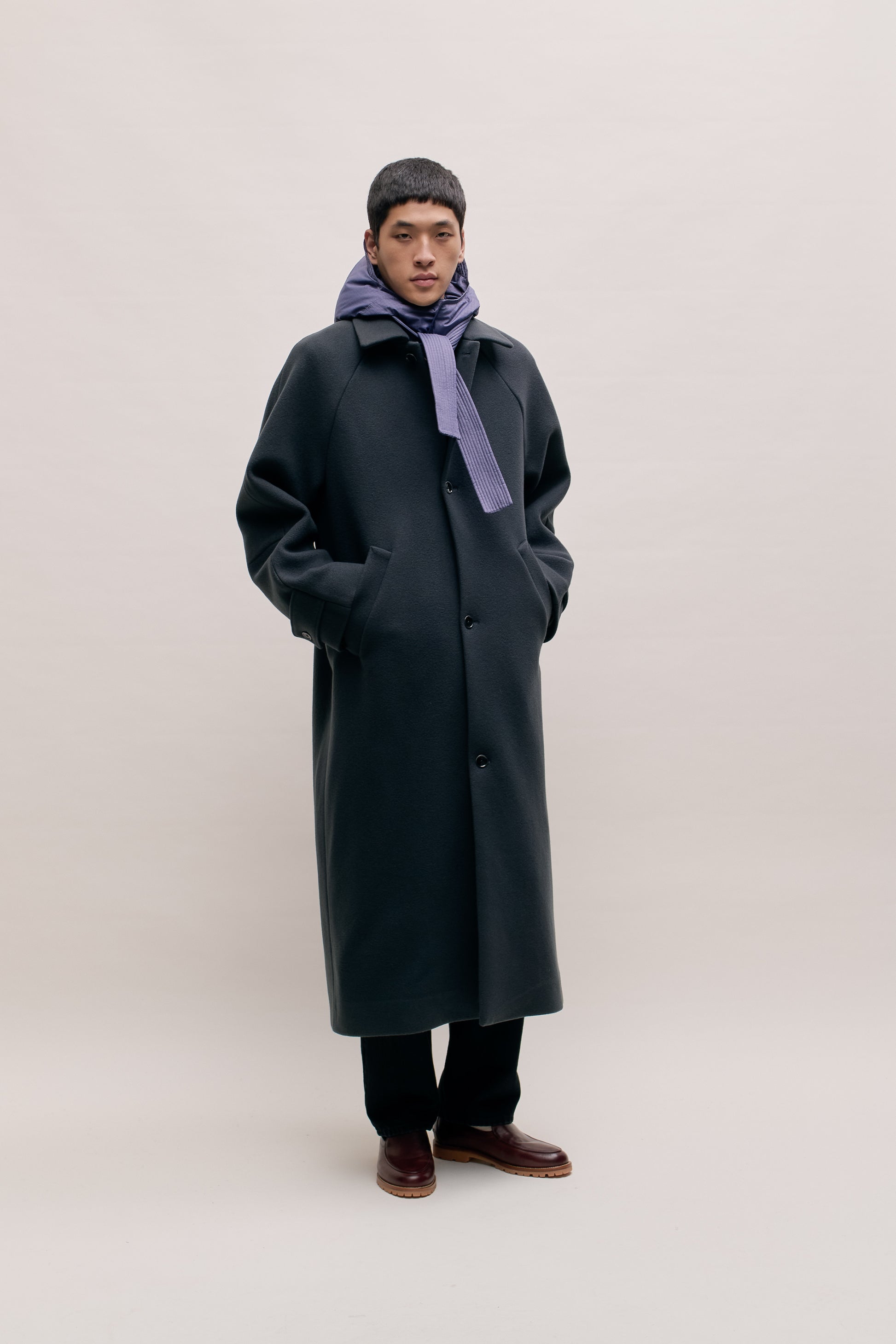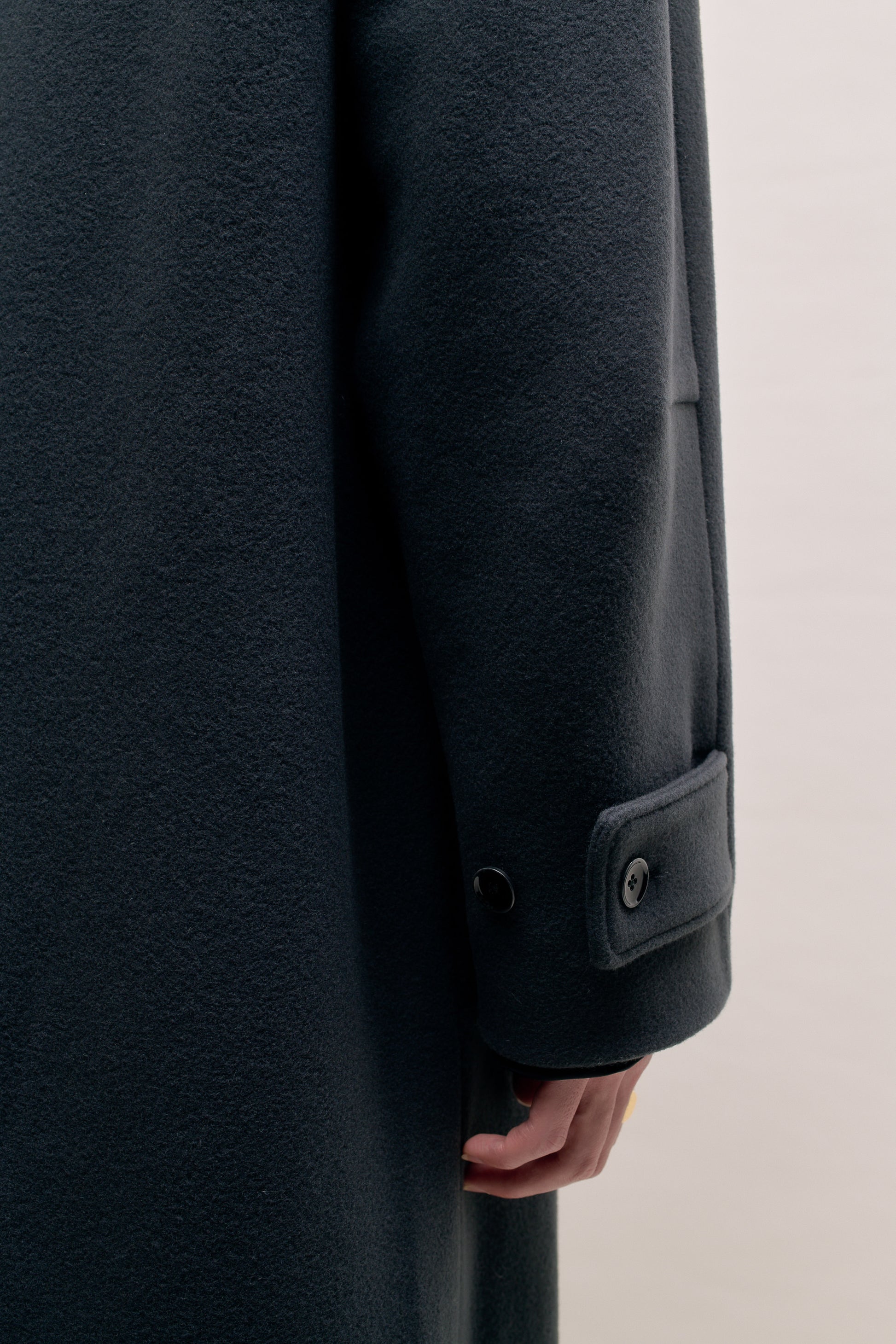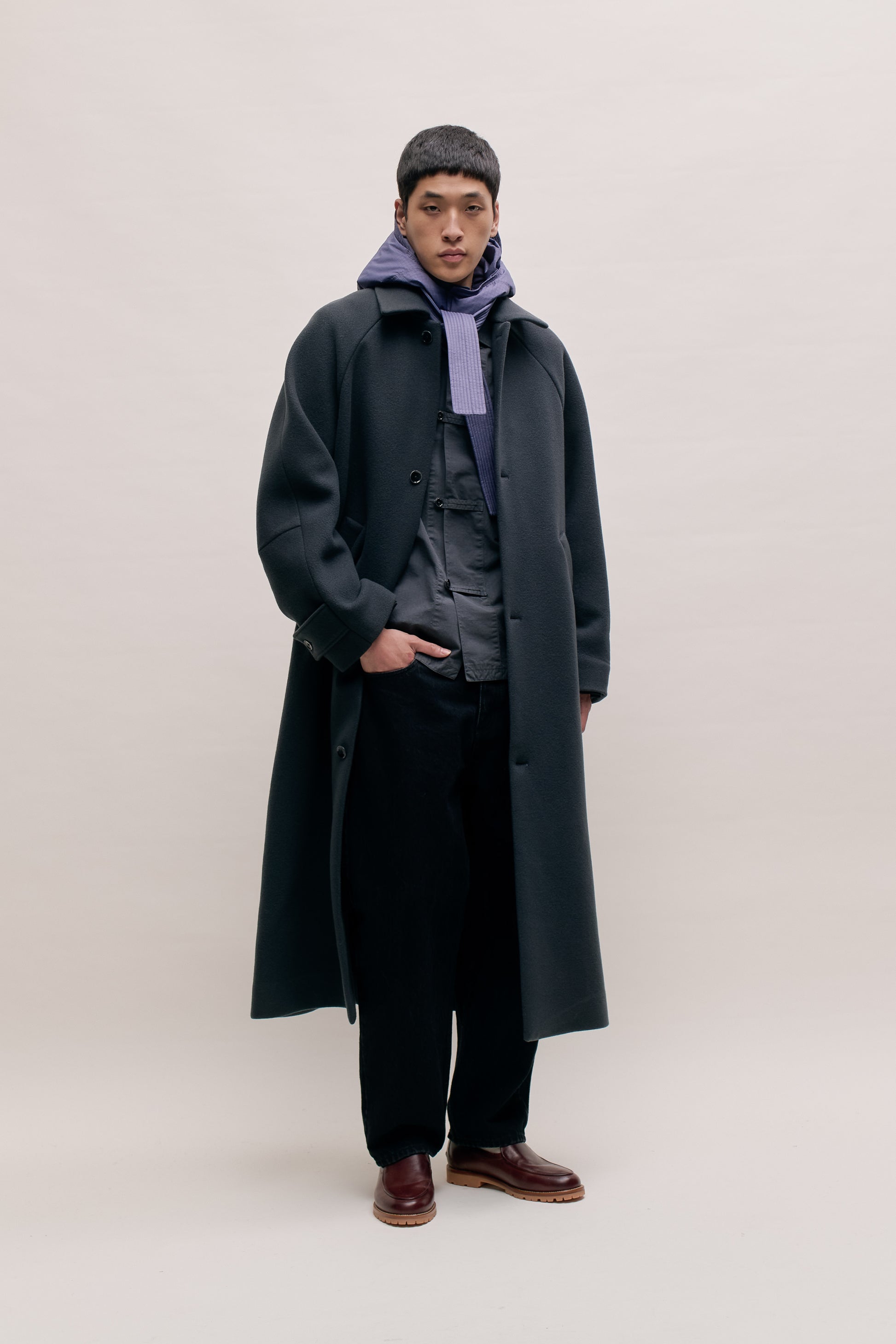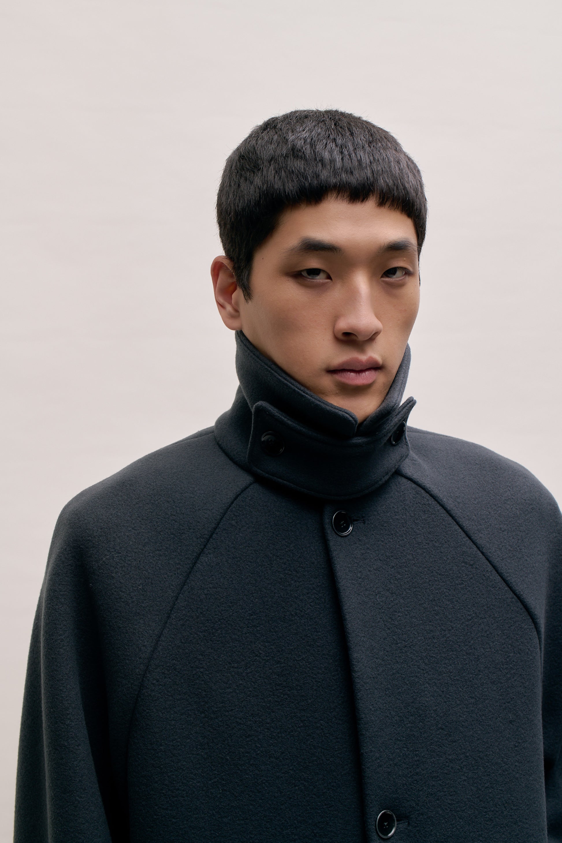 PRODUCT: The can coat features a classic, long a-line silhouette with raglan sleeves and a back slit. The turn-down collar can be closed with a removable buttoned strap. Additional details include two welt pockets, an inner welt pocket, and adjustable cuffs for a versatile fit.