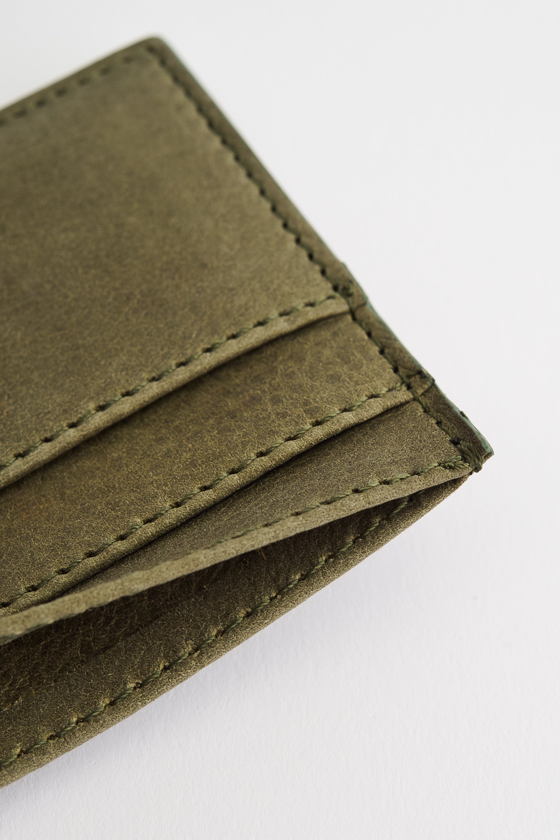 PRODUCT: The Card Holder in MIlitary Green is a sleek and minimal everyday essential. With its compact silhouette, it features multiple card slots for daily use and a refined top-stitched edge for added durability.
