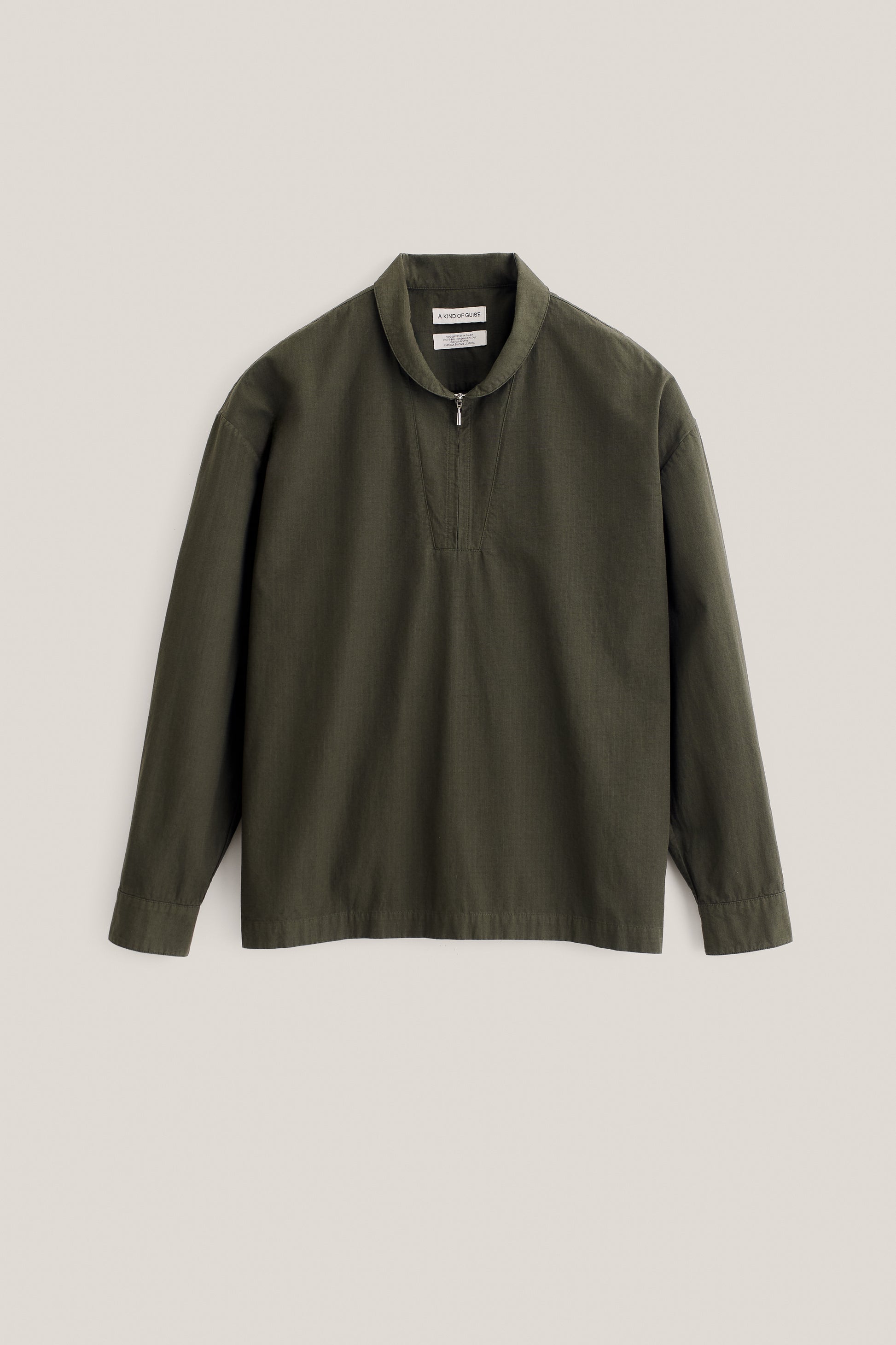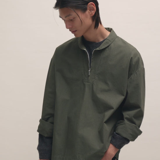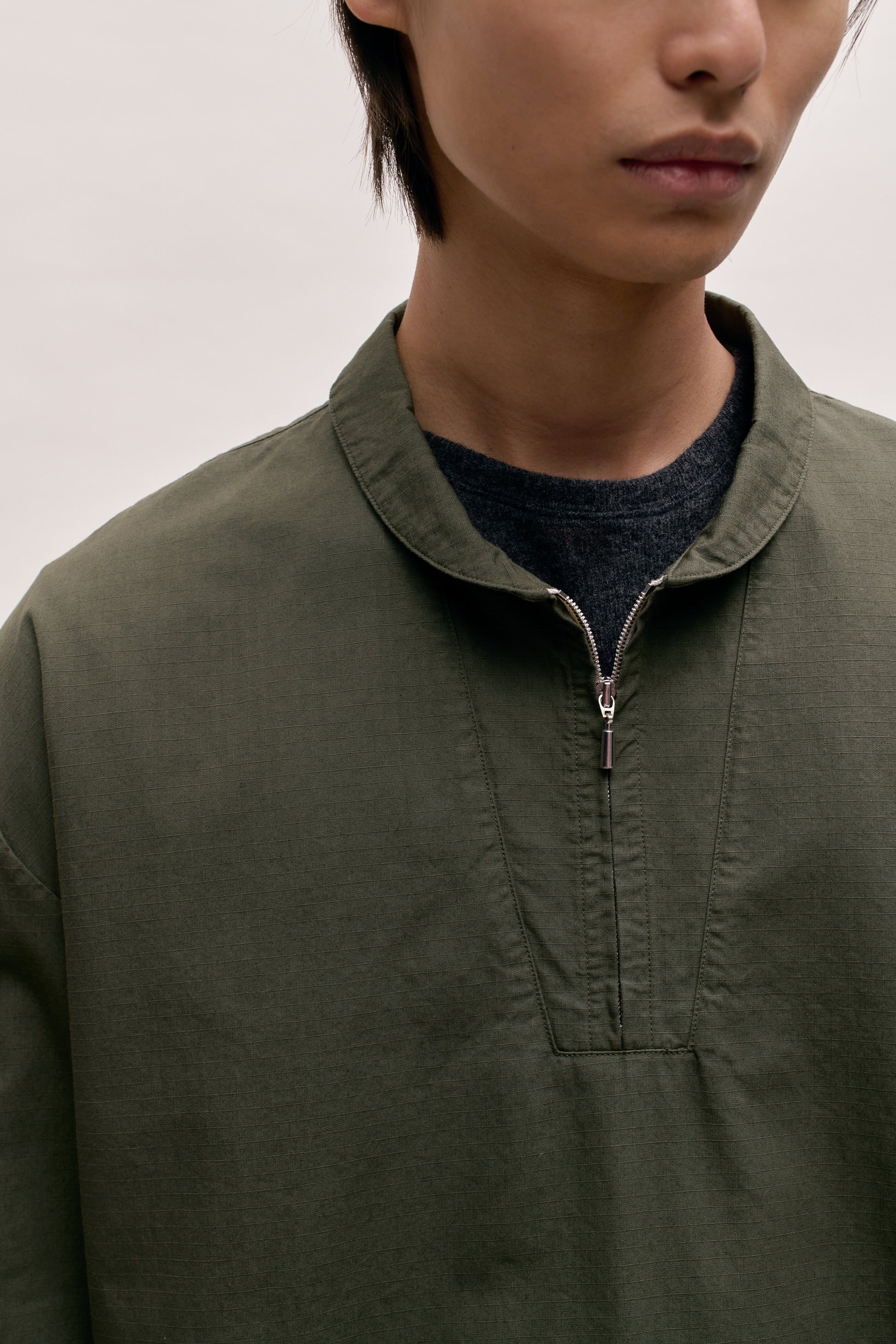 PRODUCT: This overthrow shirt features a sleek metal zipper and a rolled collar. Inspired by the classical fishermen shirt it features overcut shoulders and a boxy fit.