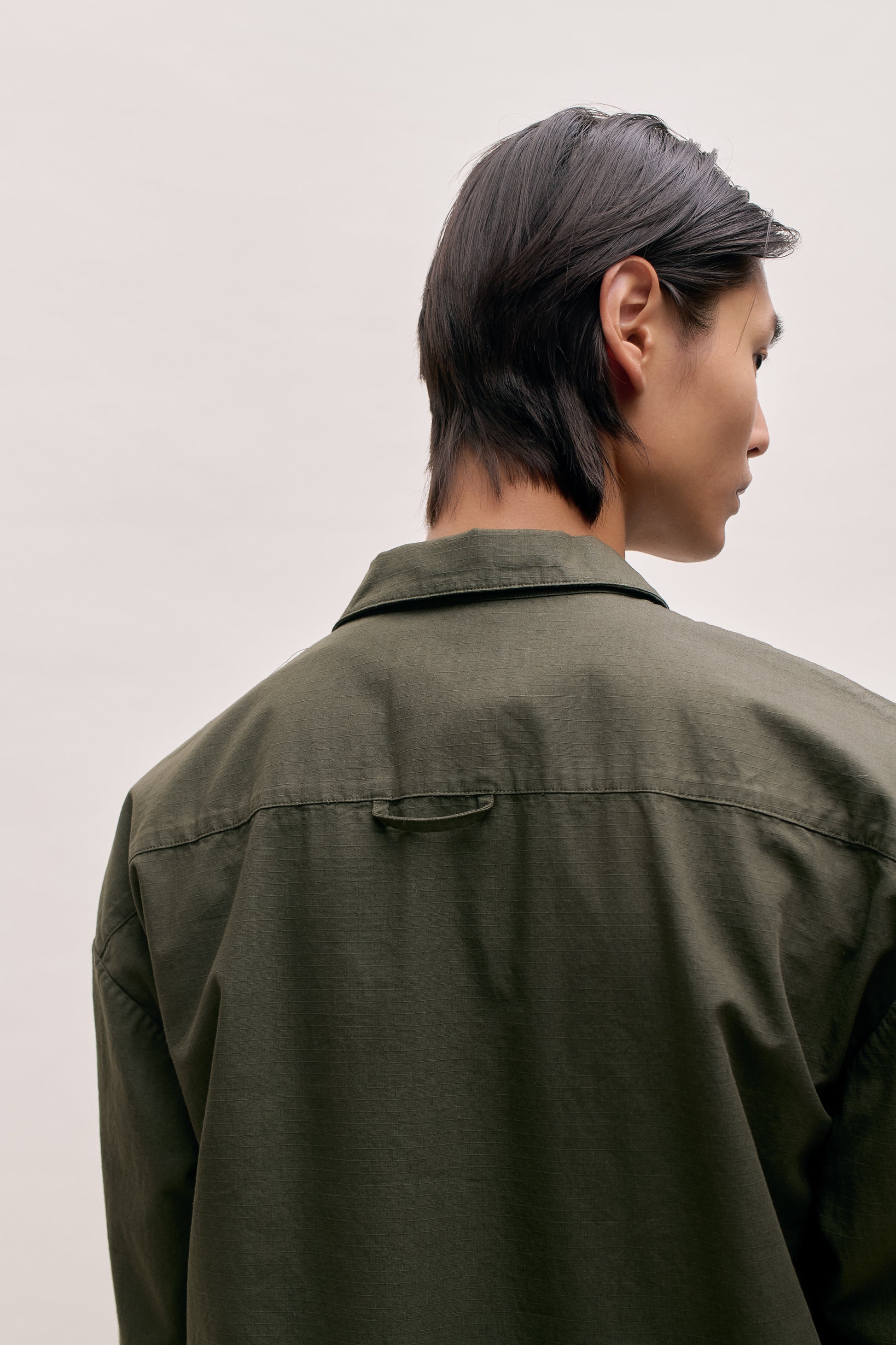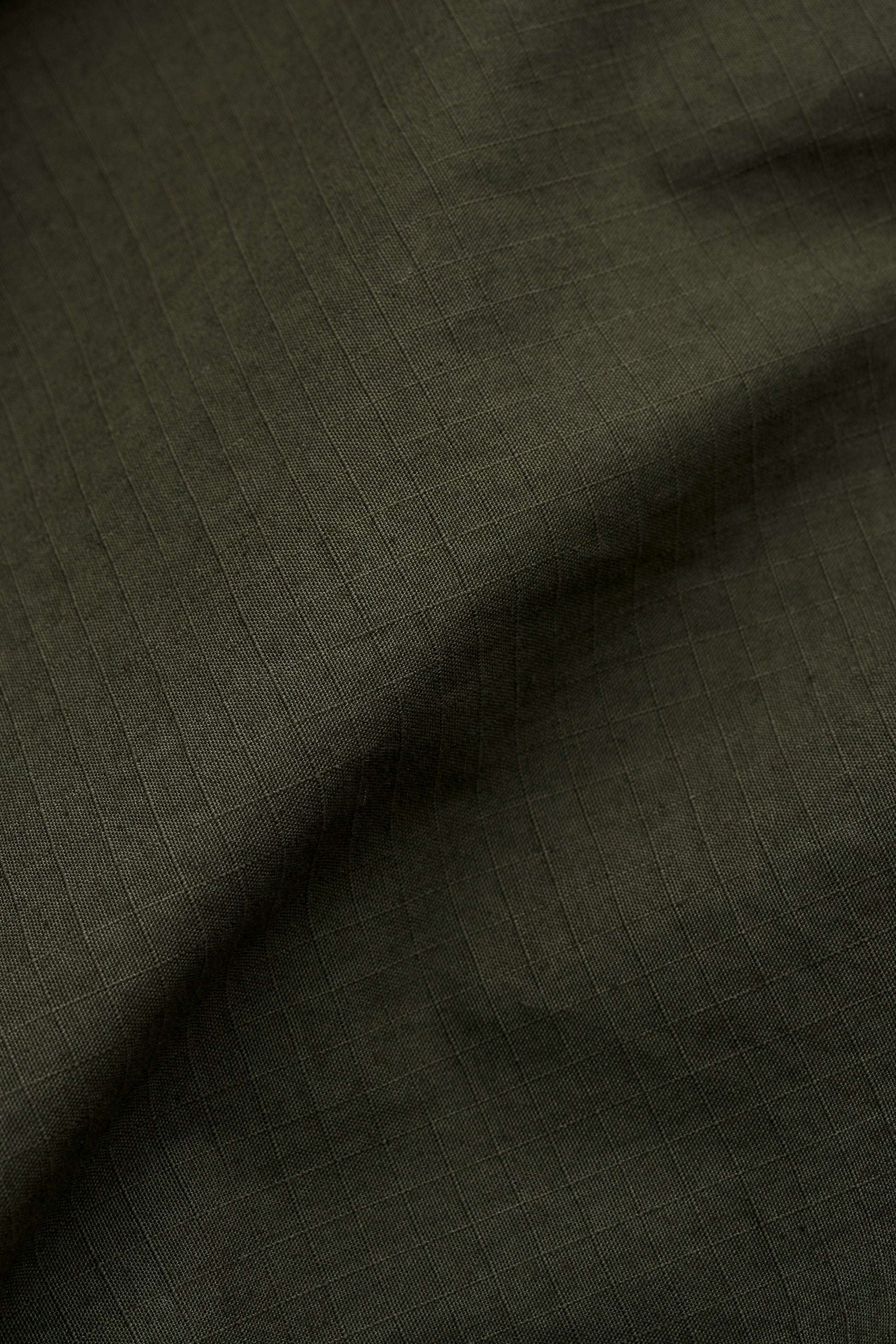 FABRIC: Cotton ripstop fabric with a visible grid structure and a garment-dyed deep tone. The fabric has a firm, rigid hand and a durable feel.