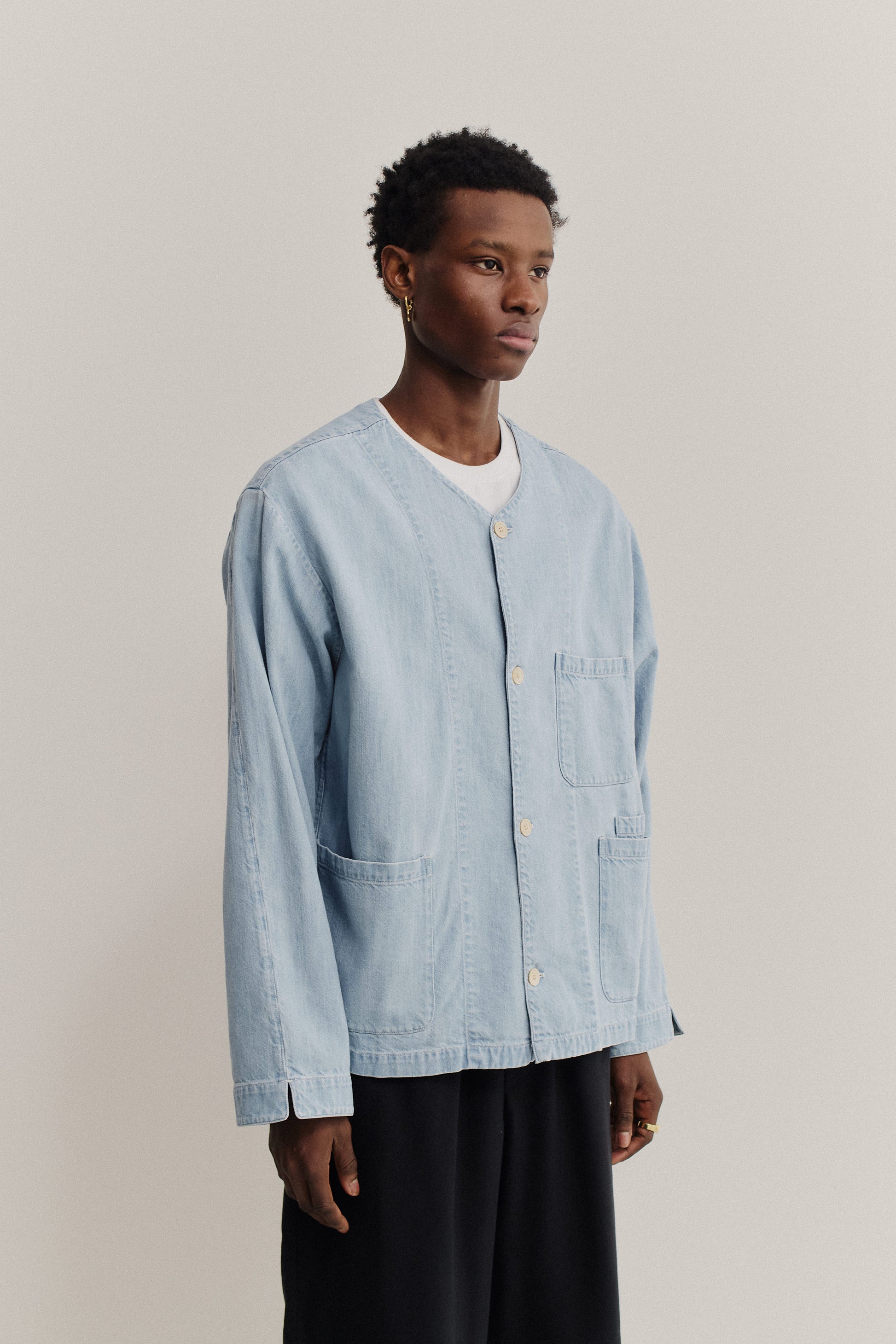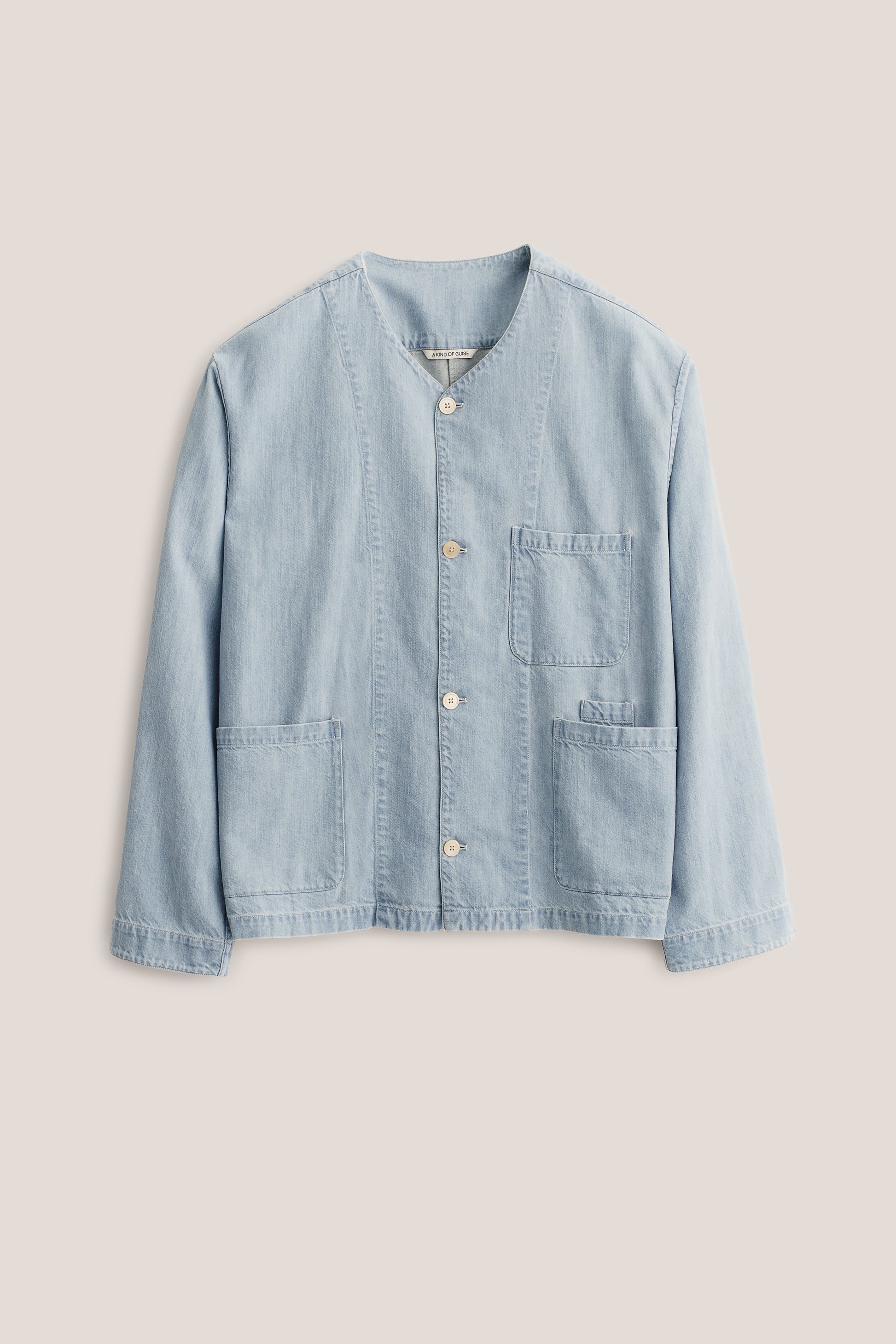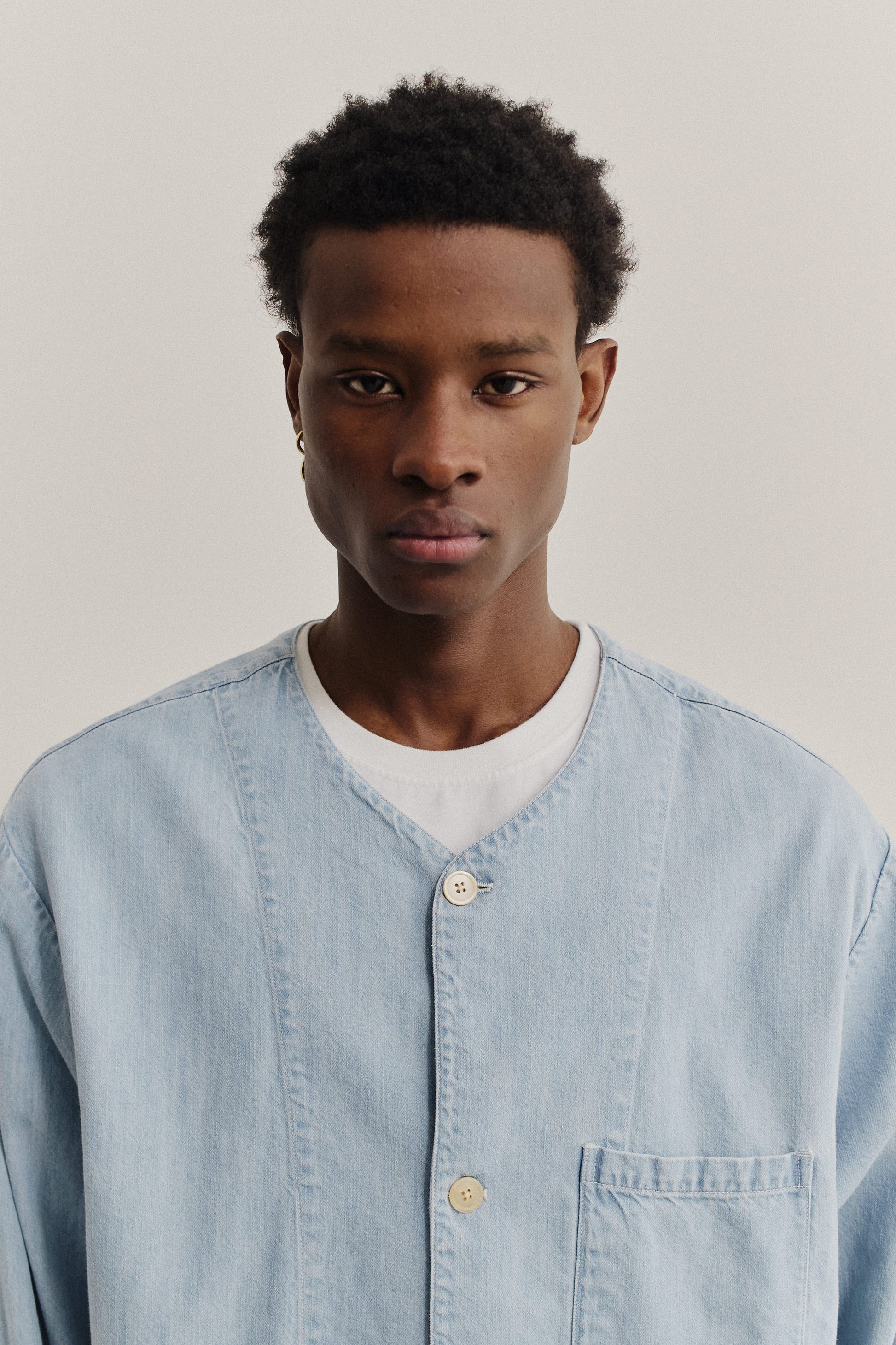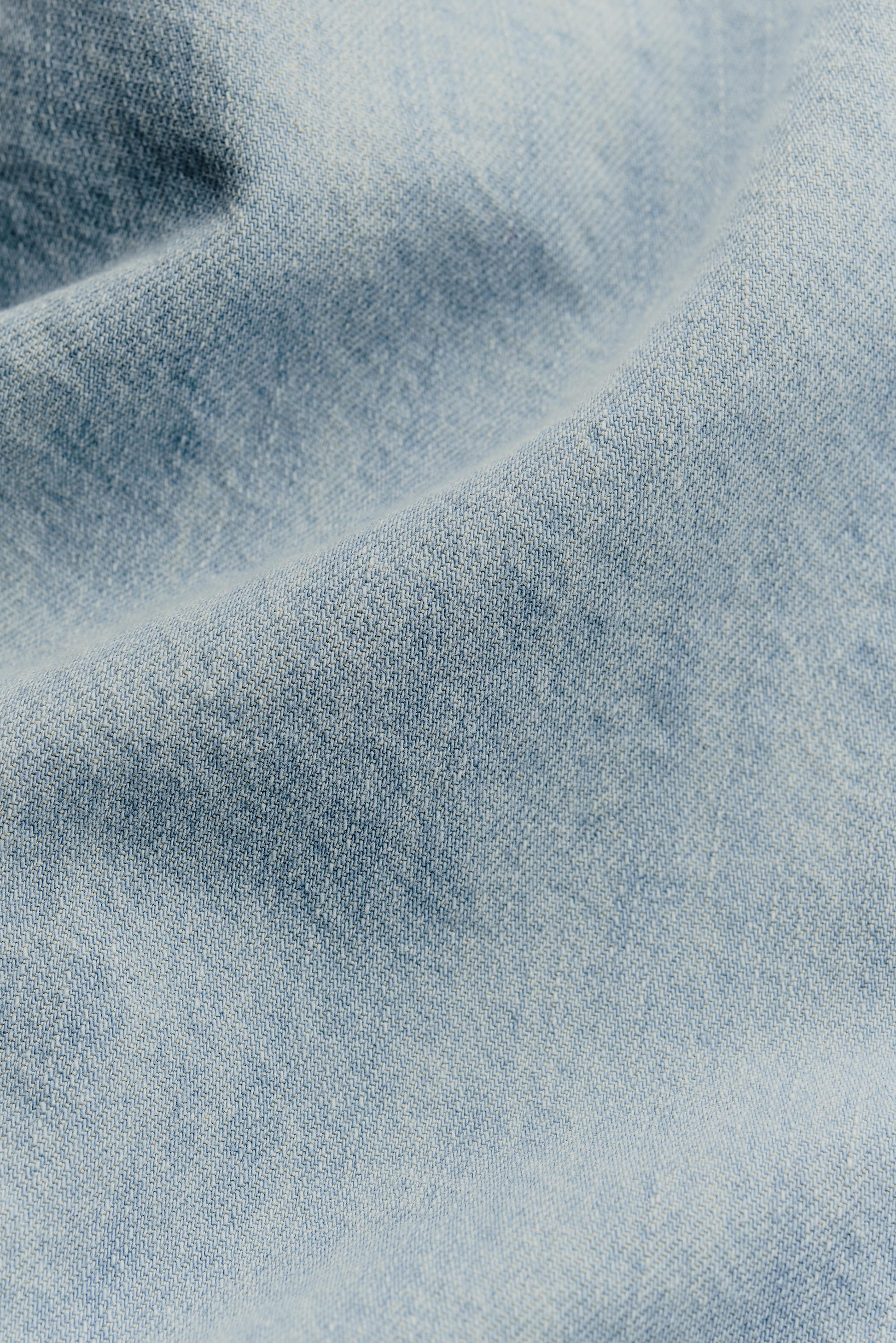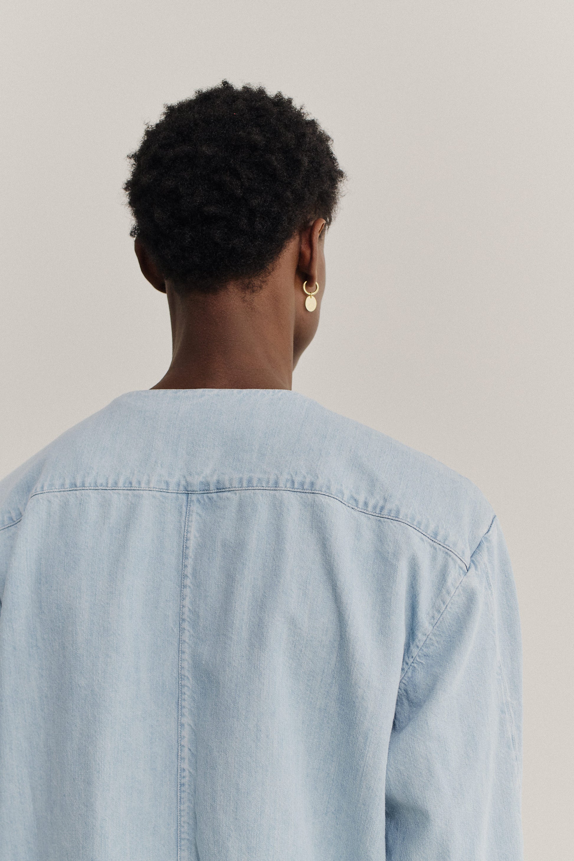 FABRIC: This light blue denim fabric combines organic cotton with the refinement and lightness of silk, offering a warm, natural sheen. The vintage-inspired texture adds character and depth, while its soft hand feel ensures relaxed elegance.