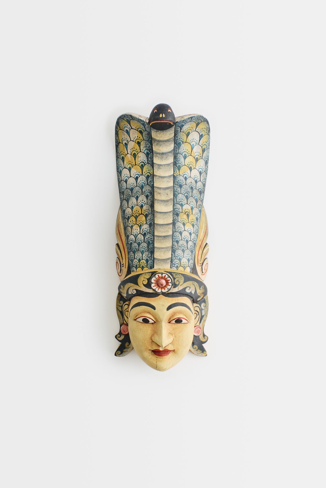 This traditional Sri Lankan wall mask depicts a serene-faced goddess crowned with a striking cobra hood, a symbol of divine protection and wisdom. Crafted and painted entirely by hand, the intricate details and layered textures reflect the island’s deep-rooted mask-making heritage.