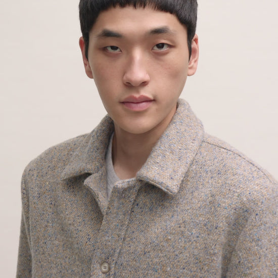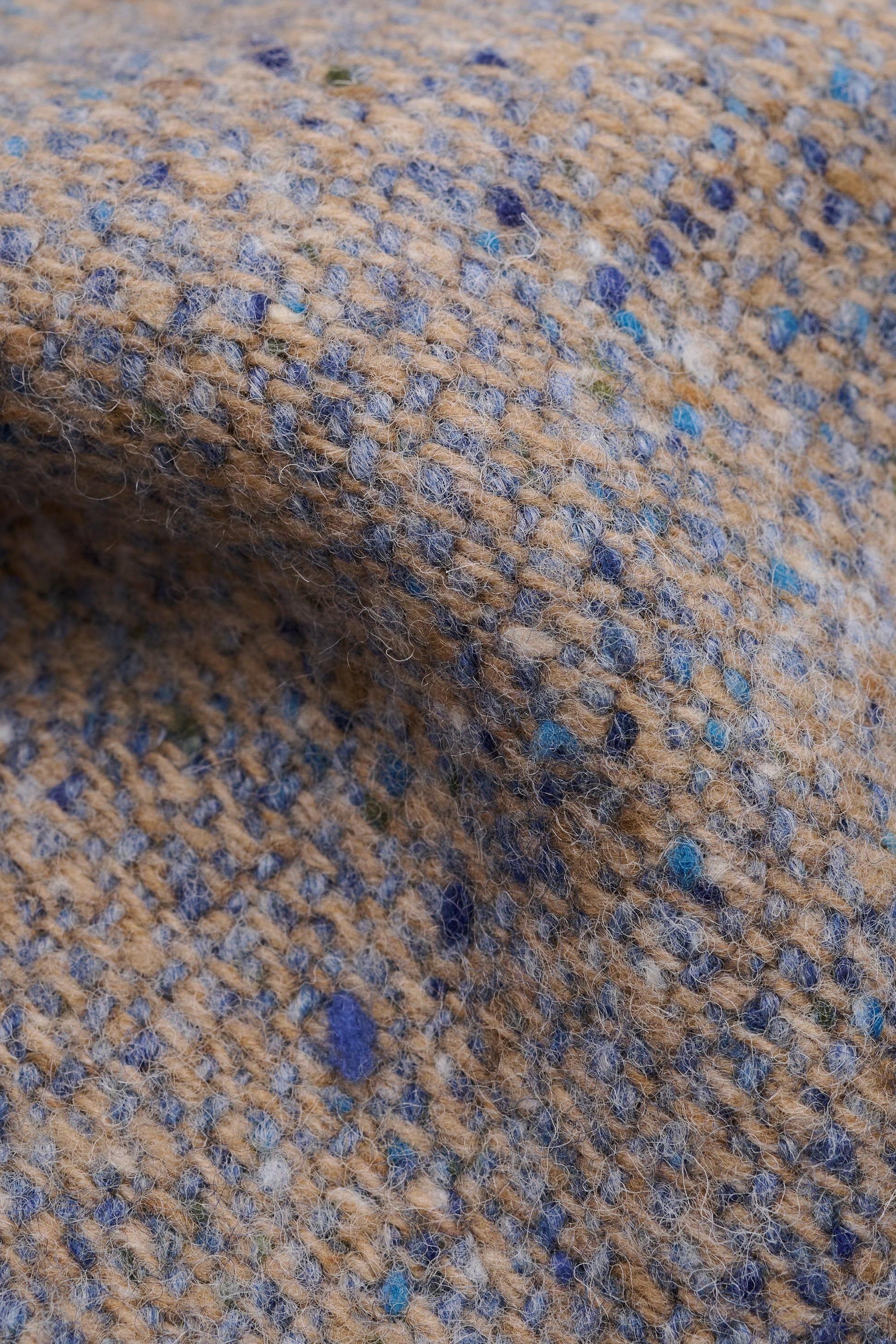 FABRIC: A loosely yet stably woven fabric made from 100% donegal wool, spun from multicoloured yarns to create a rich melange effect. Characterized by its typically rough Irish hand feel, this material combines rustic texture with natural depth.