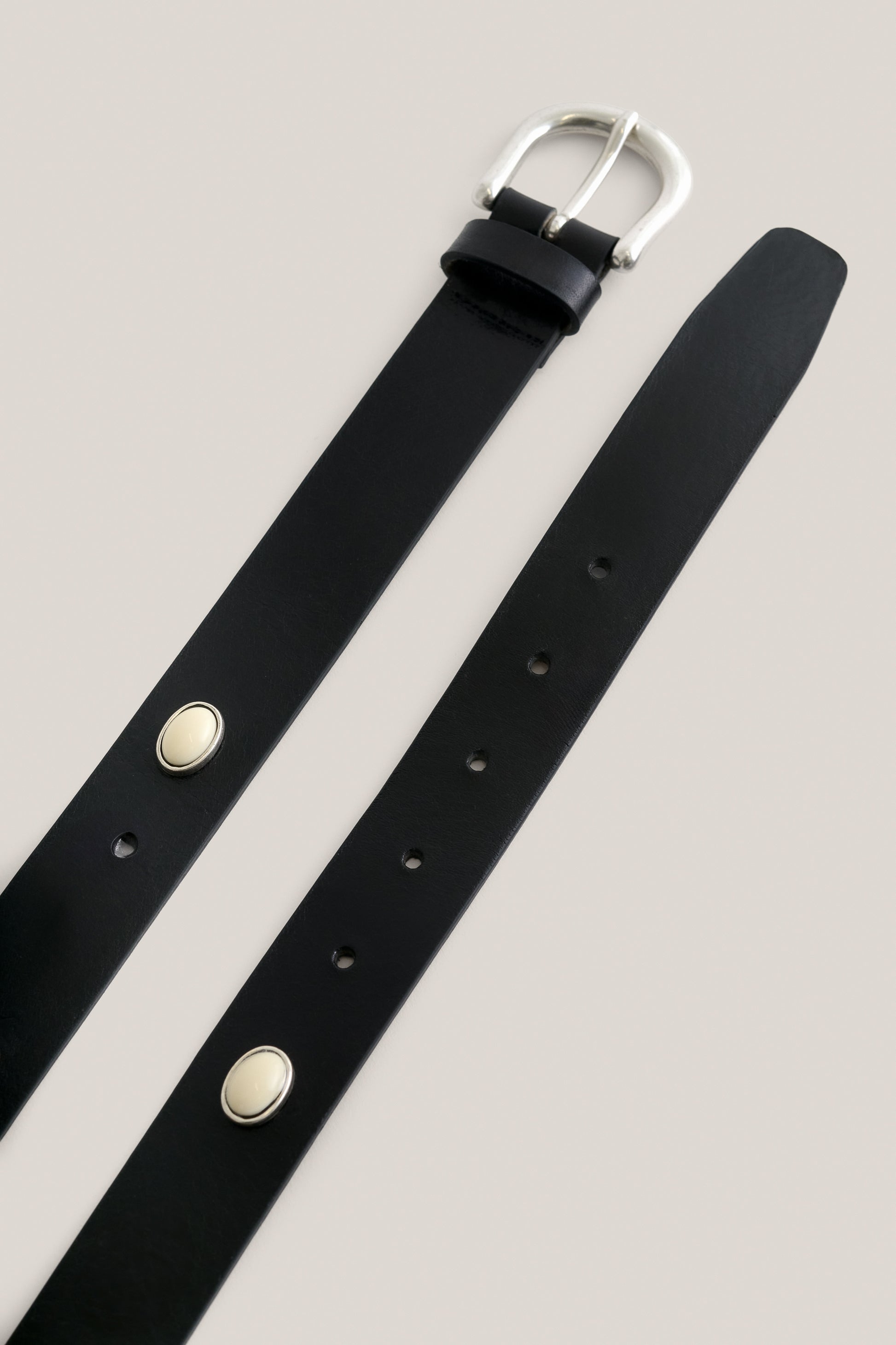 PRODUCT: This belt is inspired by the beautifully handcrafted mongolian belts, it features a minimalist antique silver buckle and pearl studs.
