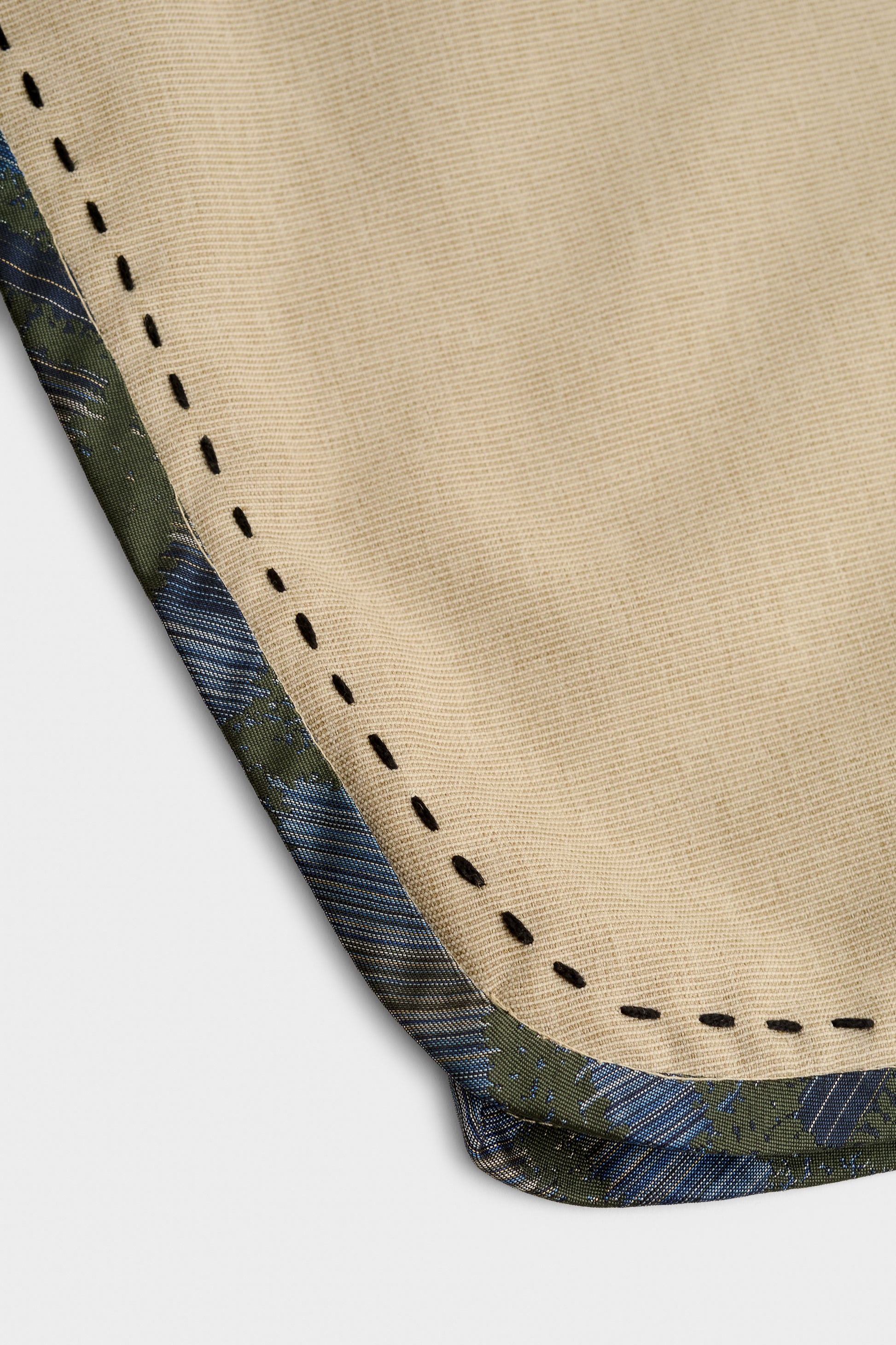 These trousers take cues from Mongolian everyday wear. The beige cotton base is accented with blue and green patterned trim along the pockets and side seams, finished with decorative topstitching.
