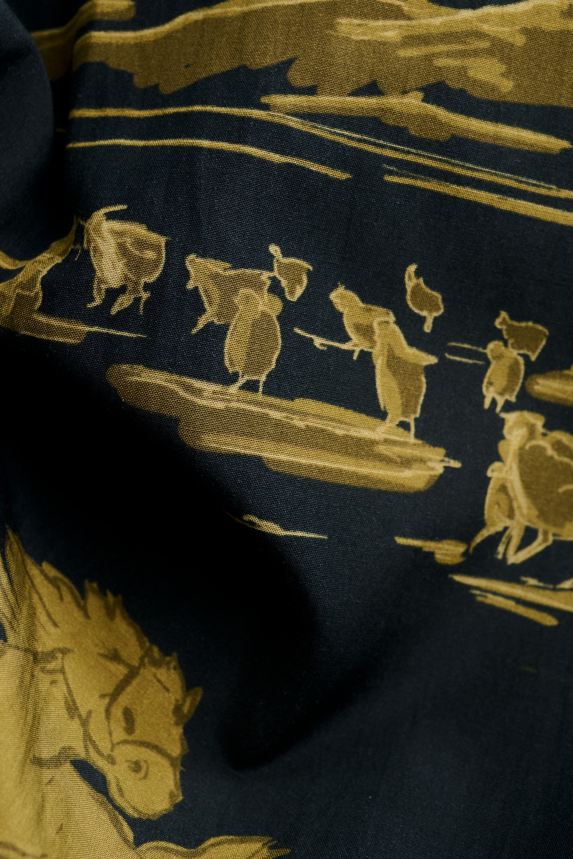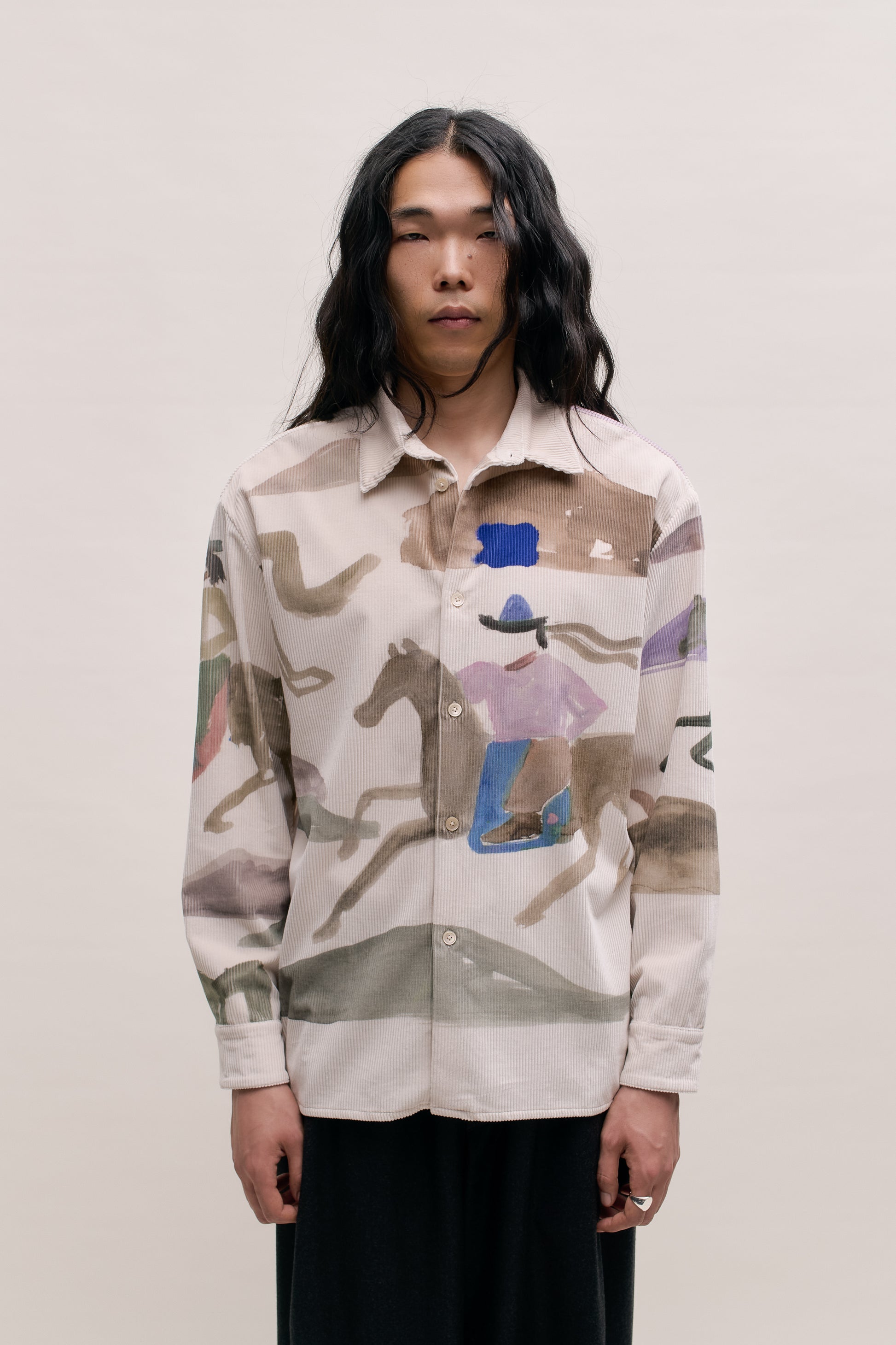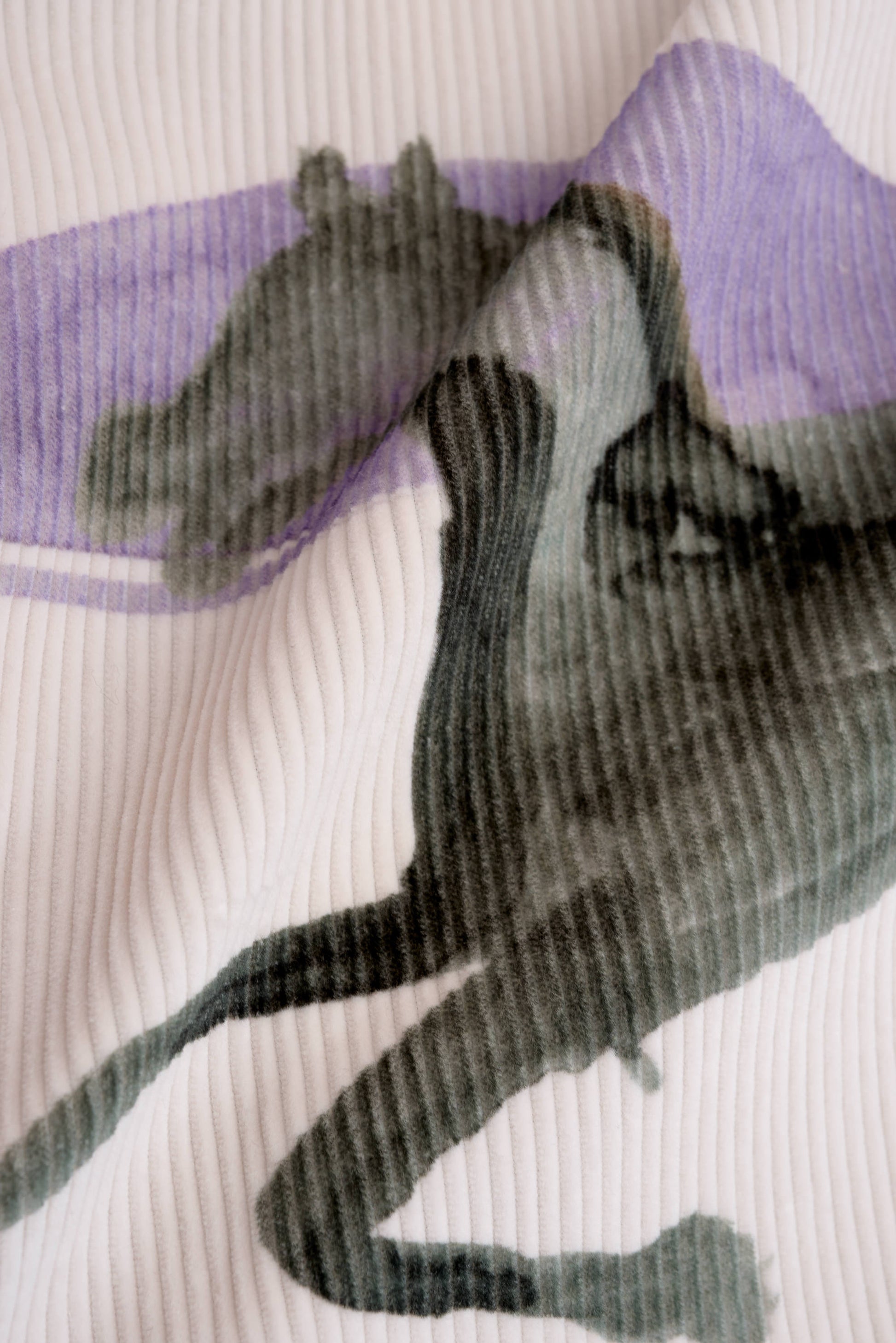 FABRIC: Print by Berlin-based artist Jonathan Niclaus, which is brought to life on soft-touch cotton corduroy. Inspired by the Mongolian horse riders, the brushstrokes and earthy tones depict a dreamlike riding scene, evoking freedom and vast horizons. The textured base adds depth and richness.