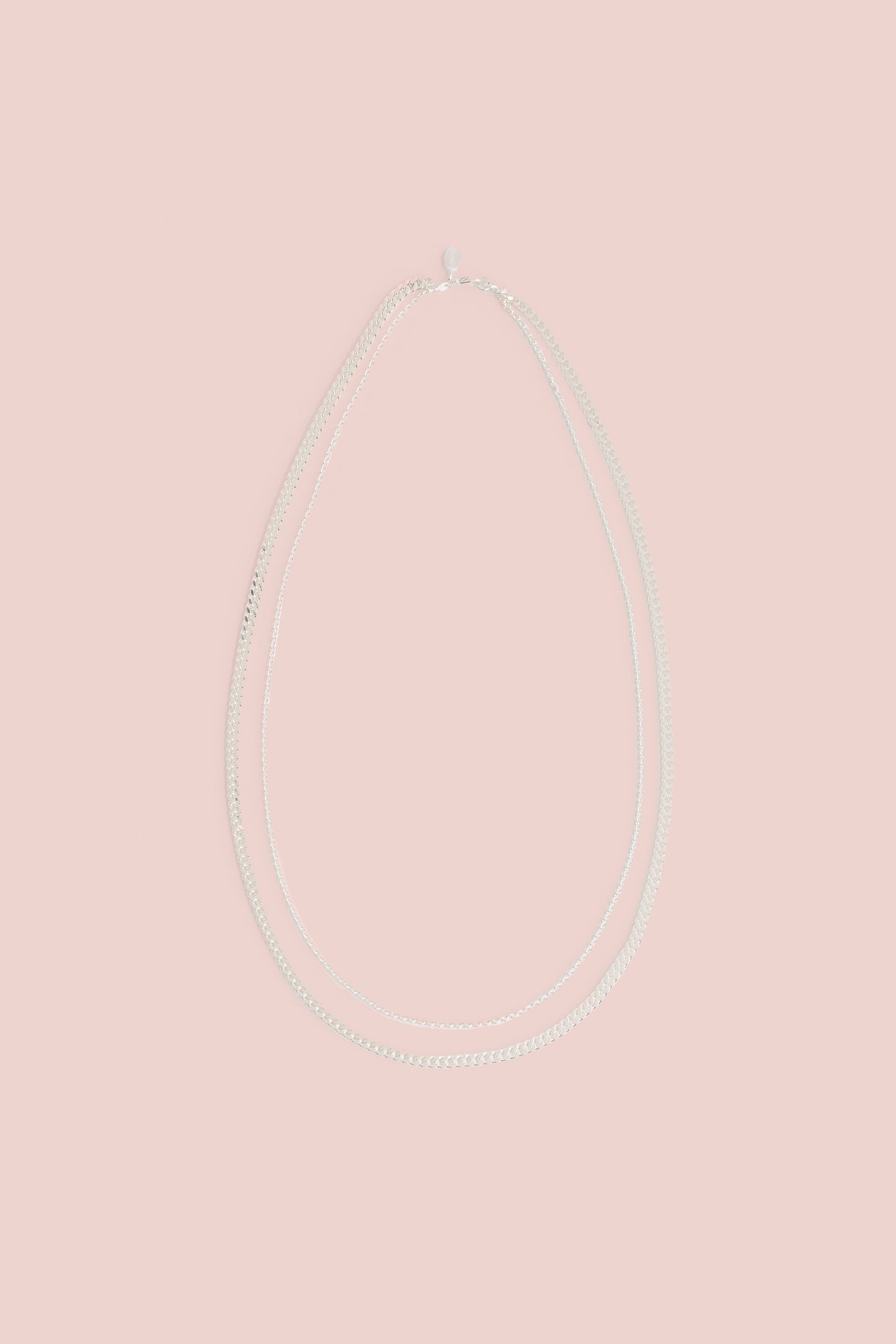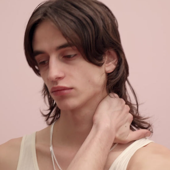 PRODUCT: The Double Layered Necklace in Silver mirrors the same composition as its gold counterpart, combining a 4mm armored chain with a 2mm anchor chain in an offset, layered arrangement. The balanced proportions and reflective surfaces give the piece a quiet presence suitable for everyday wear or elevated layering.