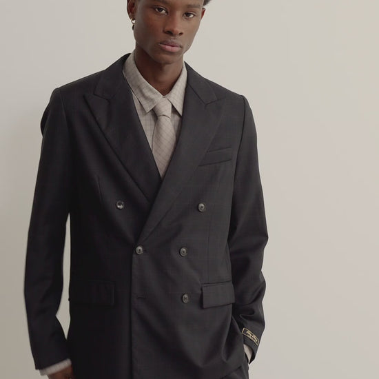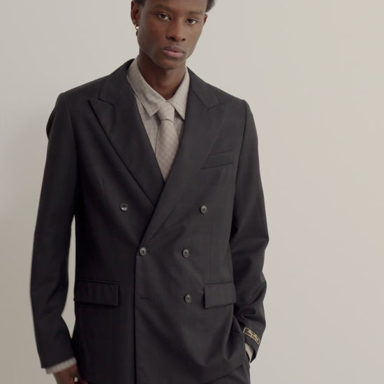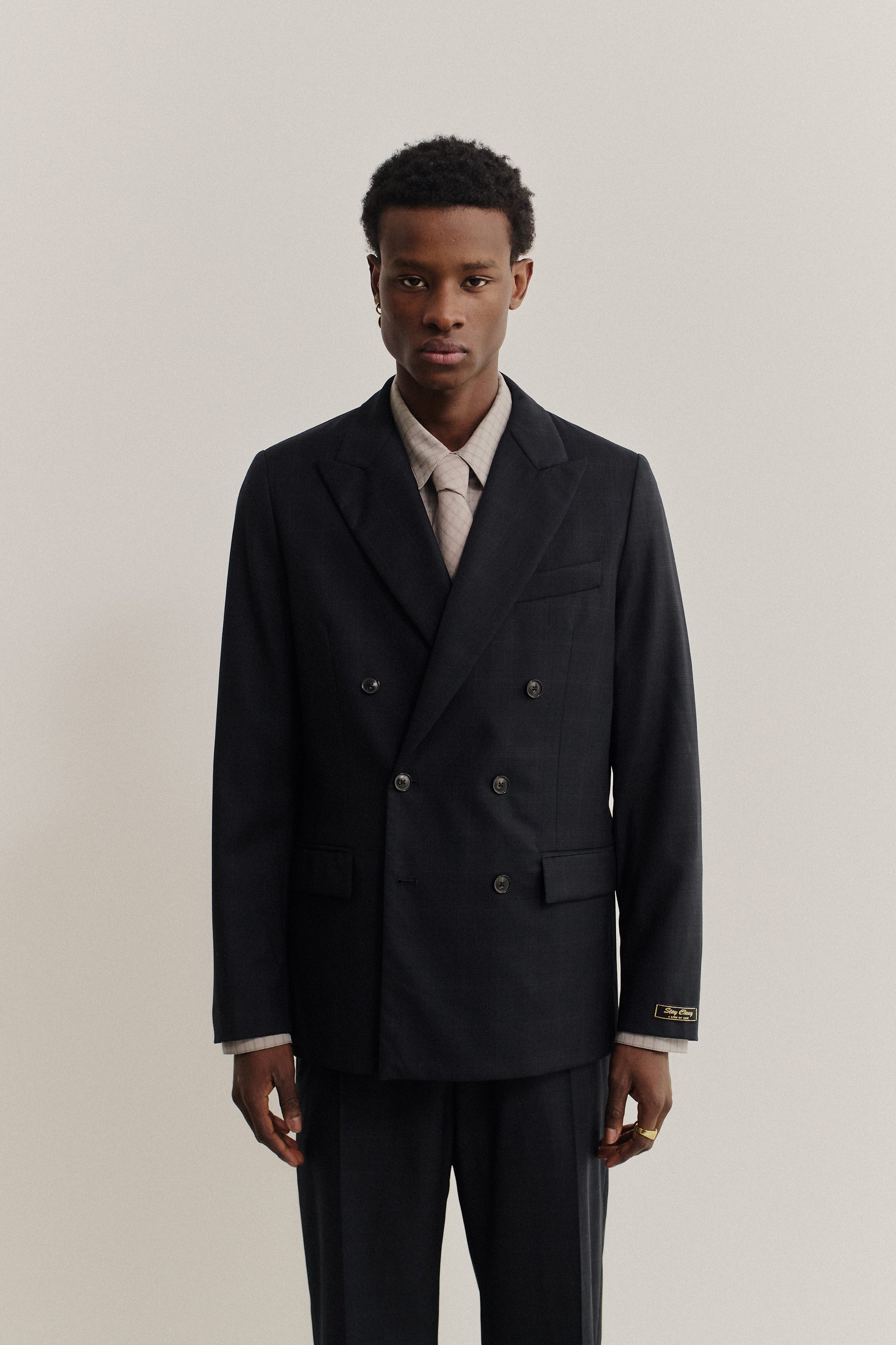 PRODUCT: The Double-Breasted Peak Blazer offers a formal cut and an extra-wide peaked lapel and classic frankfurter pockets. It's versatile enough to pair with tapered, wide-leg, or our relaxed tailored trousers. Completed with our signature ''stay classy'' label at the sleeve.