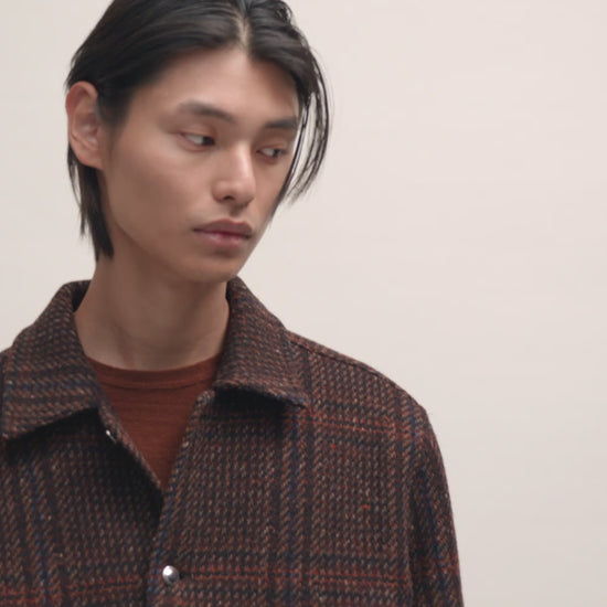 FABRIC: Loosely woven virgin wool tweed with a subtle check pattern in rich autumn hues, combining a soft hand feel with natural warmth and timeless seasonal appeal.