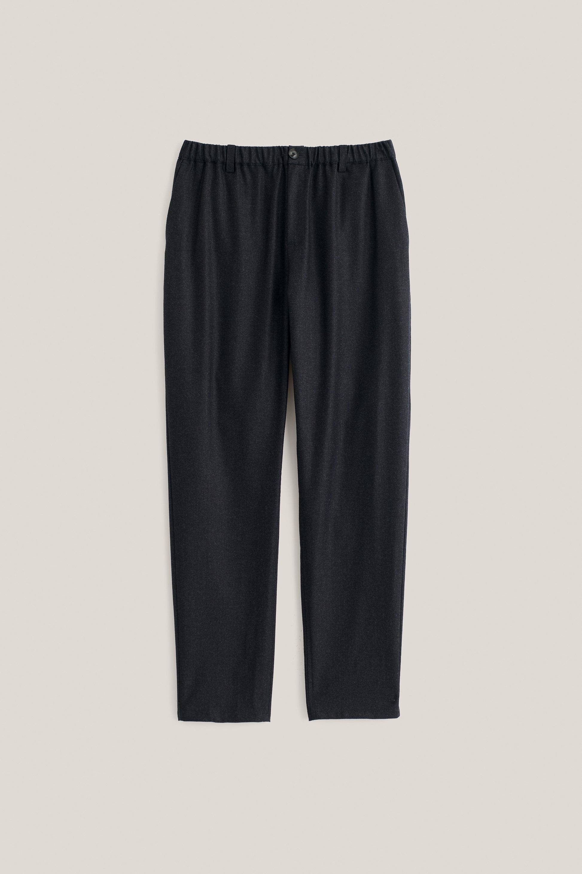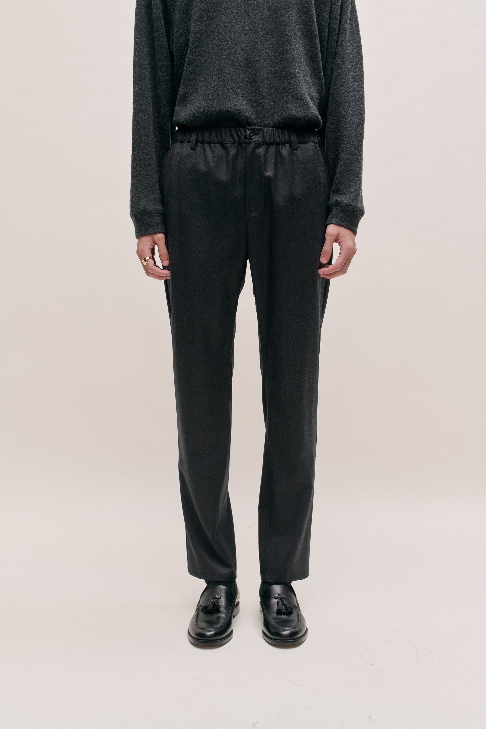 €225PRODUCT: The Elasticated Wide Trousers come with a relaxed fit and tapered leg. Featuring an elastic waistband, front zip-fly, slanted side pockets, and a singular button-closed back welt pocket.