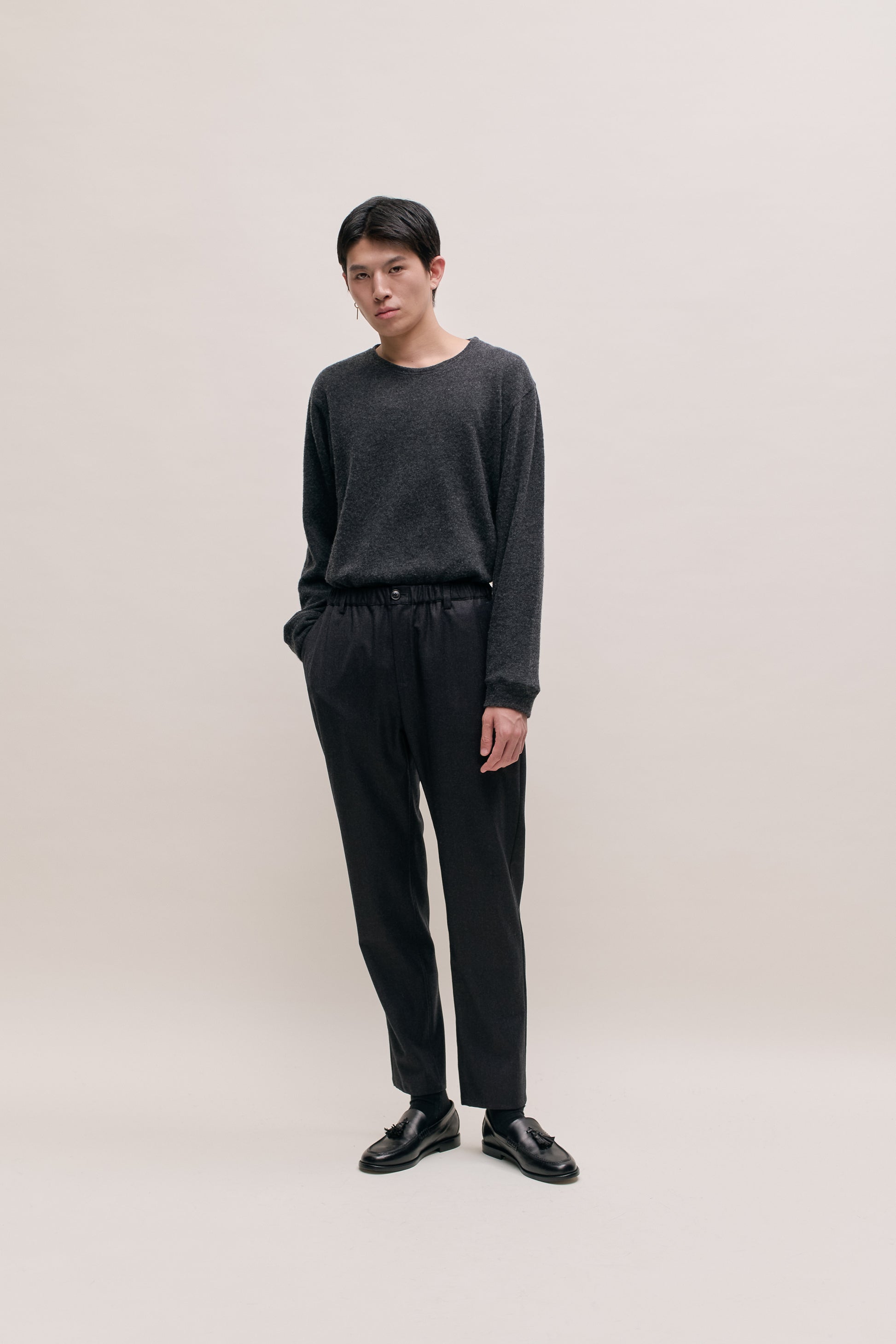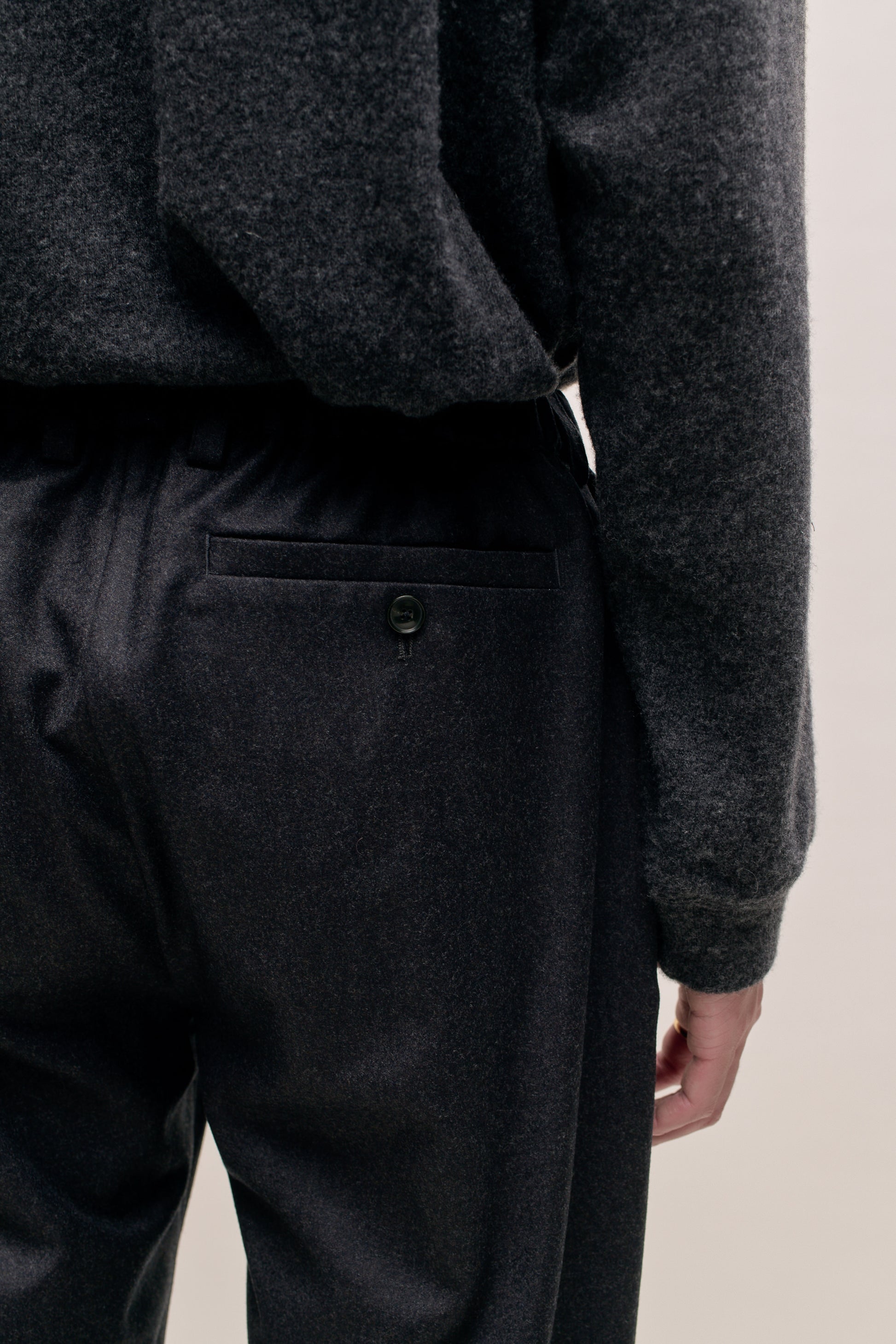 FABRIC: A lightweight flannel woven from pure virgin wool, offering a soft touch and a slightly matted surface. Its understated texture adds warmth and a sense of ease.