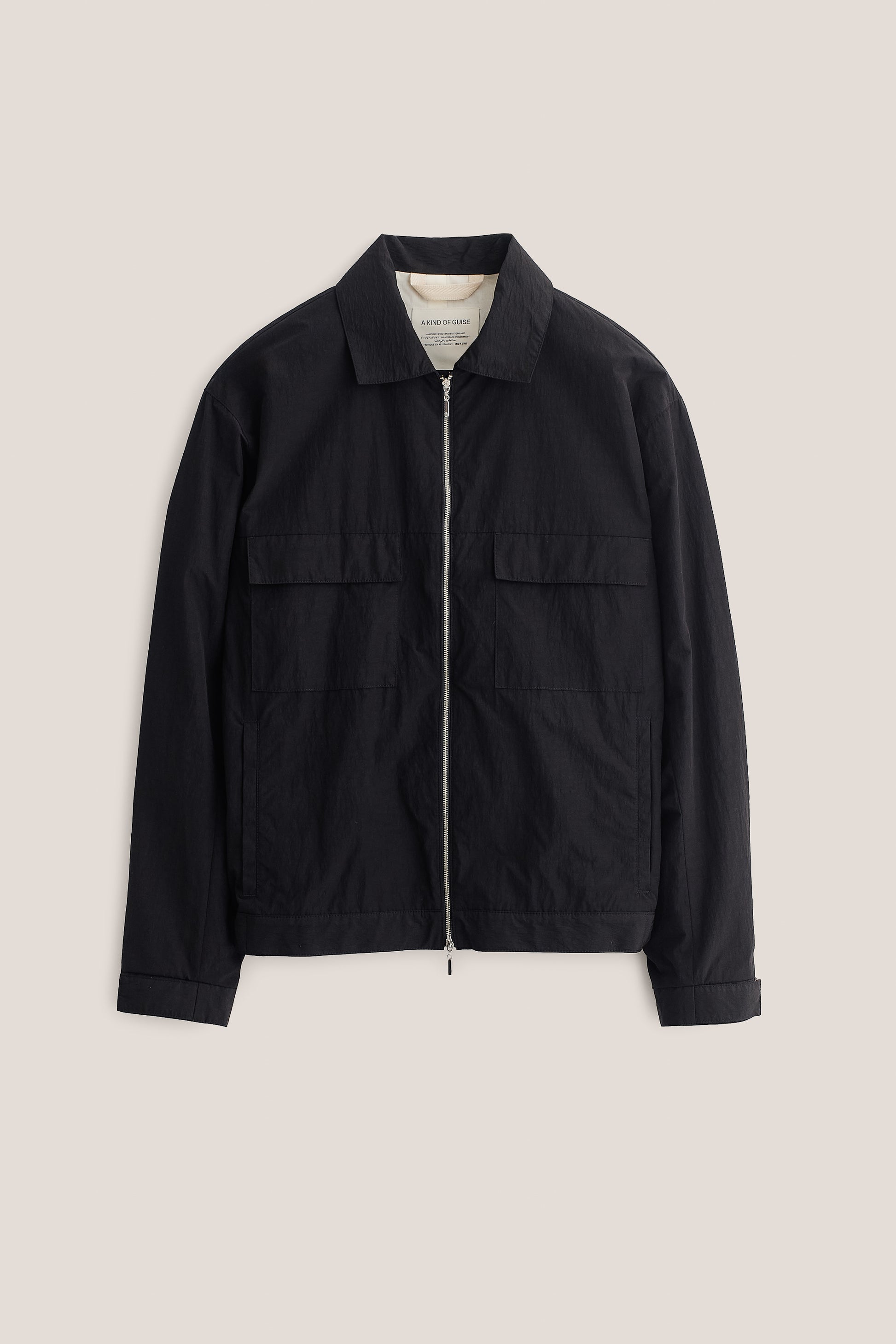 PRODUCT: A vintage-inspired jacket with a boxy, wide silhouette, flap chest pockets, and welt pockets on the sides. Finished with an elasticated waist and front zip closure.