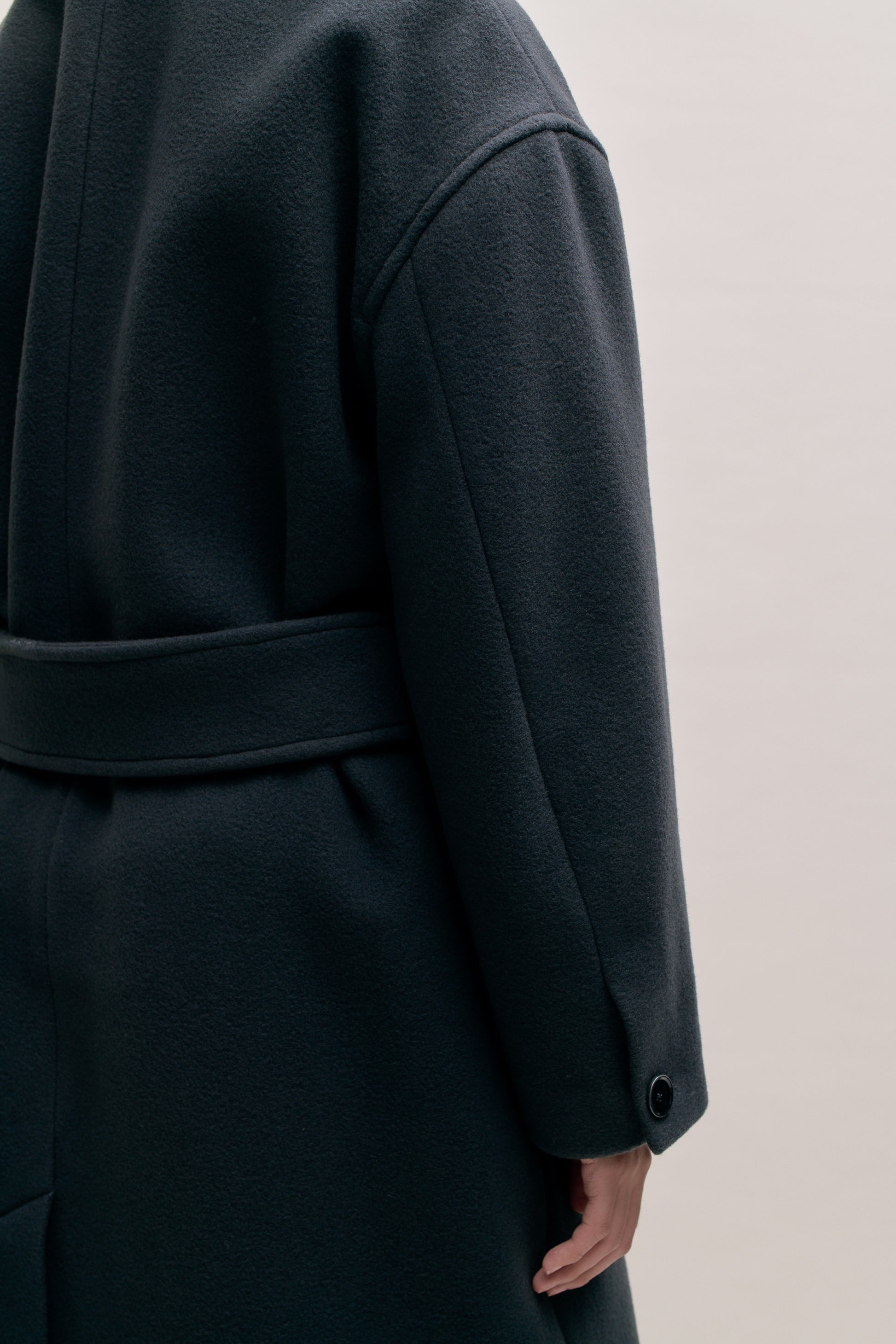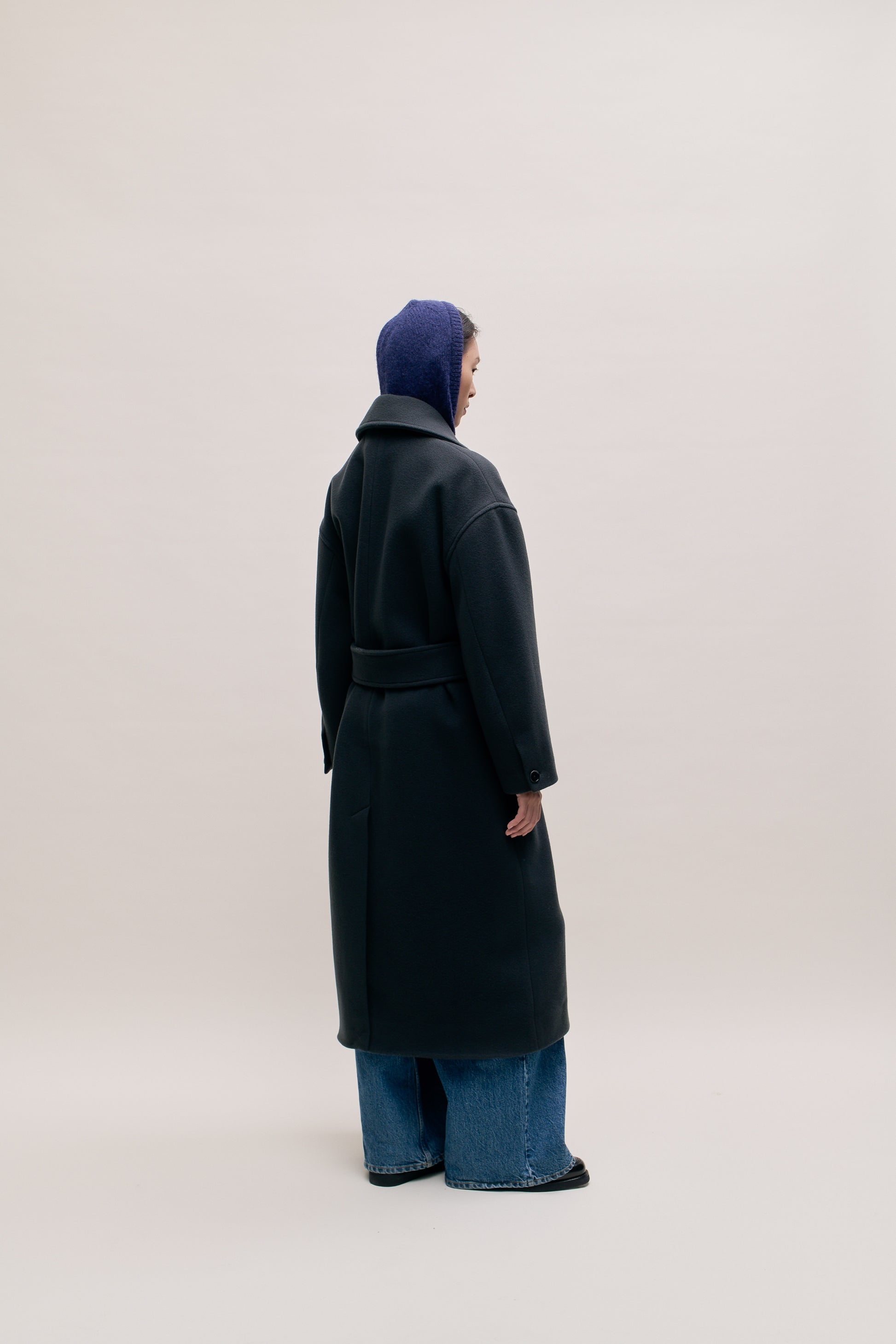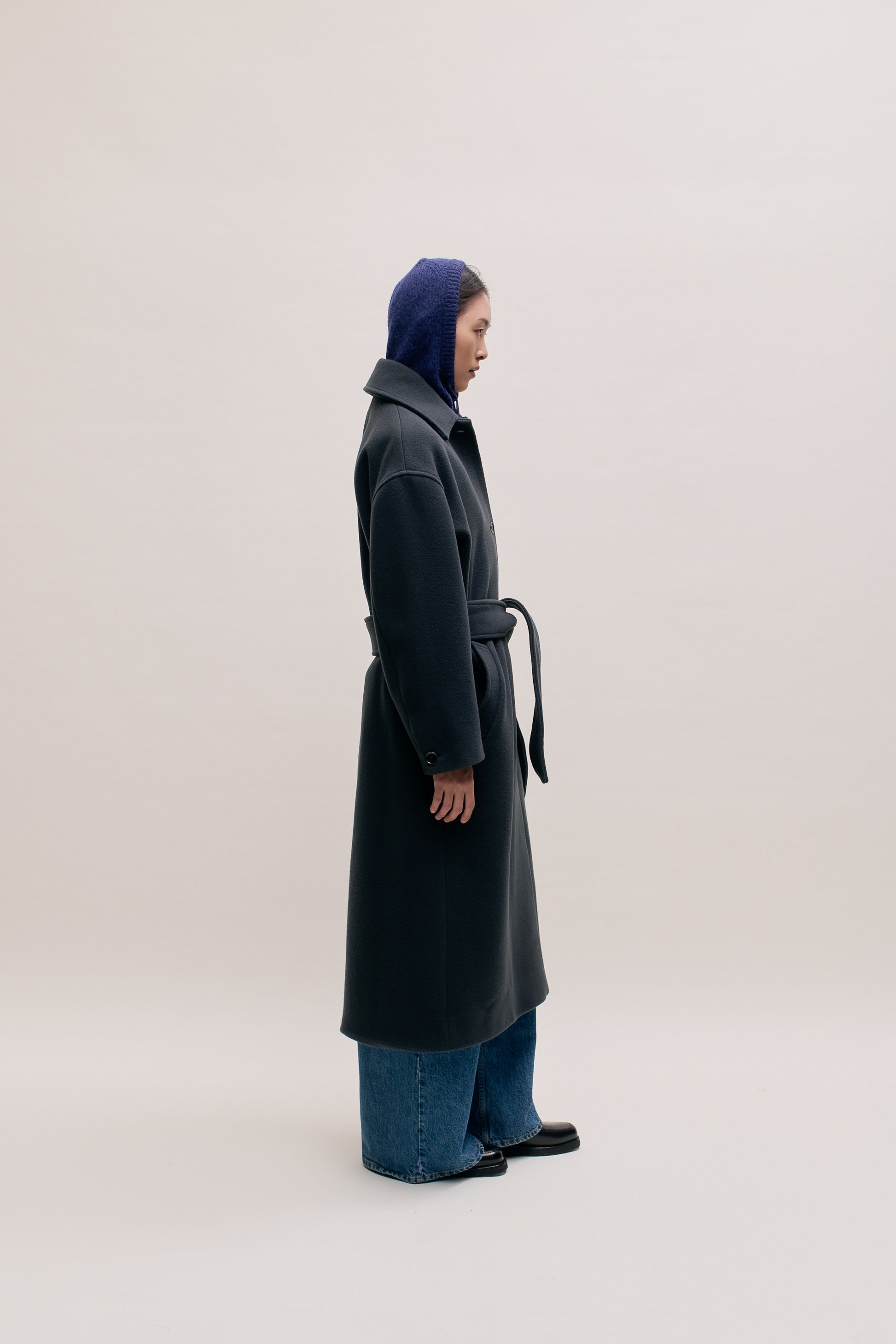 PRODUCT: Long, straight fitted, belted coat with wide lay-down collar, dropped shoulders and two slanted welt pockets. Additional inside welt pocket. Slit at back.