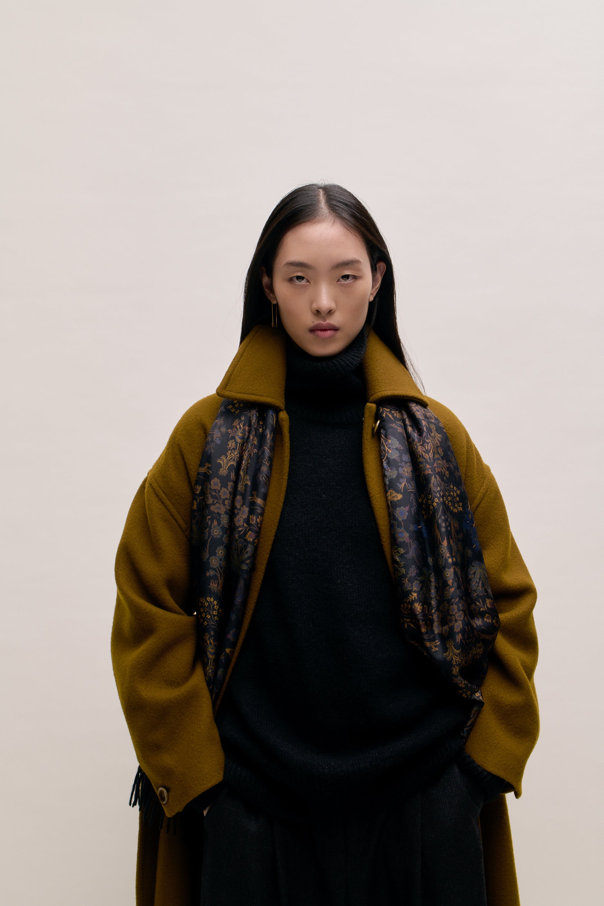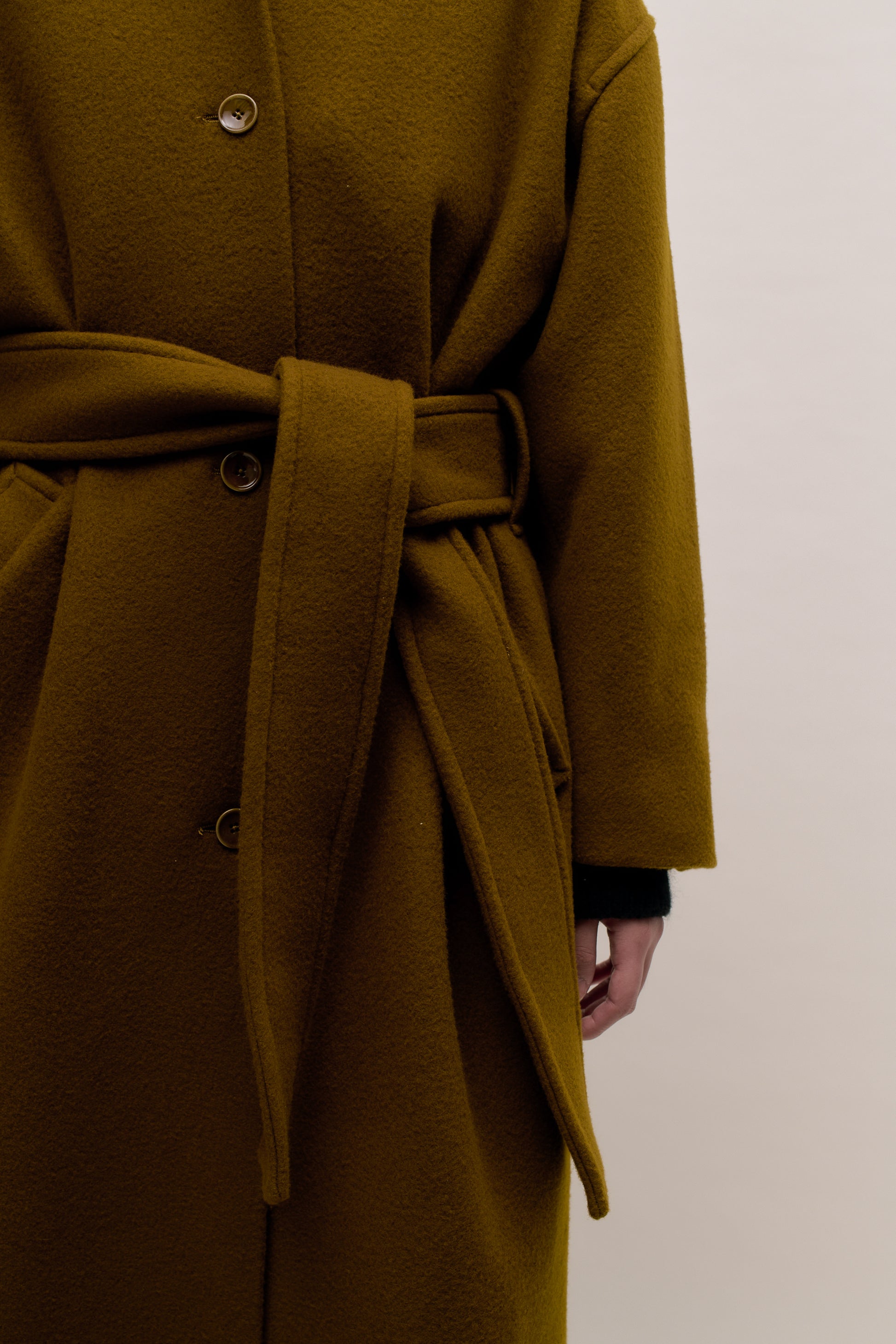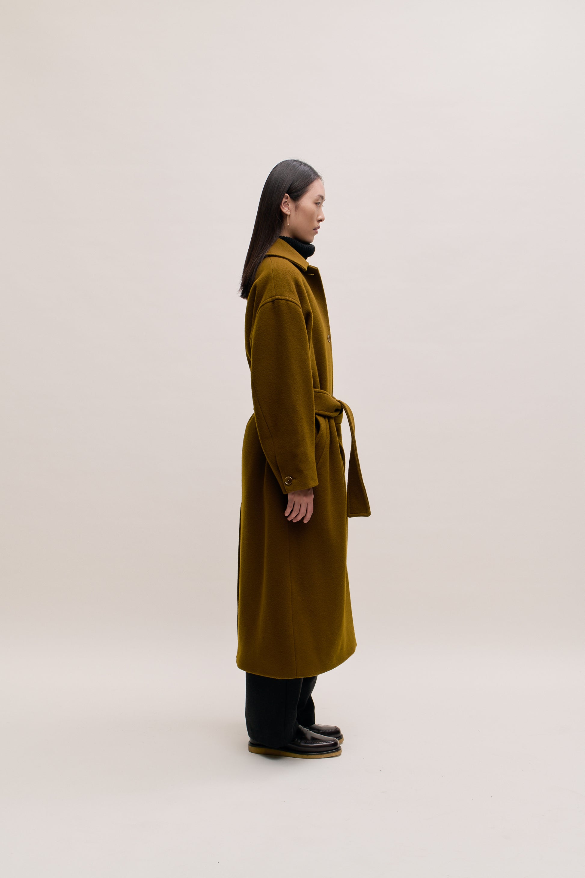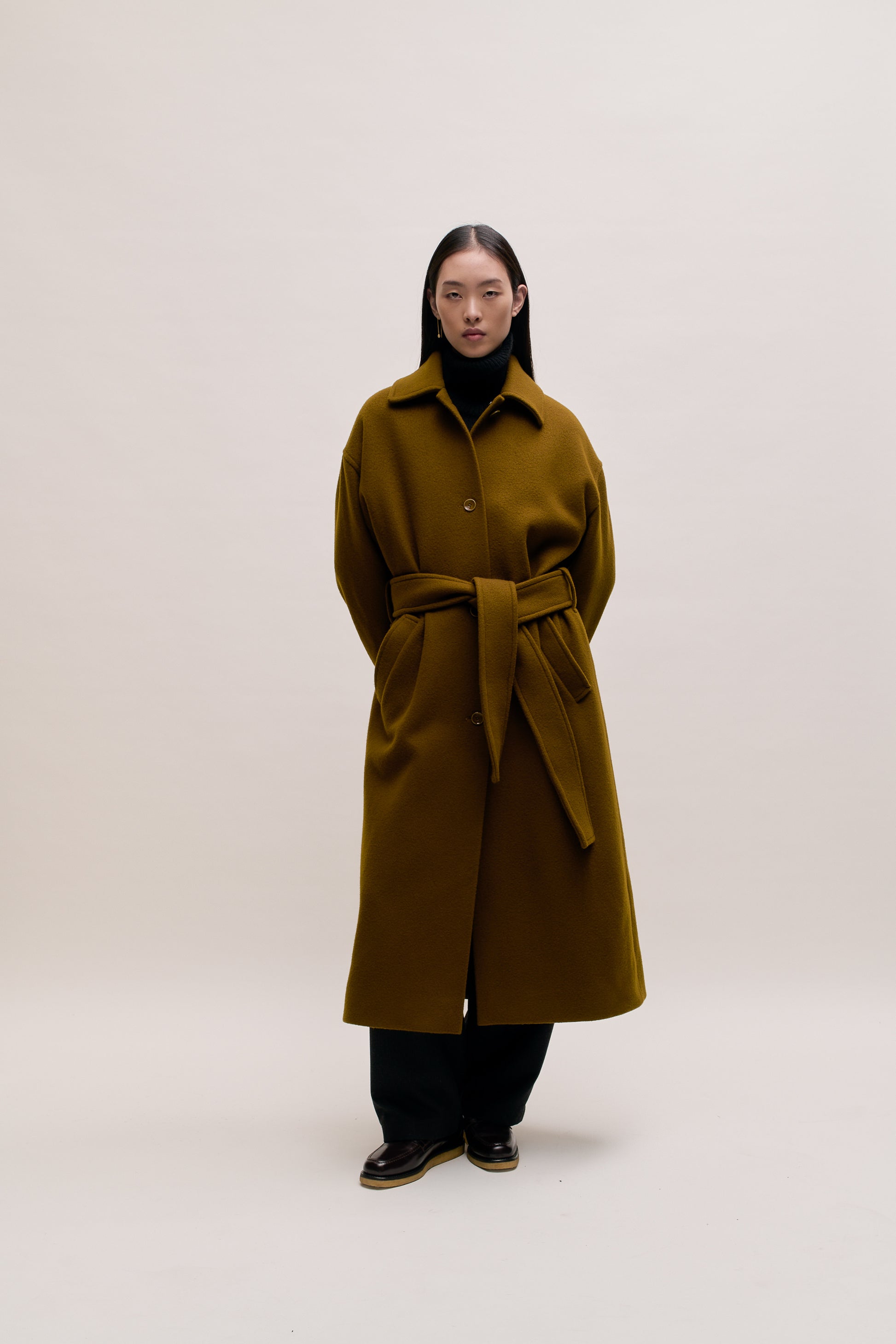 PRODUCT: Long, straight fitted, belted coat with wide lay-down collar, dropped shoulders and two slanted welt pockets. Additional inside welt pocket. Slit at back.