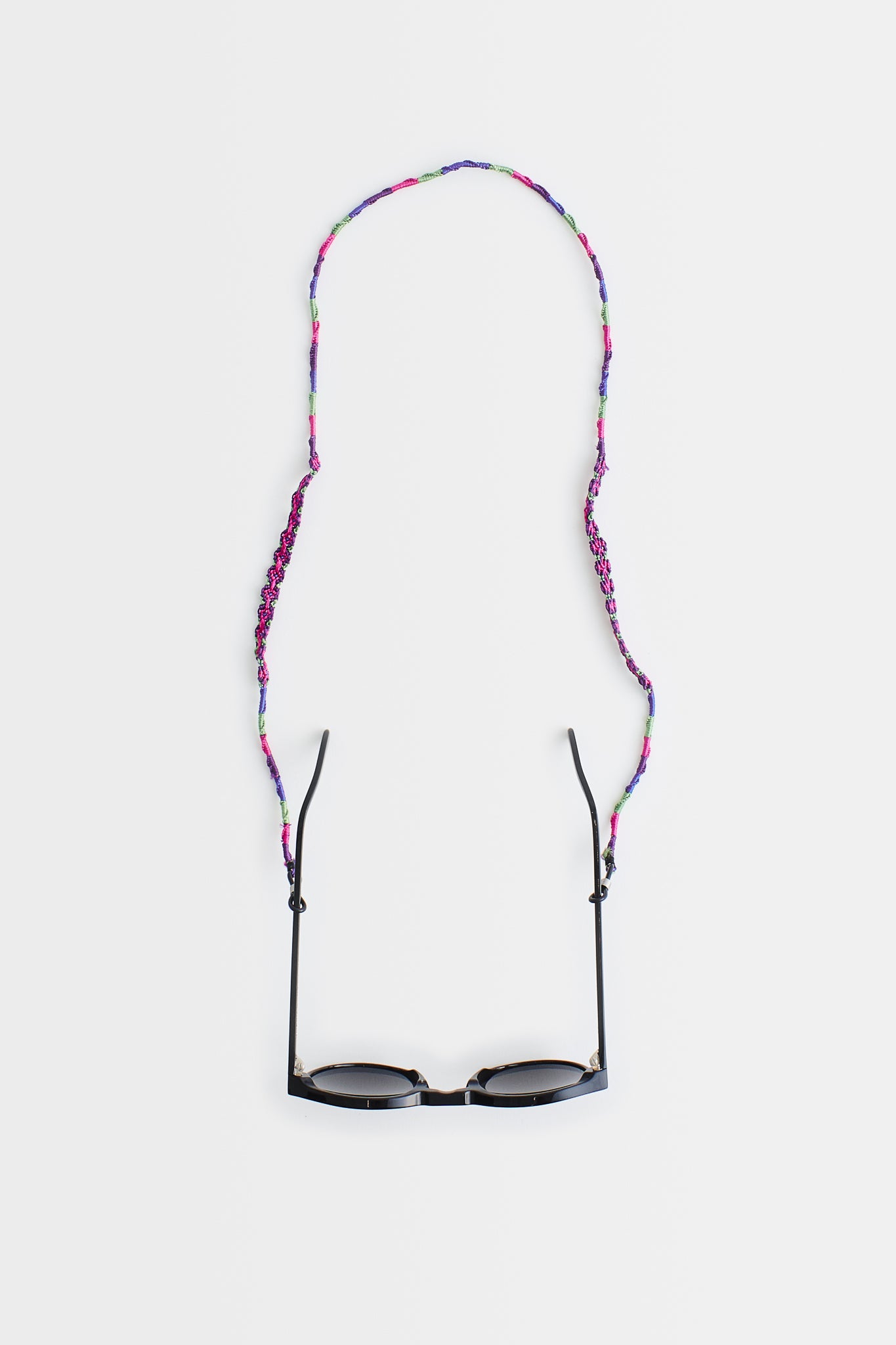 Playful and practical, the Eyewear Strap in pink twist brings a vibrant splash of color to your everyday essentials. Made from tightly knotted threads in shades of pink, violet, and green, this accessory keeps your sunglasses close while adding a handcrafted touch to your summer look. Lightweight and flexible, it’s a cheerful companion for sunny days.