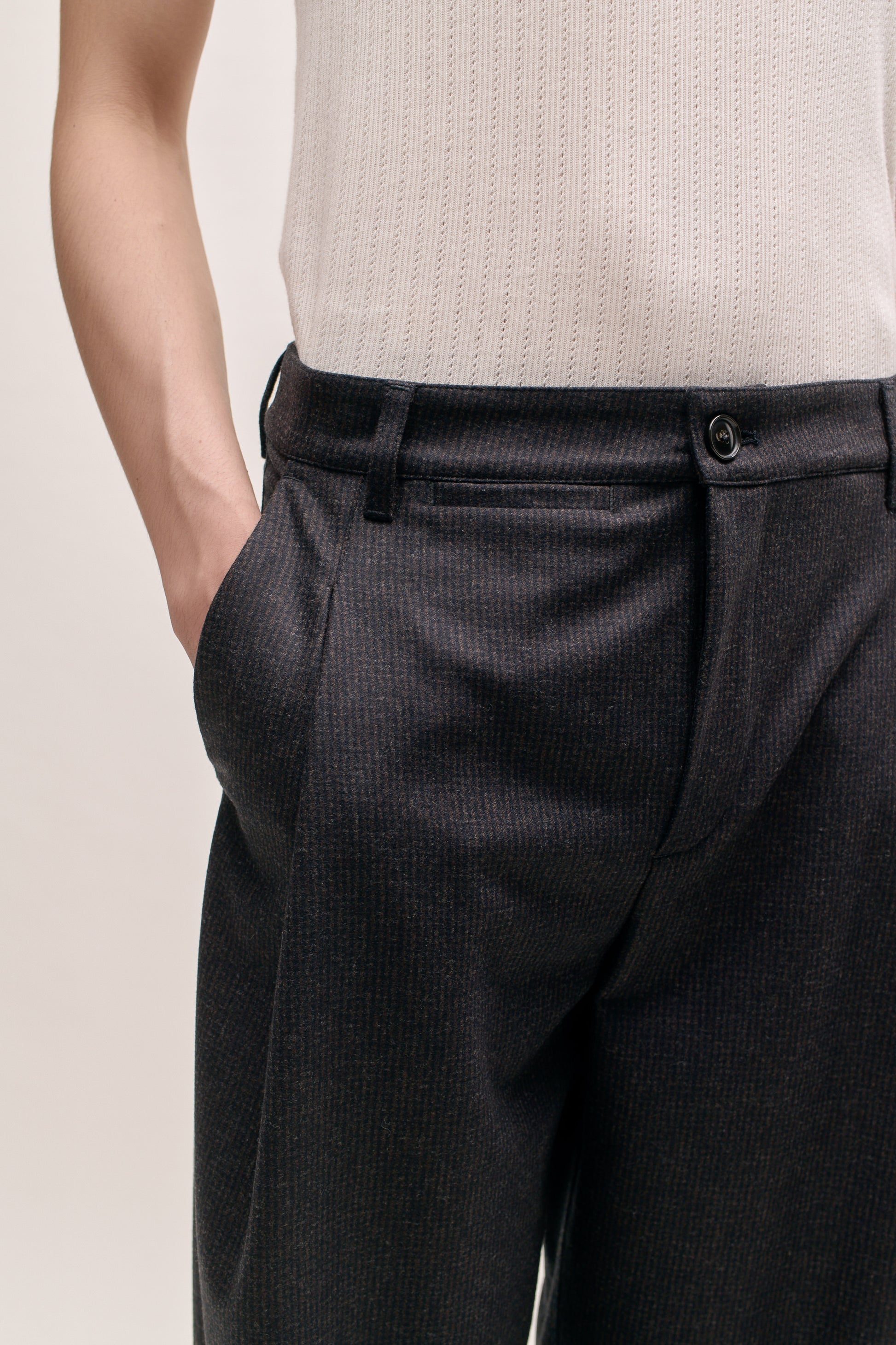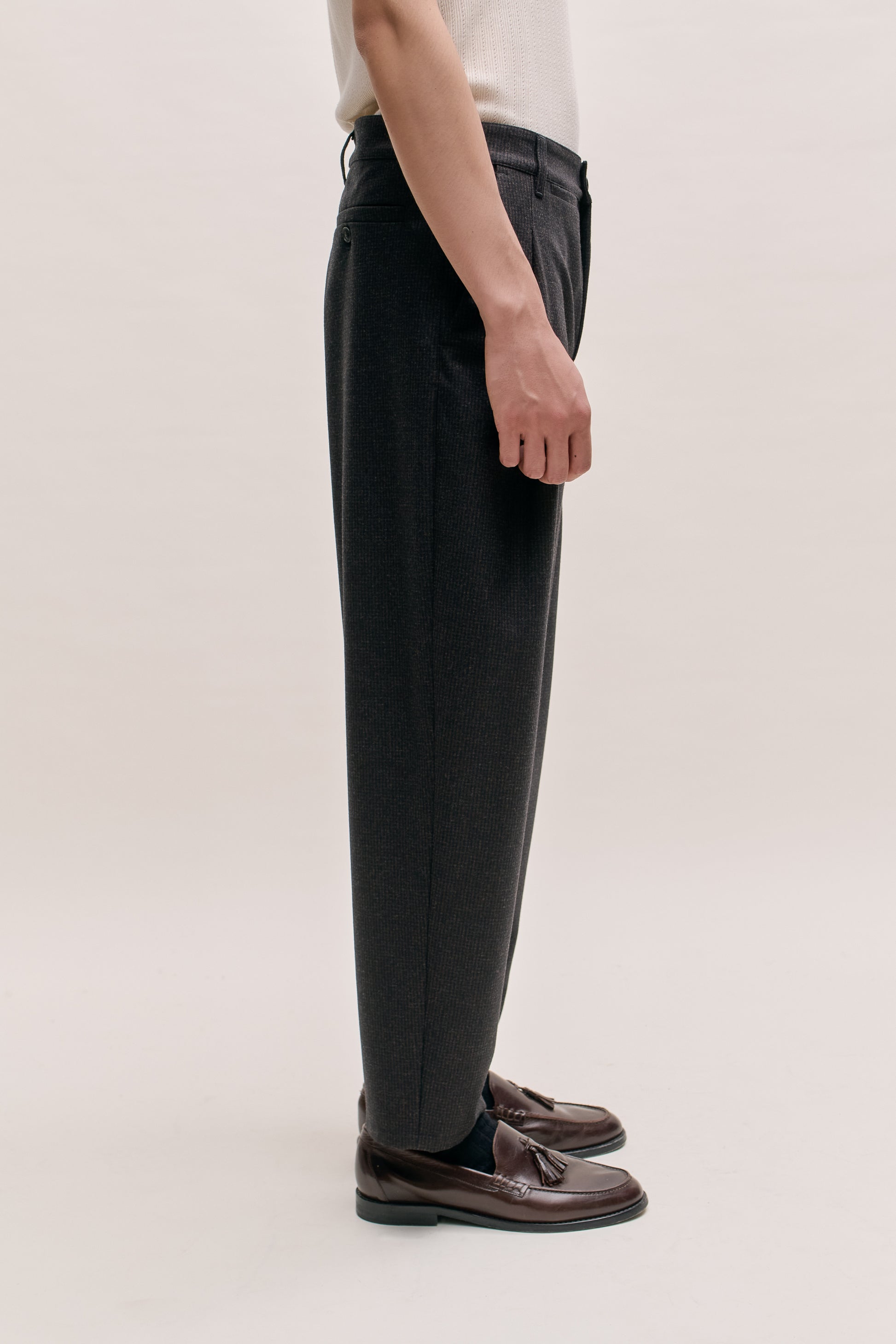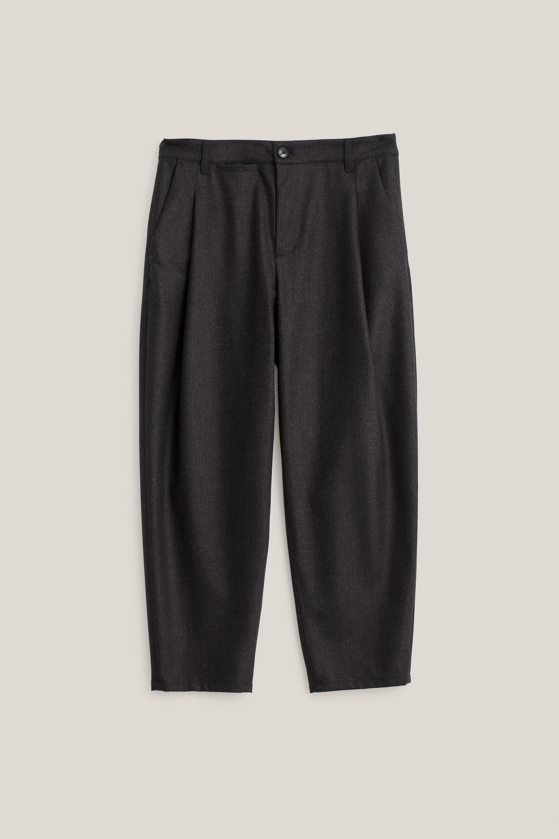 €235PRODUCT: Pleated Trousers with a relaxed, casual fit. Featuring slanted side pockets, a small coin pocket and a welt pocket with a button closure at the back.