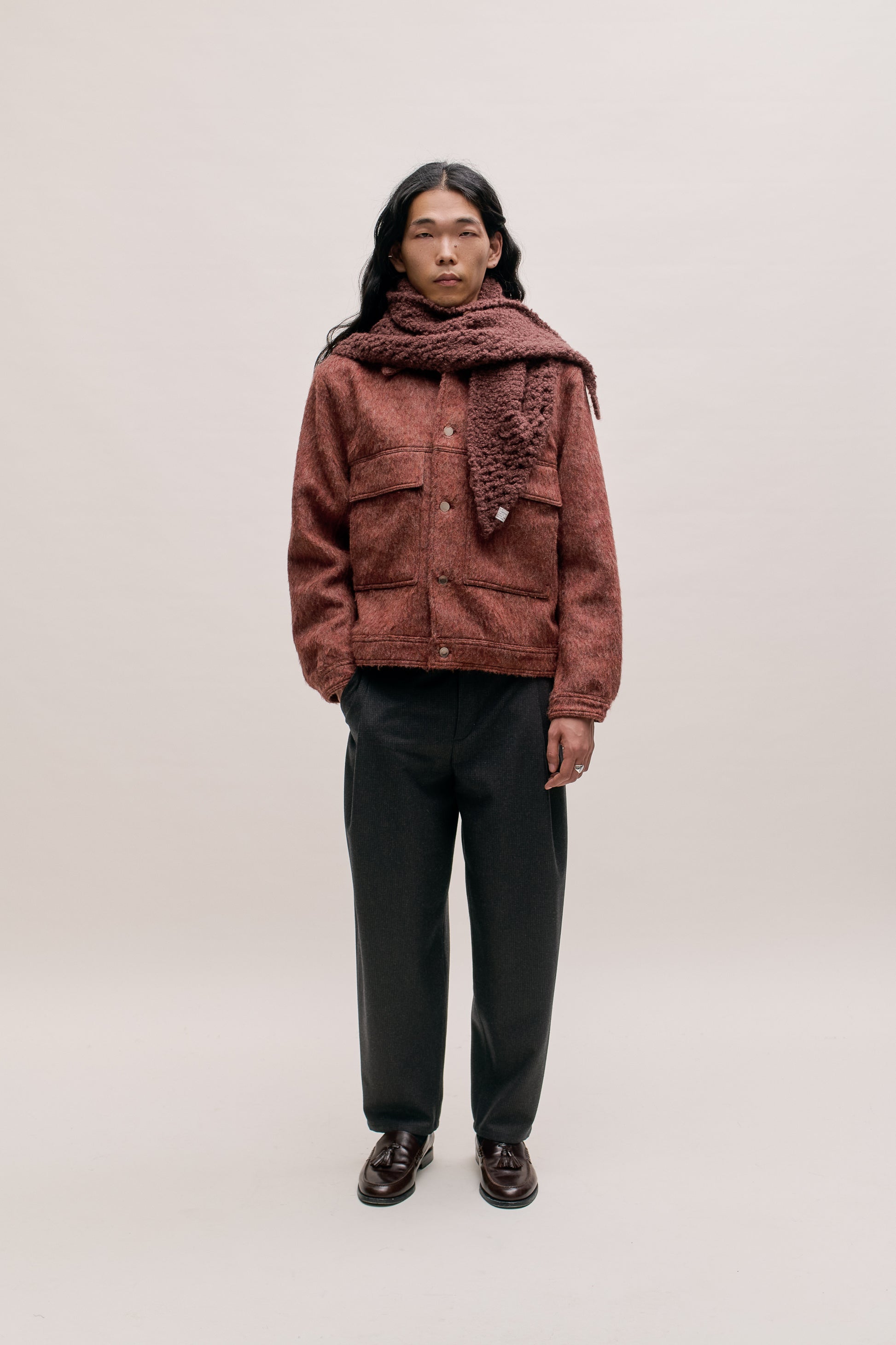 FABRIC: A soft flannel fabric woven from virgin wool, featuring a classic houndstooth pattern. Lightly brushed for warmth and comfort, with a naturally soft, textured feel.