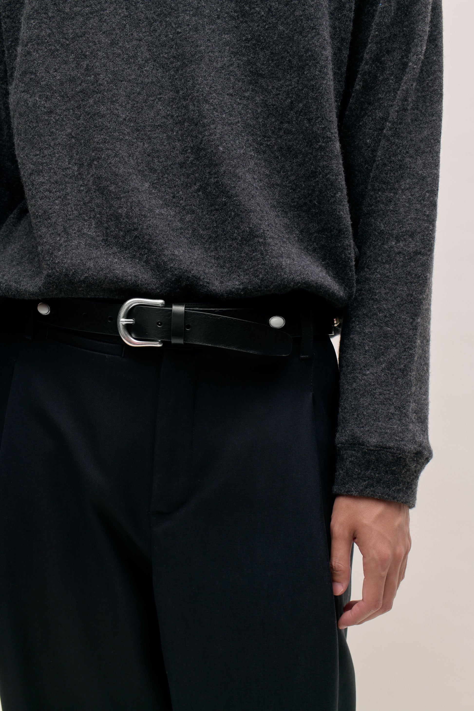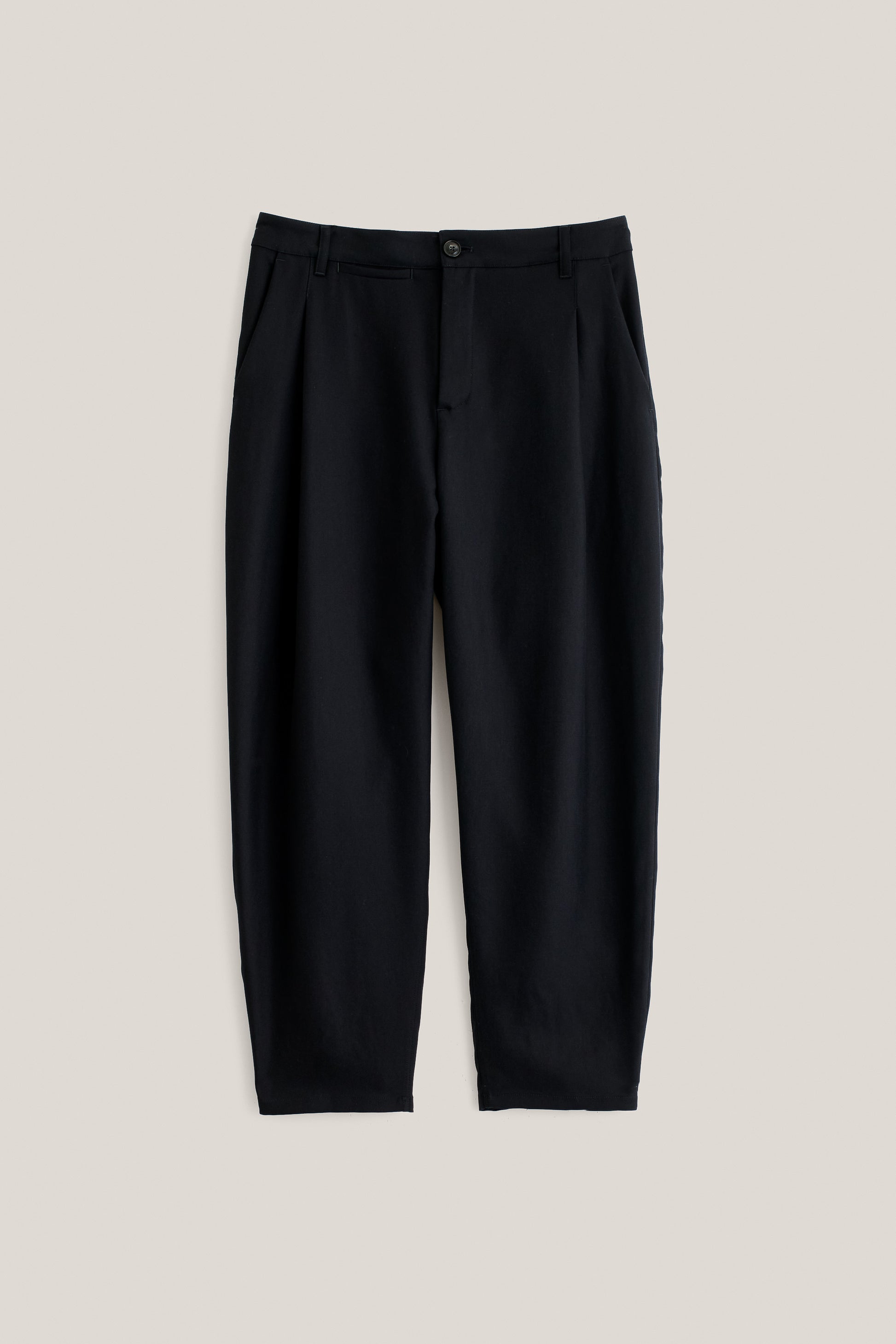 €235PRODUCT: Pleated Trousers With a relaxed, casual fit. Featuring slanted side pockets, a small coin pocket and a welt pocket with a button closure at the back.