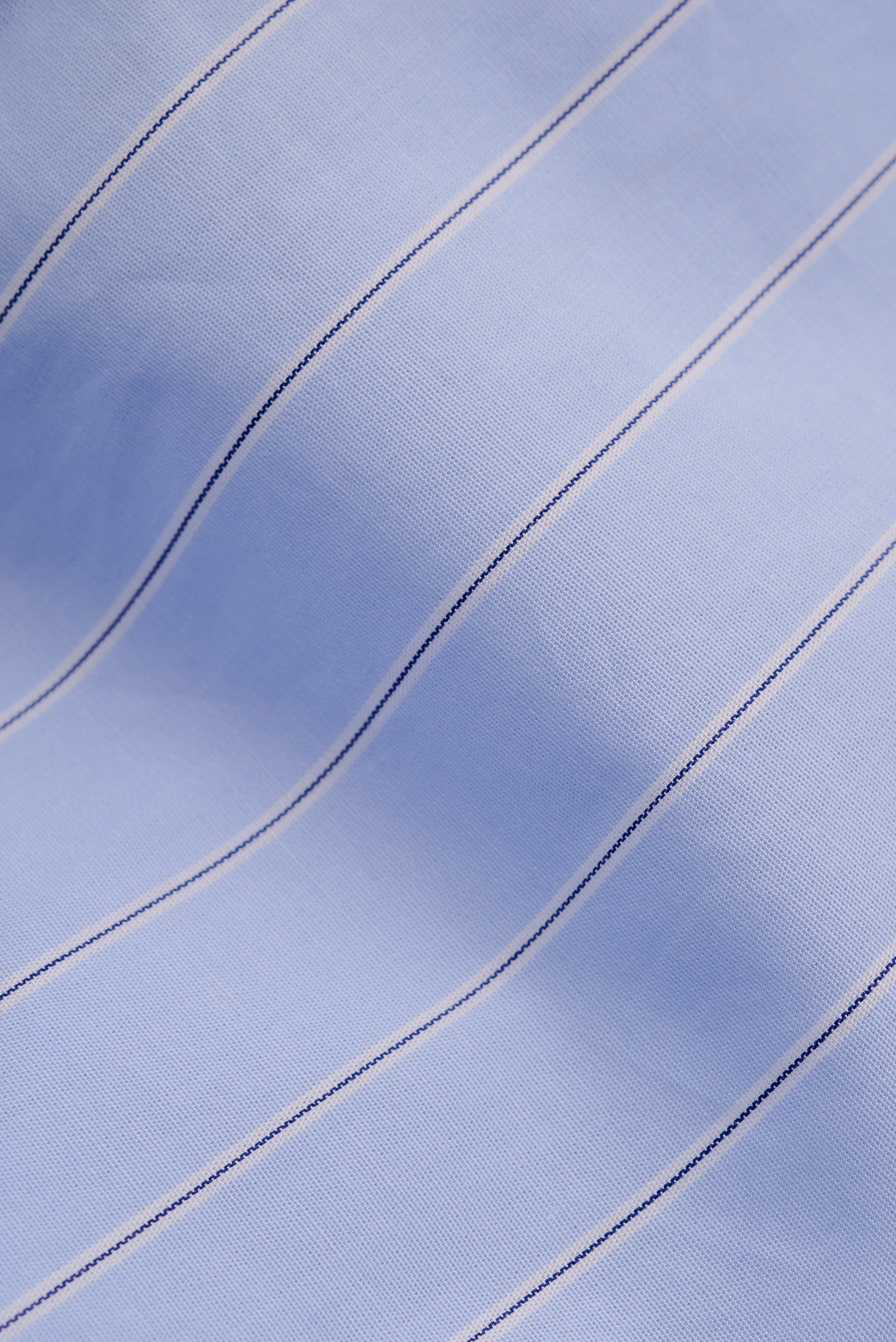 FABRIC: A lightweight organic cotton fabric in soft blue with fine vertical pinstripes. Pre-washed for reduced shrinkage, with a smooth texture and airy feel.