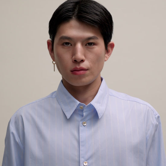 PRODUCT: A shirt with a pointed collar, slightly curved hem, two-hole mother-of-pearl buttons, and two back pleats. It features a slightly overcut shoulder and a loose fit around the body.