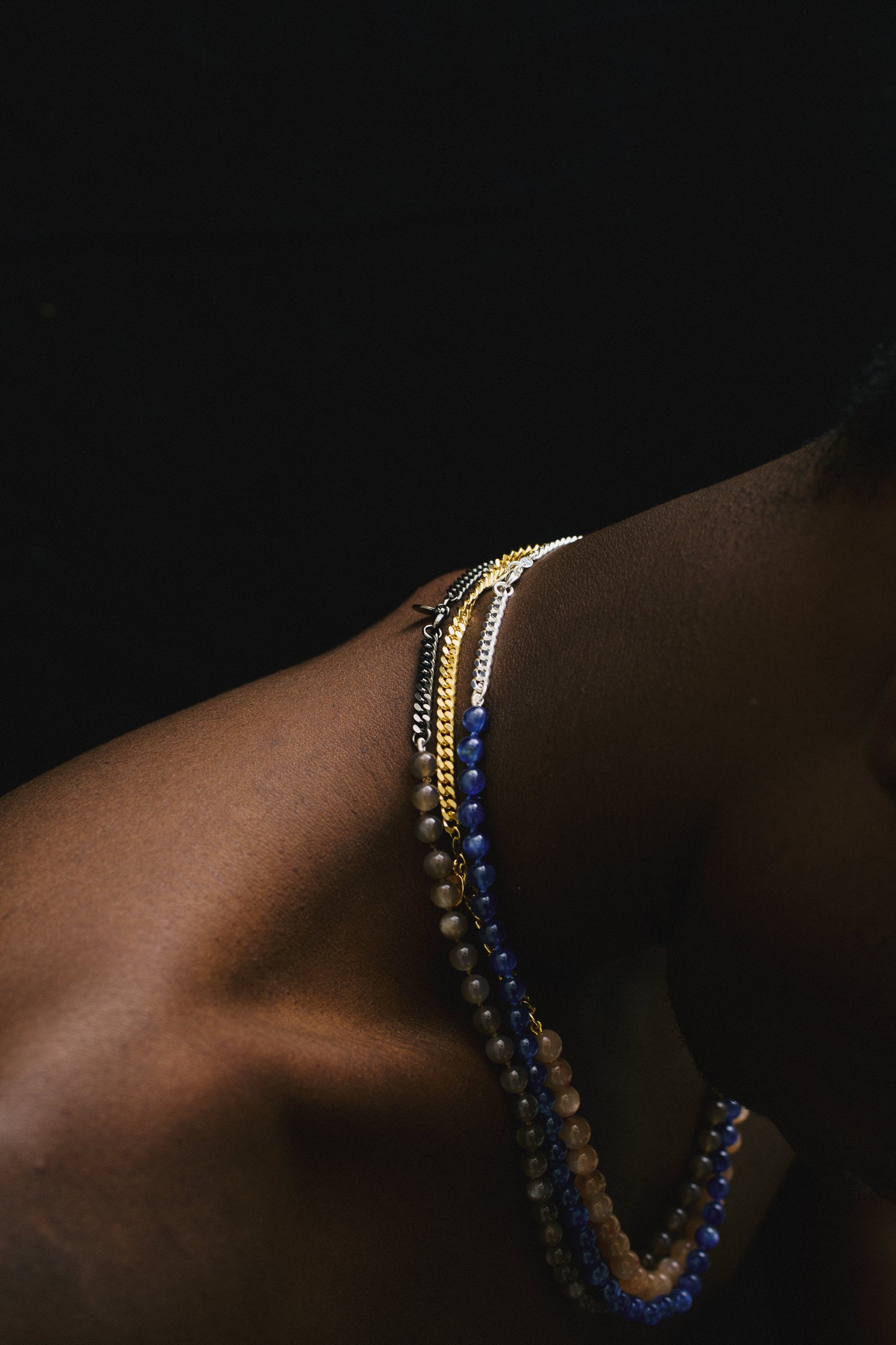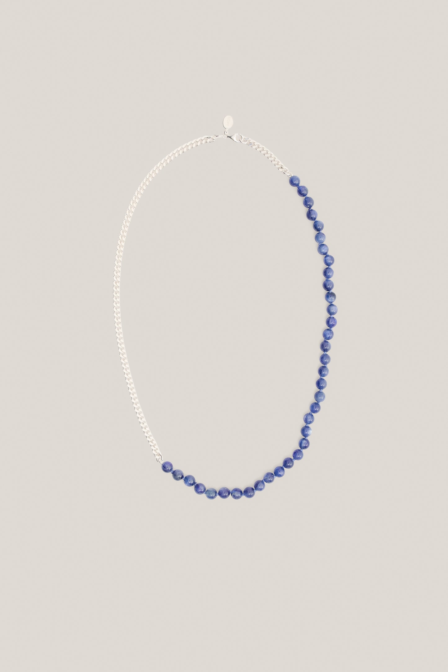 PRODUCT: This unisex necklace combines a 4mm armored chain and round semi-precious stone beads. It has a clasp for fastening between metal and stone chain.