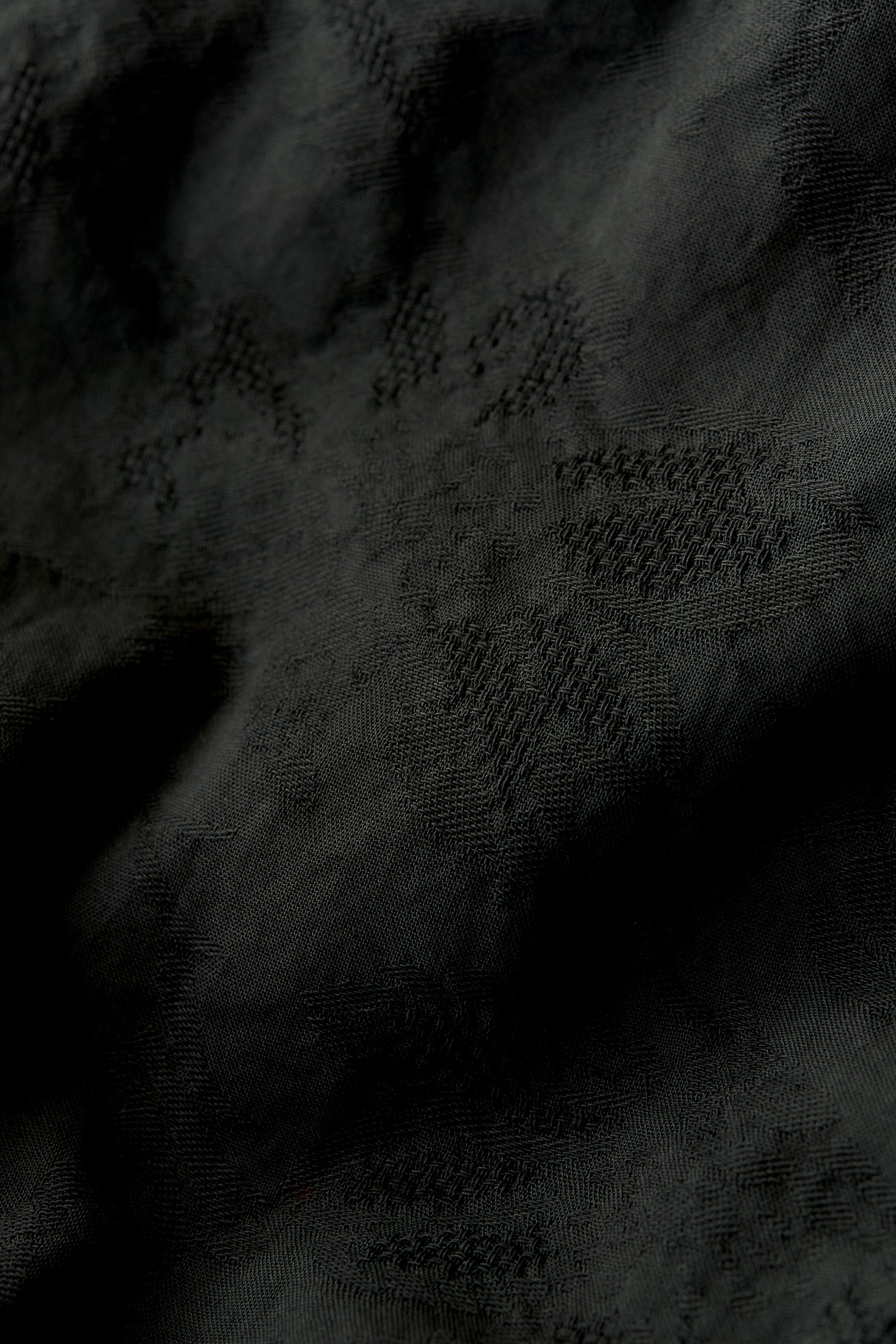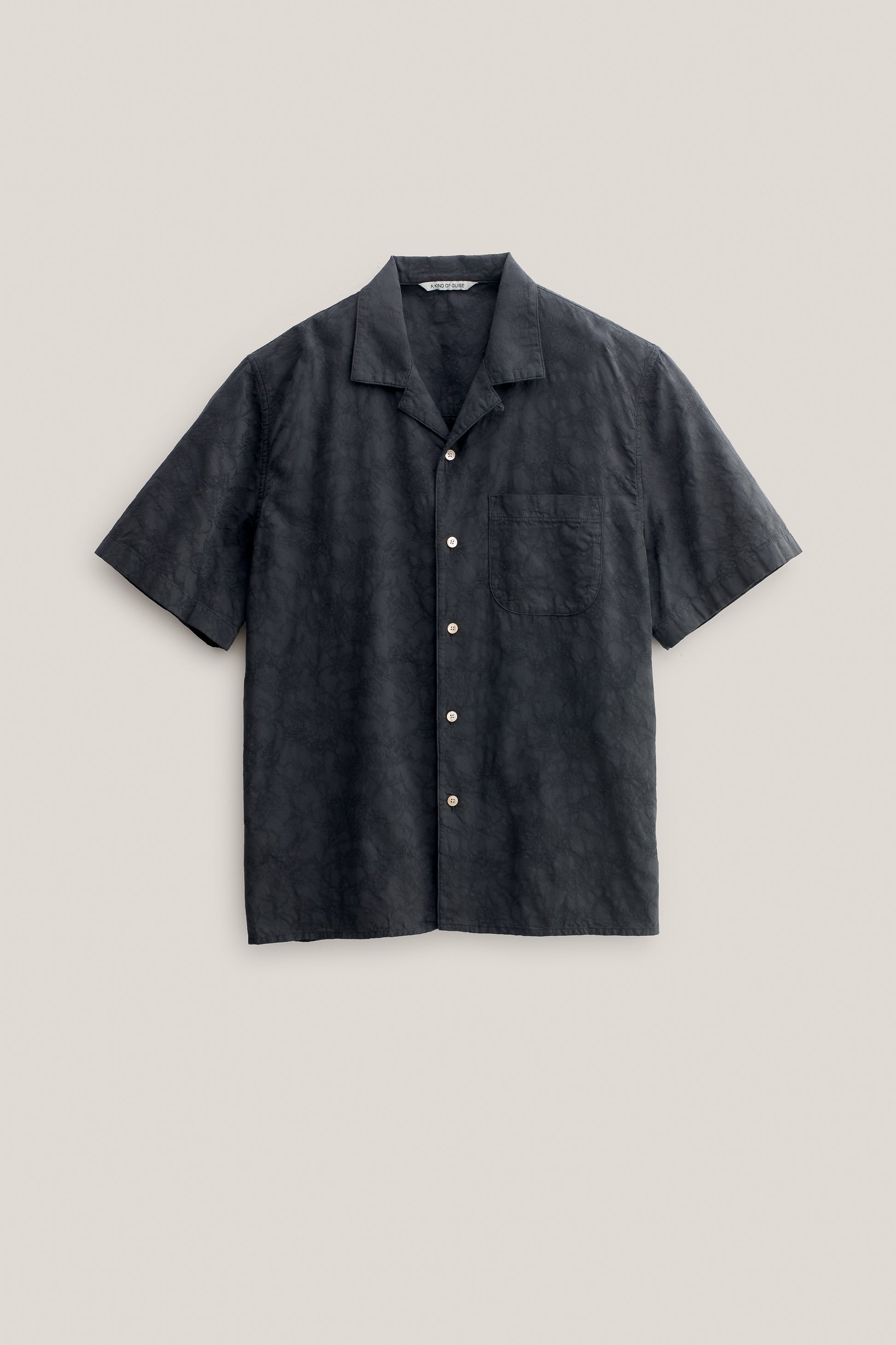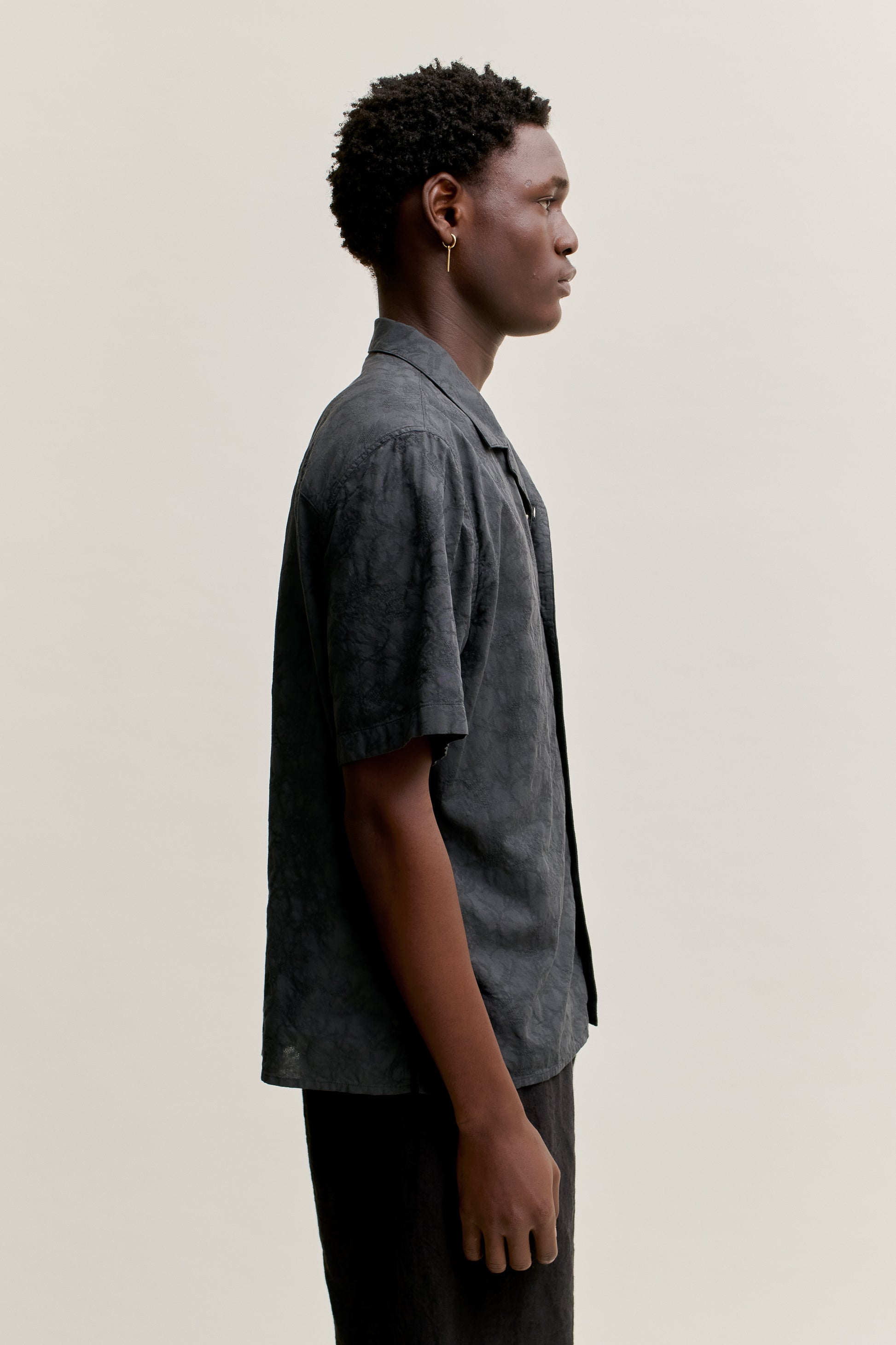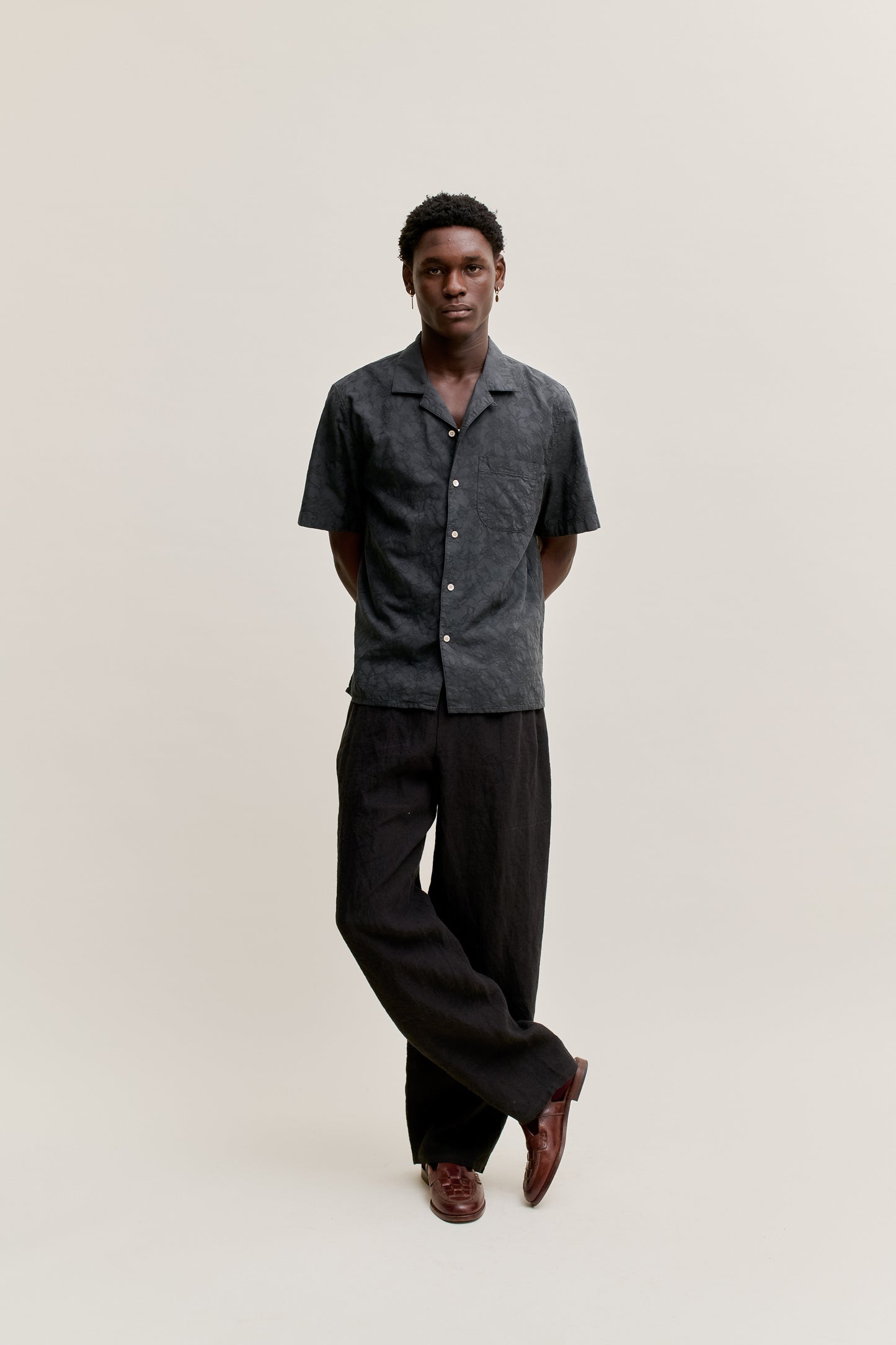 Our classic short-sleeved Gioia Shirt, features a spread collar, a chest pocket, a straight hemline, and is finished with elegant mother-of-pearl buttons. This version comes in a rich black coffee tone and is crafted from an airy, garment-dyed Italian cotton jacquard. The fabric offers a distinctive texture and breathable feel, making it perfect for warmer days.