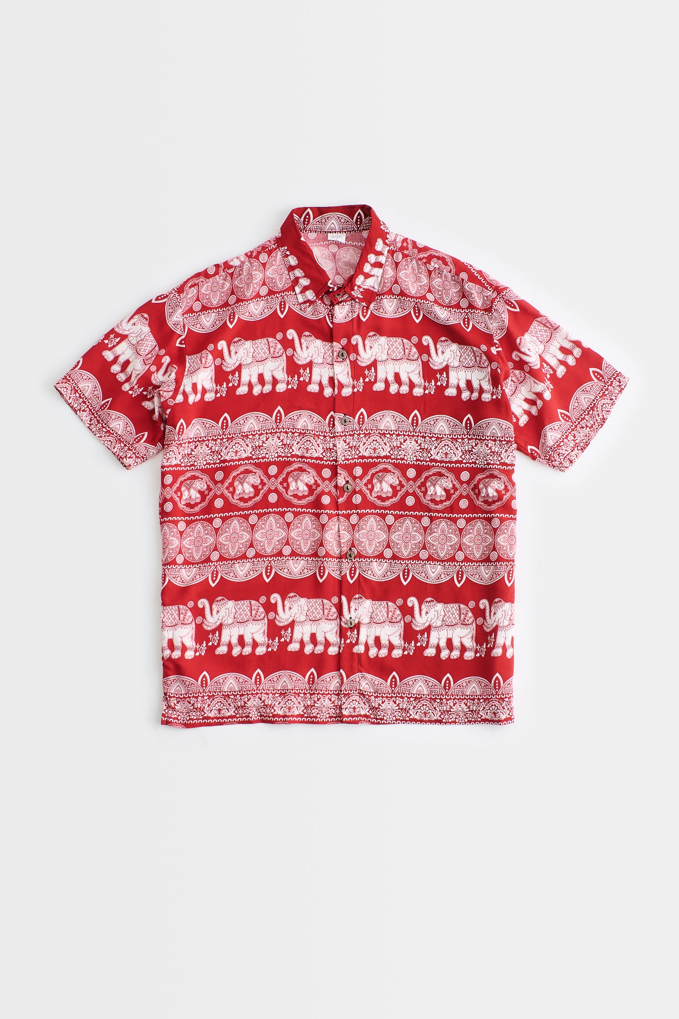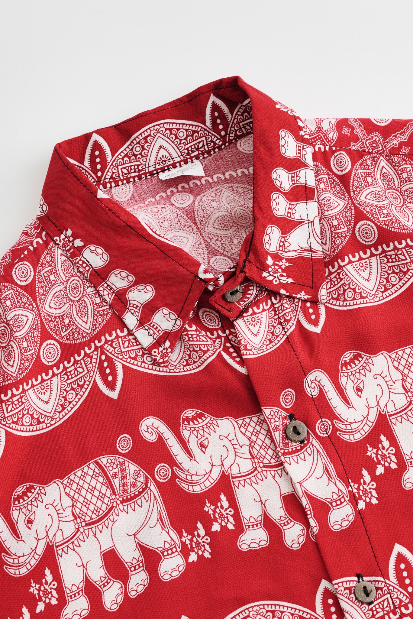 A summer staple with a playful twist: this short-sleeved button-up comes in a bold red-and-white elephant print inspired by traditional South Asian textiles. The pattern features ornate borders and majestic elephants, arranged in rhythmic horizontal bands. With a relaxed silhouette and soft touch, it’s perfect for warm days.