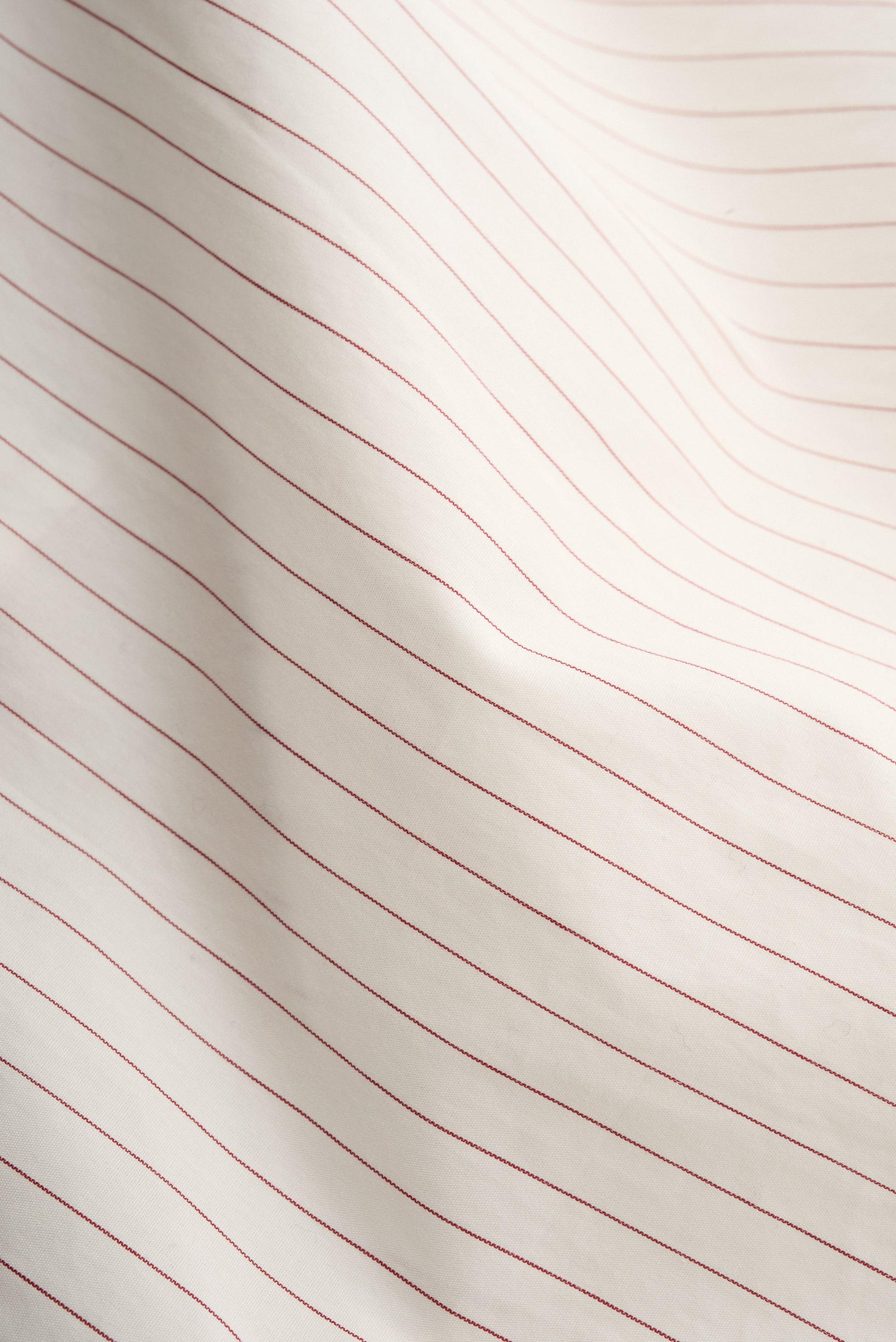 FABRIC: This 100% cotton fabric from Spain features an off-white base with delicate burgundy pinstripes, creating a refined and distinctive pattern.