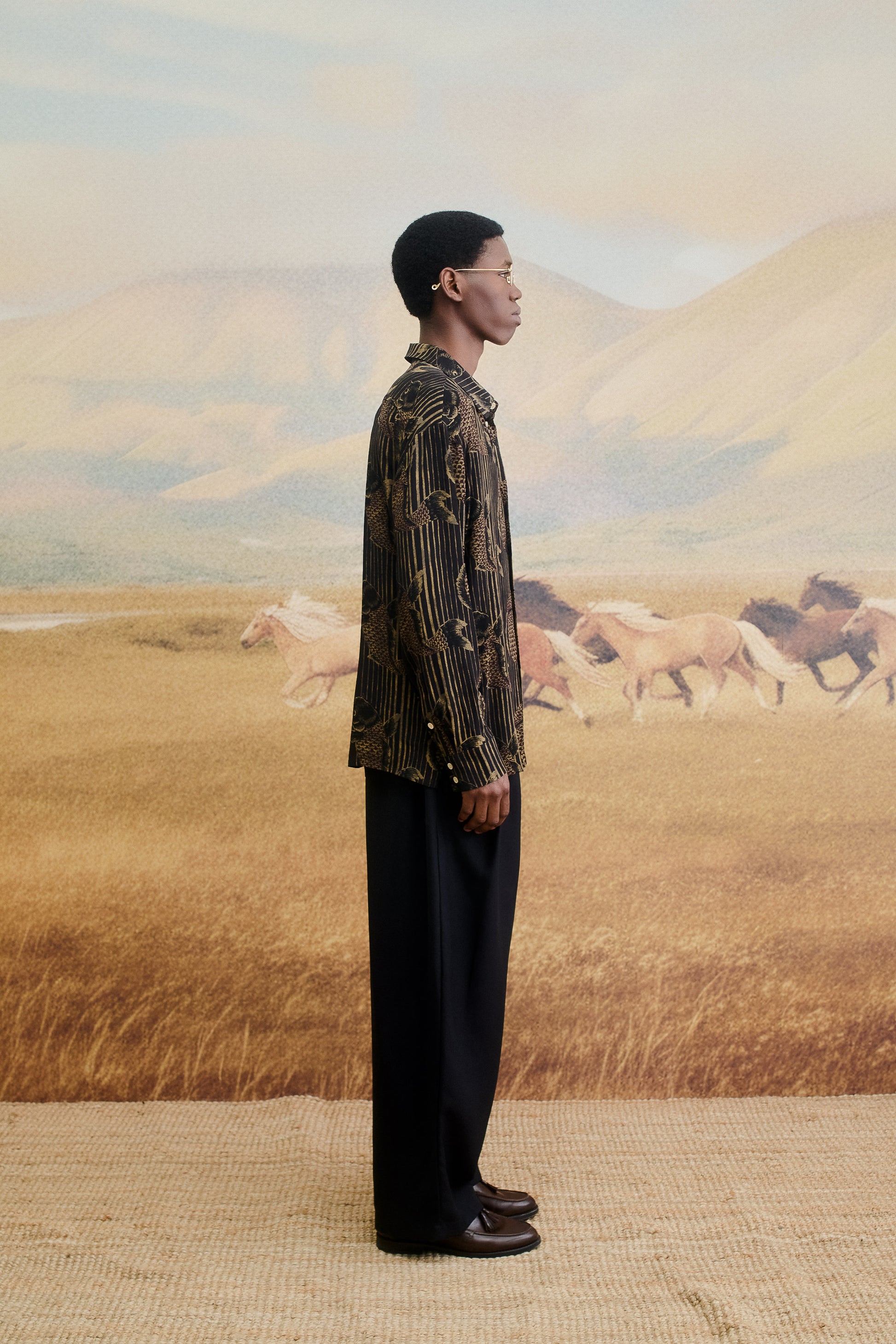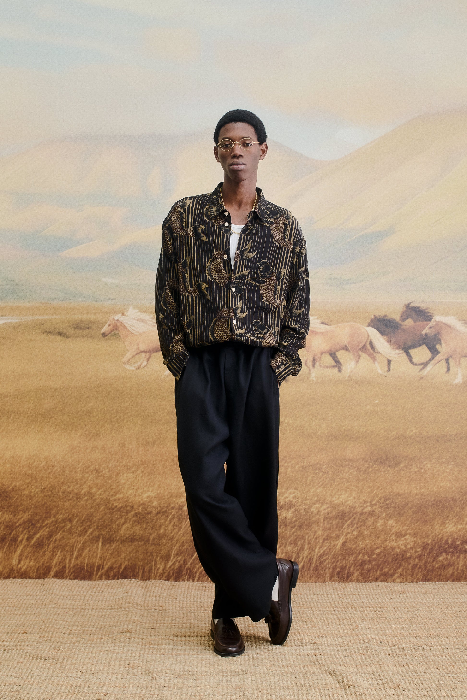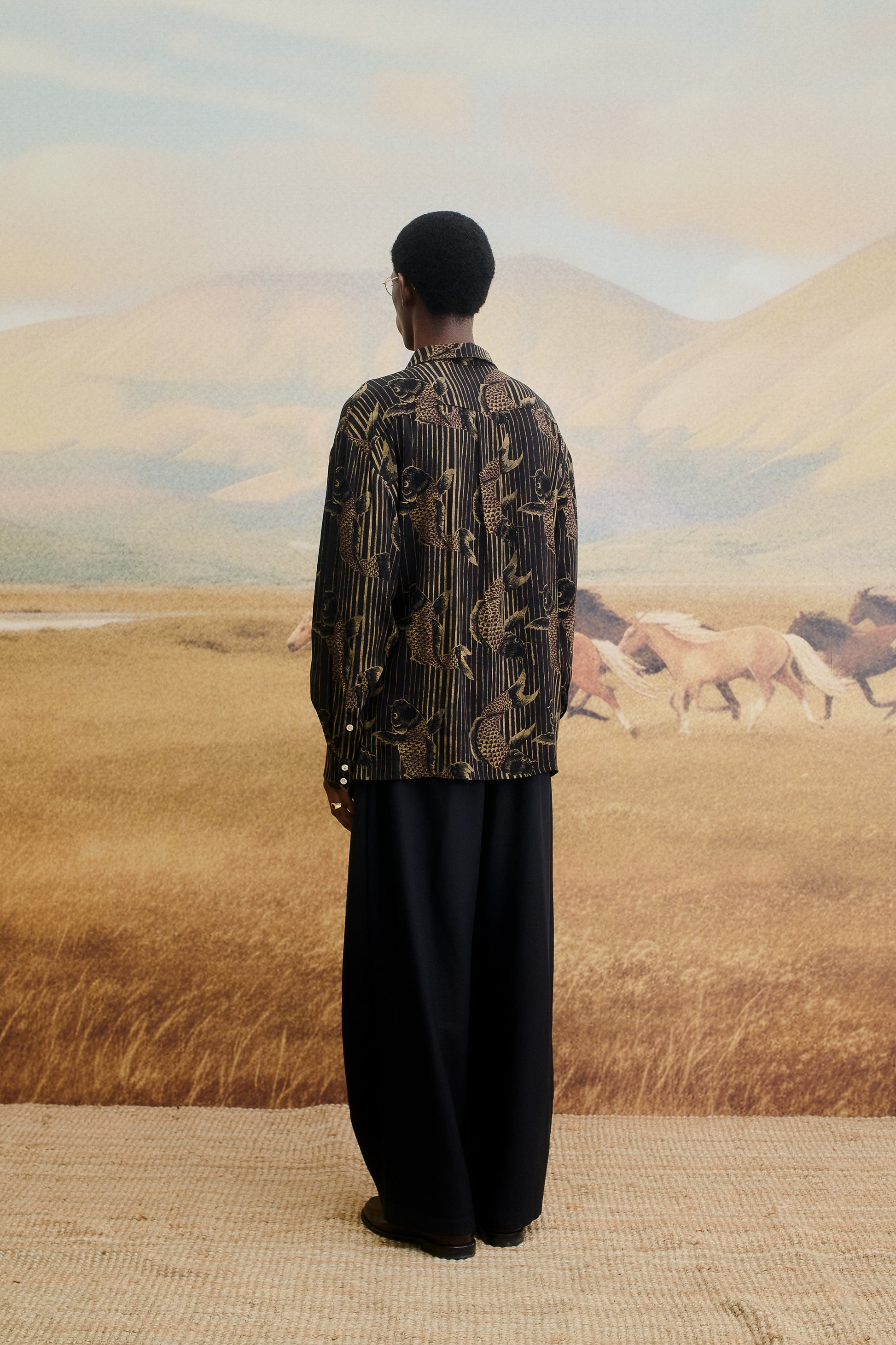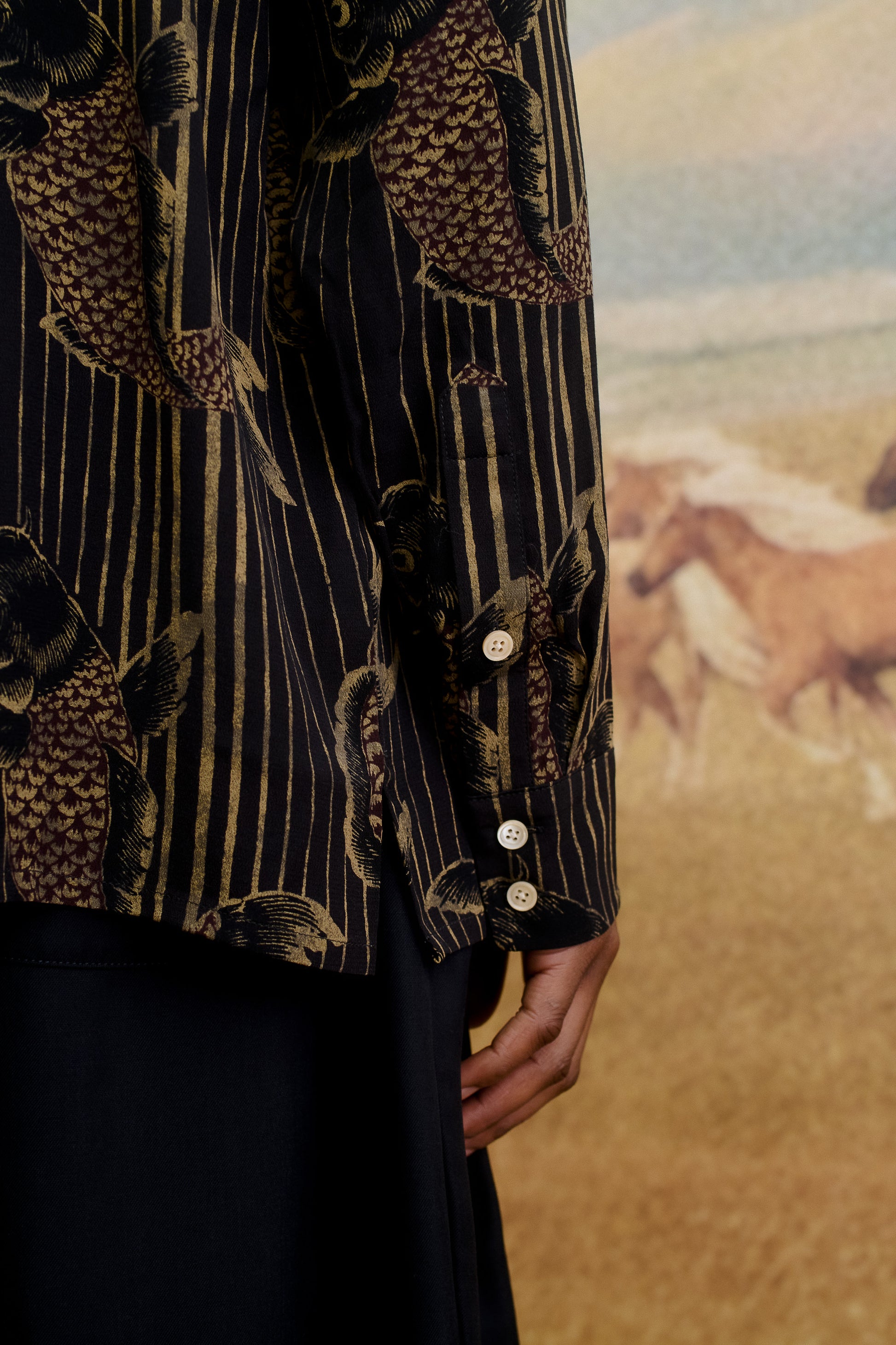 FABRIC: This Gusto Shirt features an intricate all-over Koi fish print, gracefully set against vertical stripes for a refined contrast. A fluid fabric featuring a soft drape and smooth hand feel.