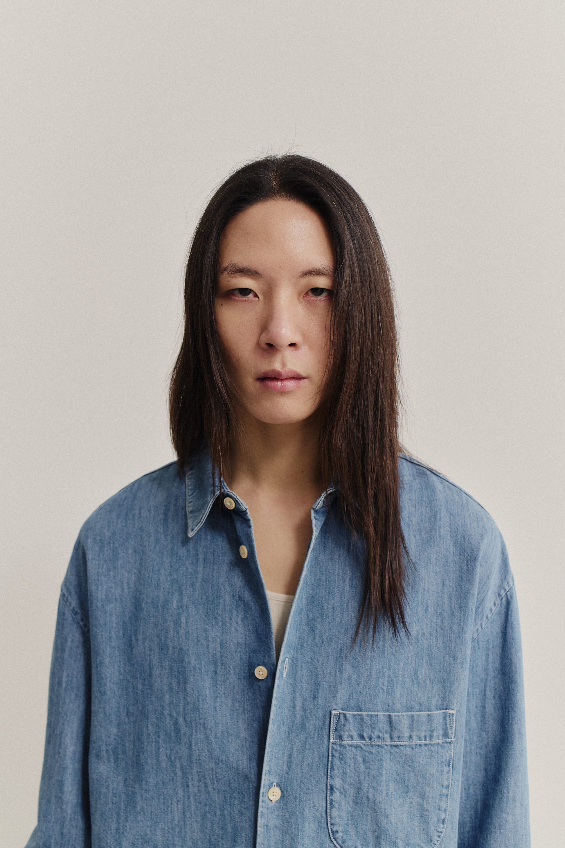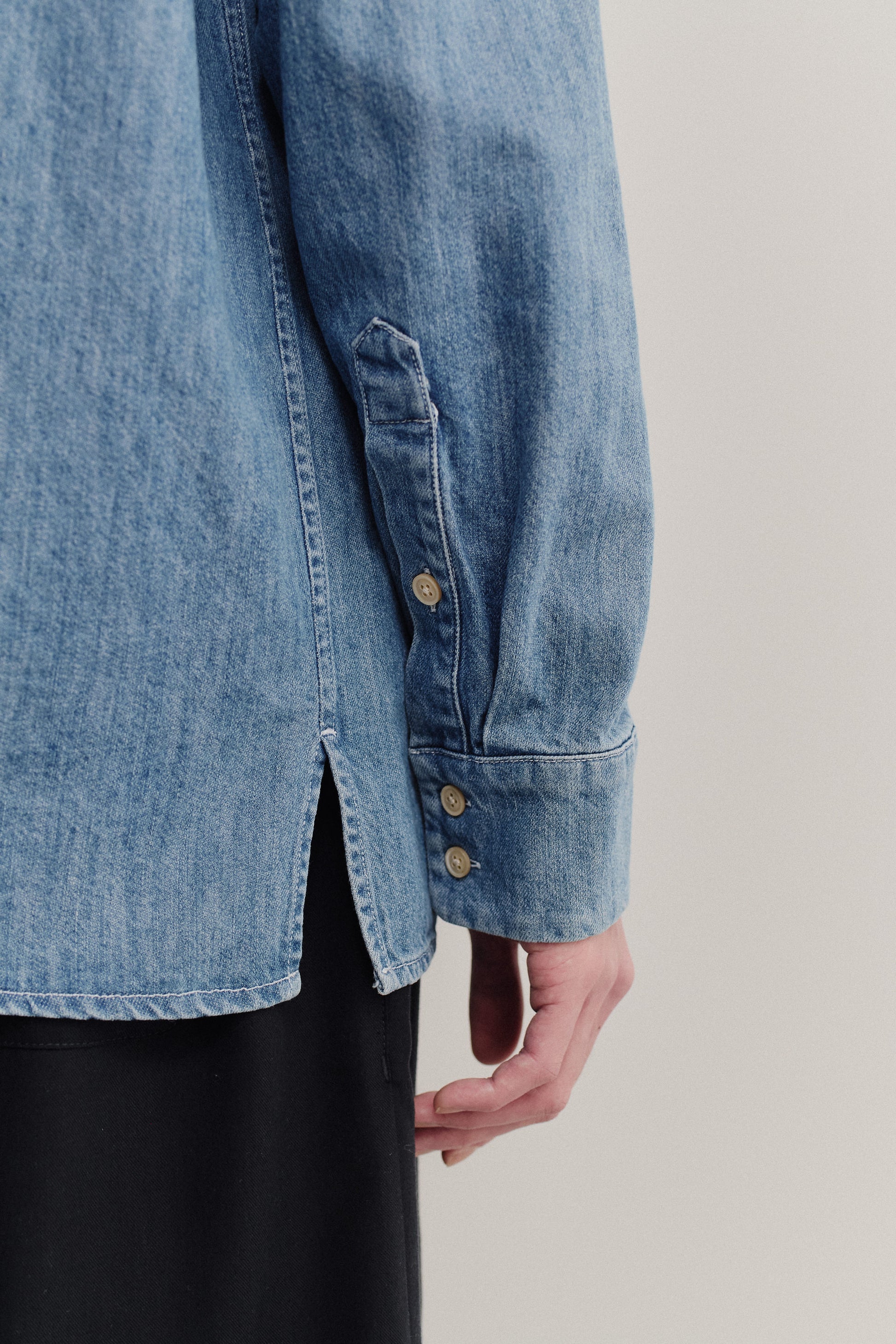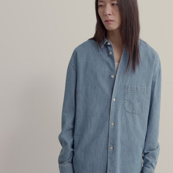 FABRIC: This light blue denim fabric combines organic cotton with the refinement and lightness of silk, offering a warm, natural sheen. The vintage-inspired texture adds character and depth, while its soft hand feel ensures relaxed elegance.