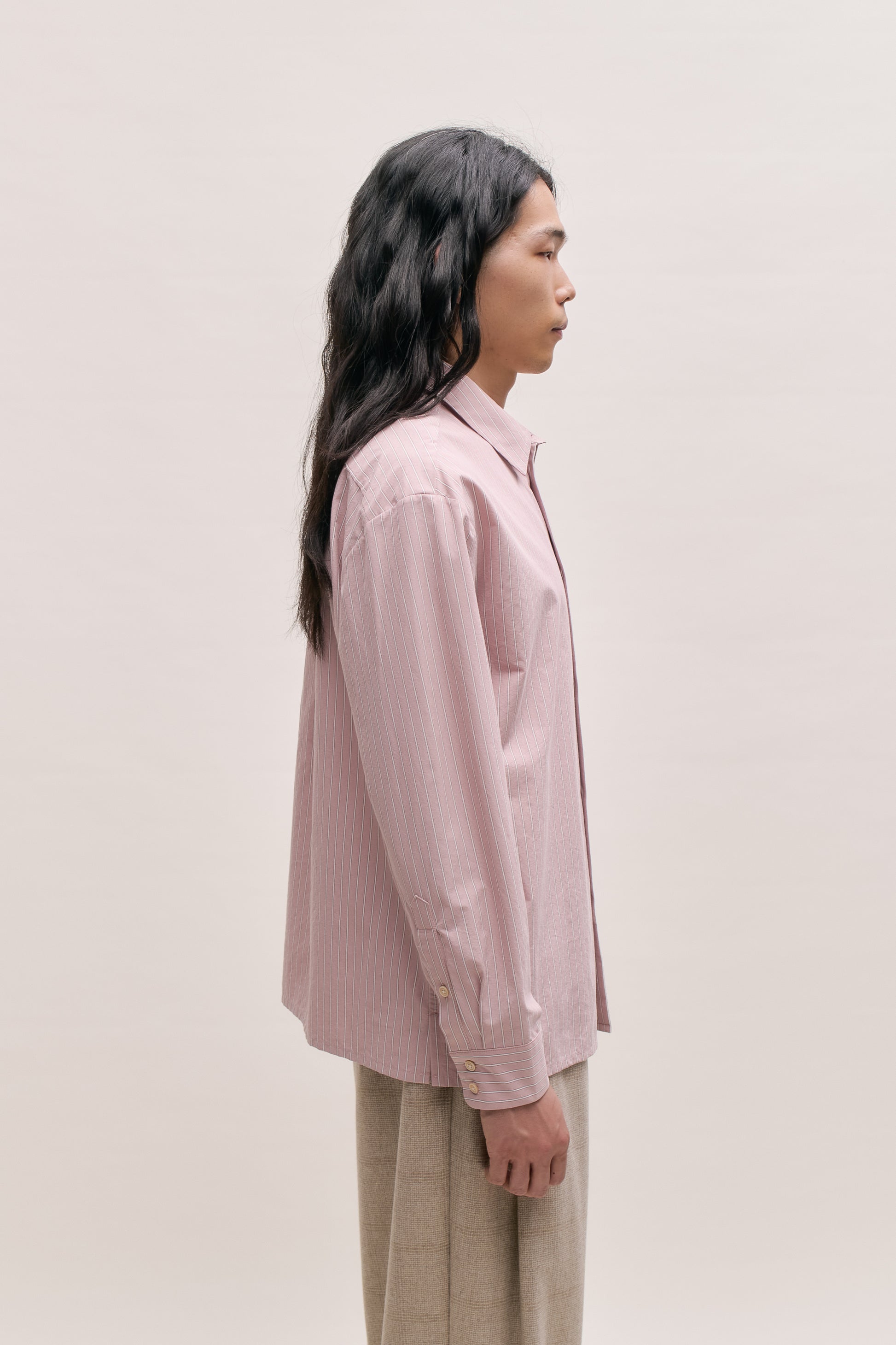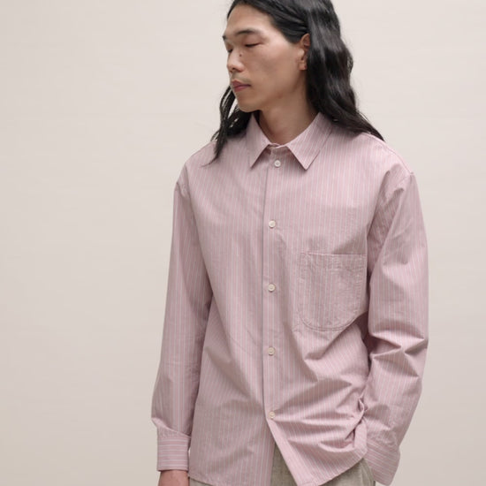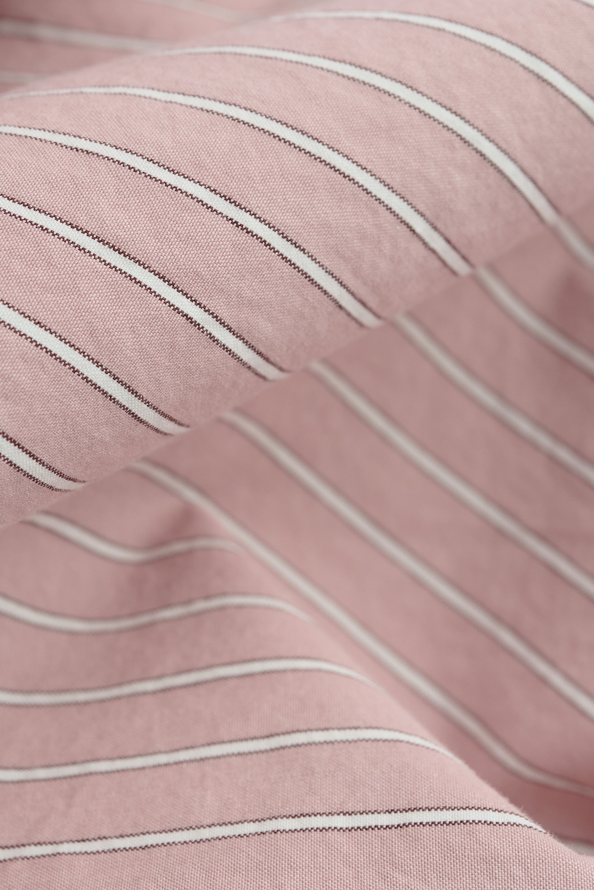 FABRIC: Cotton fabric in a soft rose color with crisp white vertical stripes. Lightweight and breathable, with a smooth texture and a peached finish on the outer side.