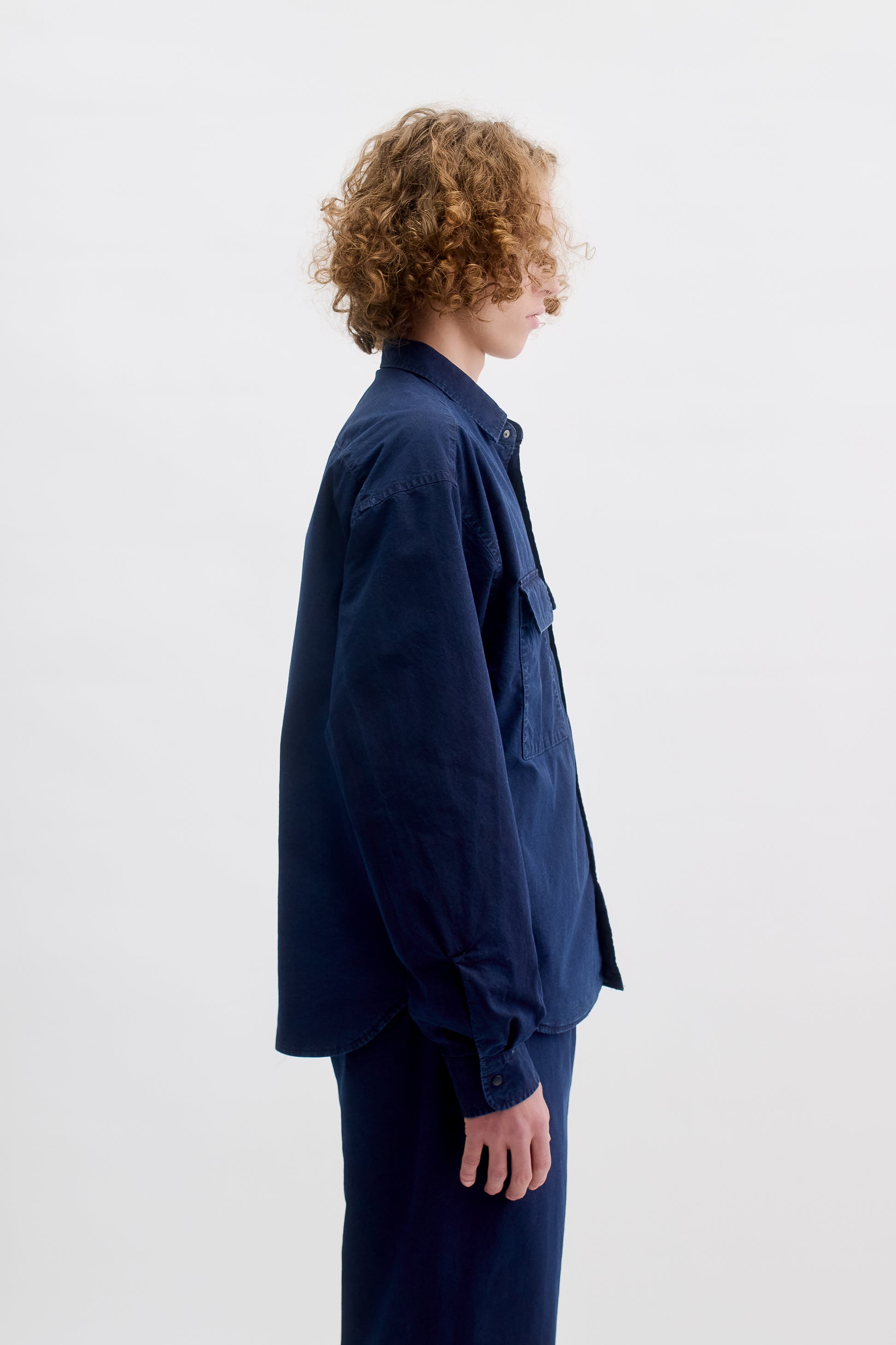 PRODUCT: This AKOG x NANAMICA Padded Shirt is a refined shirt-jacket hybrid that merges softness, warmth, and structure in a relaxed, boxy silhouette. Crafted in Japan, it features overcut shoulders, two oversized patch pockets, and a soft indigo-dyed shell with a subtly washed finish. With its ultra-light PrimaLoft® insulation, it delivers reliable warmth while remaining breathable and lightweight - making it an ideal layering piece for the colder season.