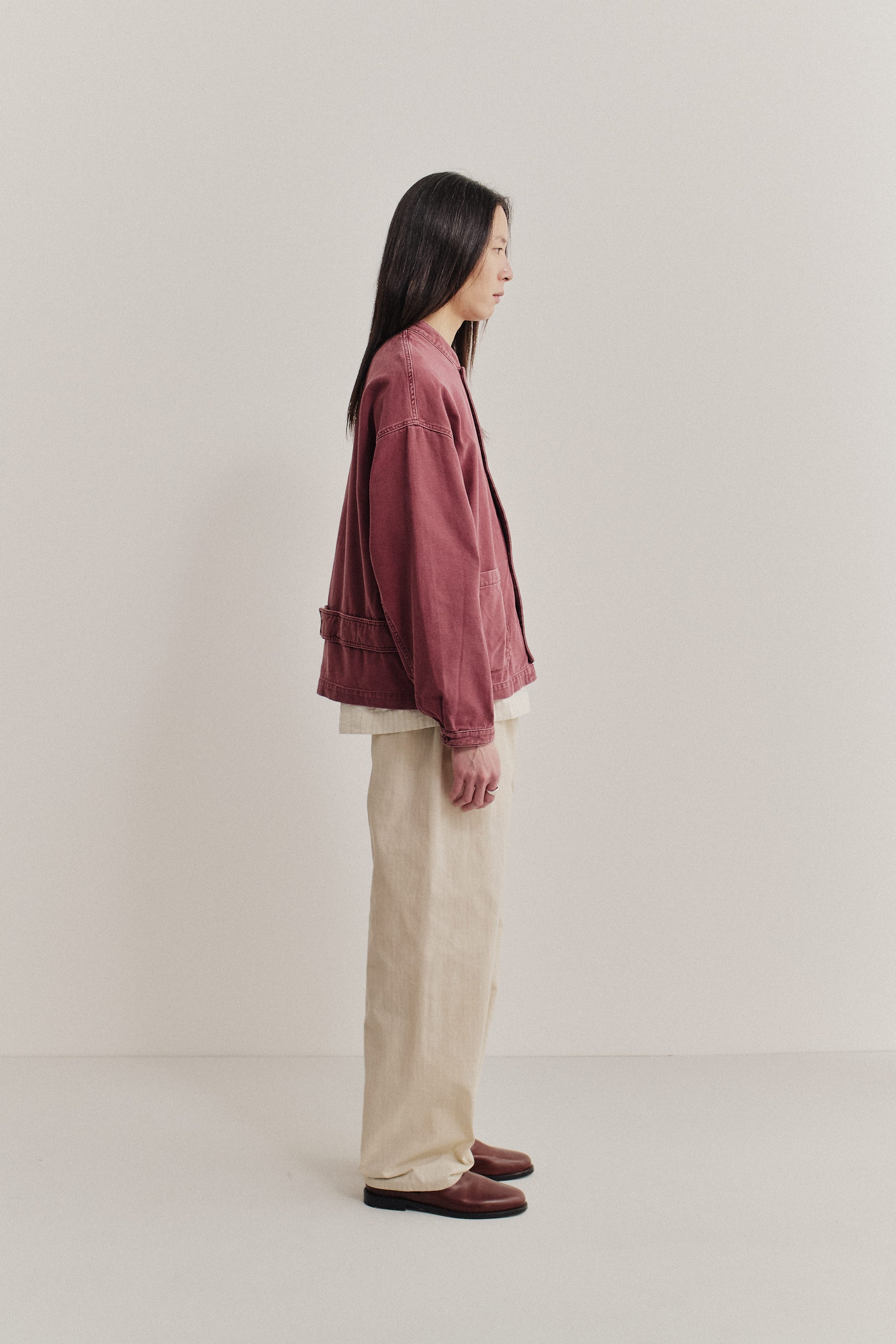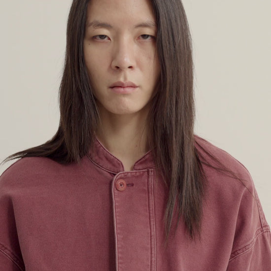 PRODUCT: A returning bestseller, the Jaspal Jacket features a boxy fit, overcut shoulders, a stand-up collar, and spacious front patch pockets. Finishing touches include buttoned cuffs and a back strap detail.